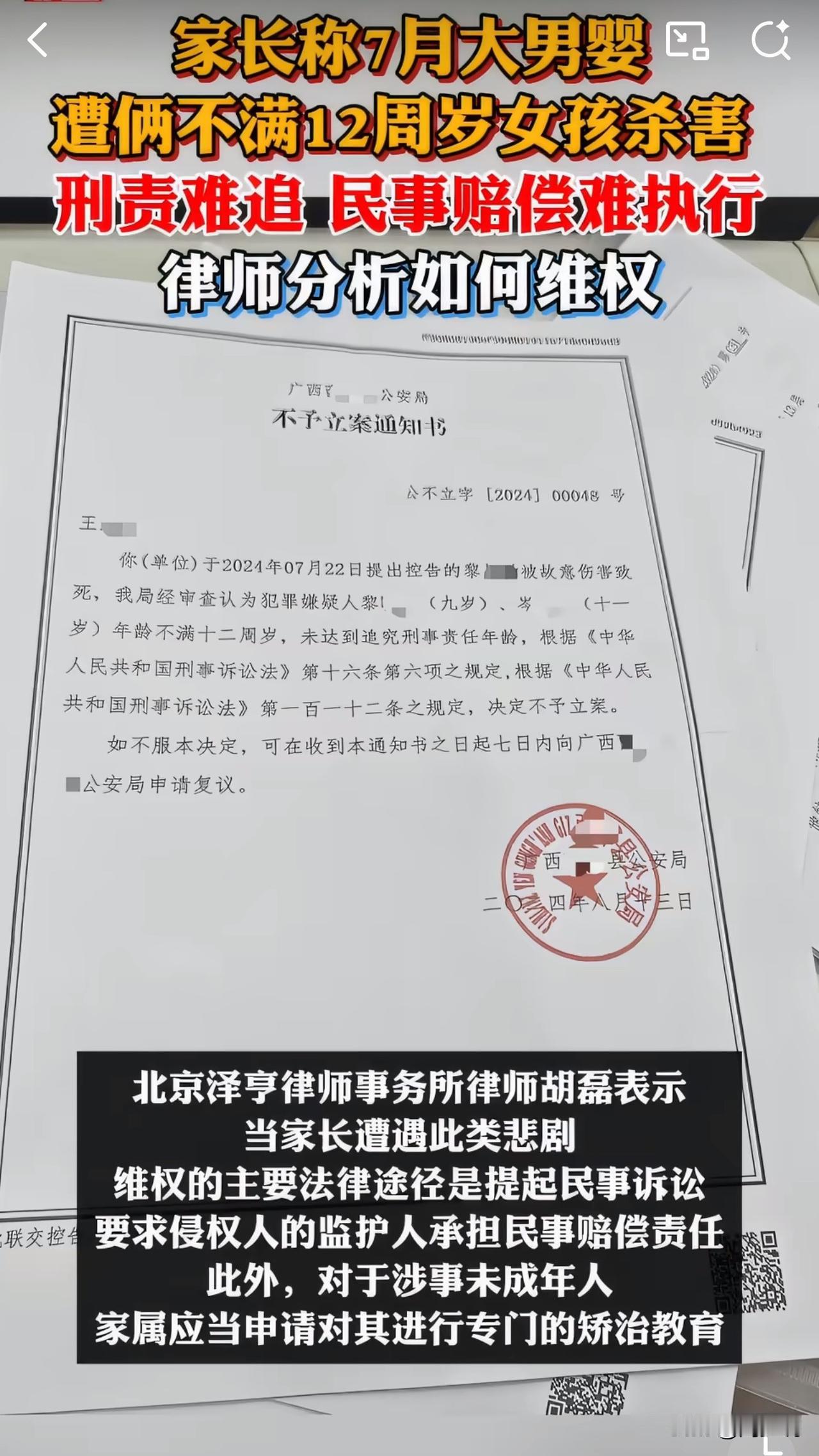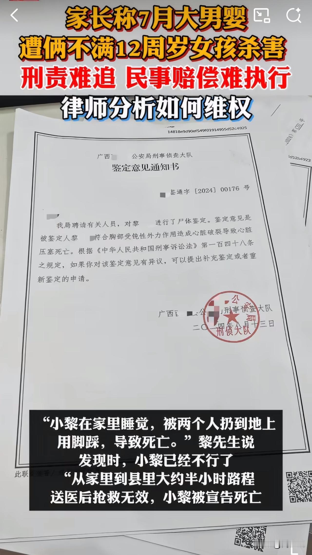 广西百色,7月龄婴儿小黎被11岁和9岁邻居男孩抱走后暴力致死,而两名凶手因未满12岁未被立案,如今竟正常上学!受害者家庭获赔判决成空,引发全网震怒。 据媒体报道,2024年7月,11岁的A和9岁的B以玩耍为由,两次将邻居家小黎抱出屋外。在监控盲区,两人疑似对婴儿施暴,致其胸部受钝性外力破裂死亡。 因未满刑责年龄,警方未立案,仅法院判定其监护人共赔偿90余万元,扣除已付10万后,剩余80余万因监护人无财产可供执行,执行程序终结。 事发后小黎母亲确诊重度抑郁,而两名施害者已重返校园。小黎父亲悲痛表示,与对方无矛盾,只求一个公道,目前已向检察院反映情况。 此事引发不少网友热议,有网友说:“孩子太小不是施暴的借口,一条人命怎能就这么不了了之?” 也有网友称:“正常上学的凶手,是对受害者家庭最残忍的二次伤害!” 还有网友表示:“监护人民事赔偿都赖账,对孩子的教育又能有多少上心?” 其实,周少觉得这起悲剧不仅是一个家庭的痛,更戳中了公众对未成年人犯罪的担忧。未满刑责年龄不代表可以肆意妄为,监护人的失职、后续监管的缺失,都让悲剧有了滋生的土壤。 两名施害者的“免责”,看似符合法律规定,却忽视了生命的重量与家庭的创伤。更令人寒心的是监护人的推诿,既未履行赔偿责任,也难见对孩子的正确引导。 婴儿的生命无法重来,施暴者虽暂免刑责,但更需针对性的矫治教育,而监护人的赔偿责任也不应逃避。唯有让责任落地、让教育到位,才能既抚慰受害者家庭,也守住对生命的敬畏。 总而言之,守护未成年人的同时,更应守住生命底线,让施暴者付出应有代价,让受害者得到慰藉,这才是法律与社会该有的温度。 对于这样的现象,大家有什么好方法和建议呢?#寻美三湘# #长沙新朋友#