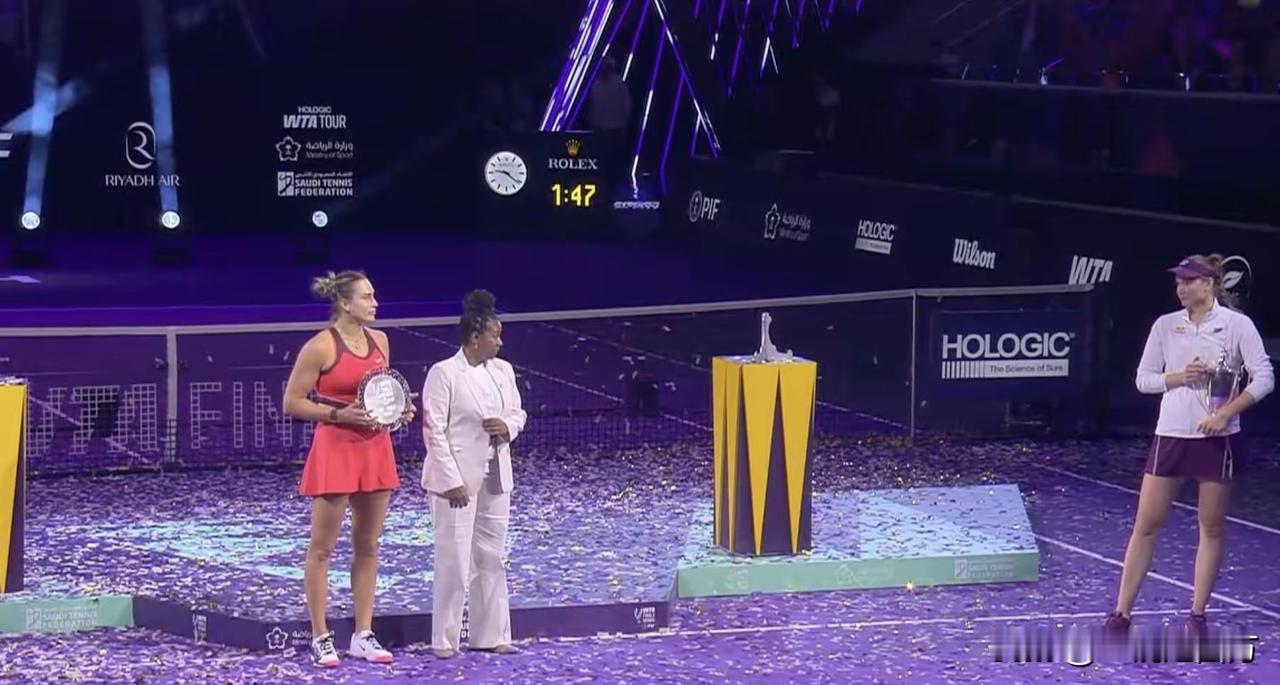 WTA年终总决赛冠亚军争夺战,莱巴金娜以6-3、7-6(0)击败头号种子萨巴伦卡,首度问鼎总决赛冠军,也成为首位获此殊荣的亚洲球员,连胜场次已延续至11场,独享523.5万美元的女子体育史上的最高单笔奖金,即时世界排名从第七升至第五。颁奖仪式上还出现罕见一幕,莱巴金娜拒绝与WTA CEO阿奇合影,或与她曝光了她与教练武科夫的“内幕新闻”有关,这位CEO曾表示莱巴金娜与教练“有一种有毒的关系”,武科夫遭到禁赛一年的处罚。