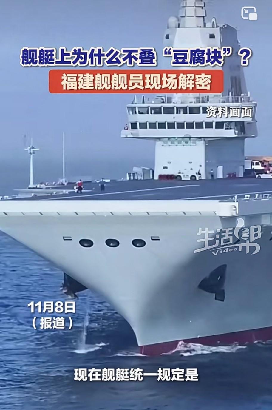 记者探访了福建舰士兵卧室,发现被子都是平铺在床上,已经不是之前的“豆腐块”了。 在我当海军时,都是按照《内务条令》,把被子叠成“豆腐块”。军事行动时,打背包更方便。在军舰上,跟陆地是不一样的,不需要打背包之类的军事动作。平铺更适合军舰生活。