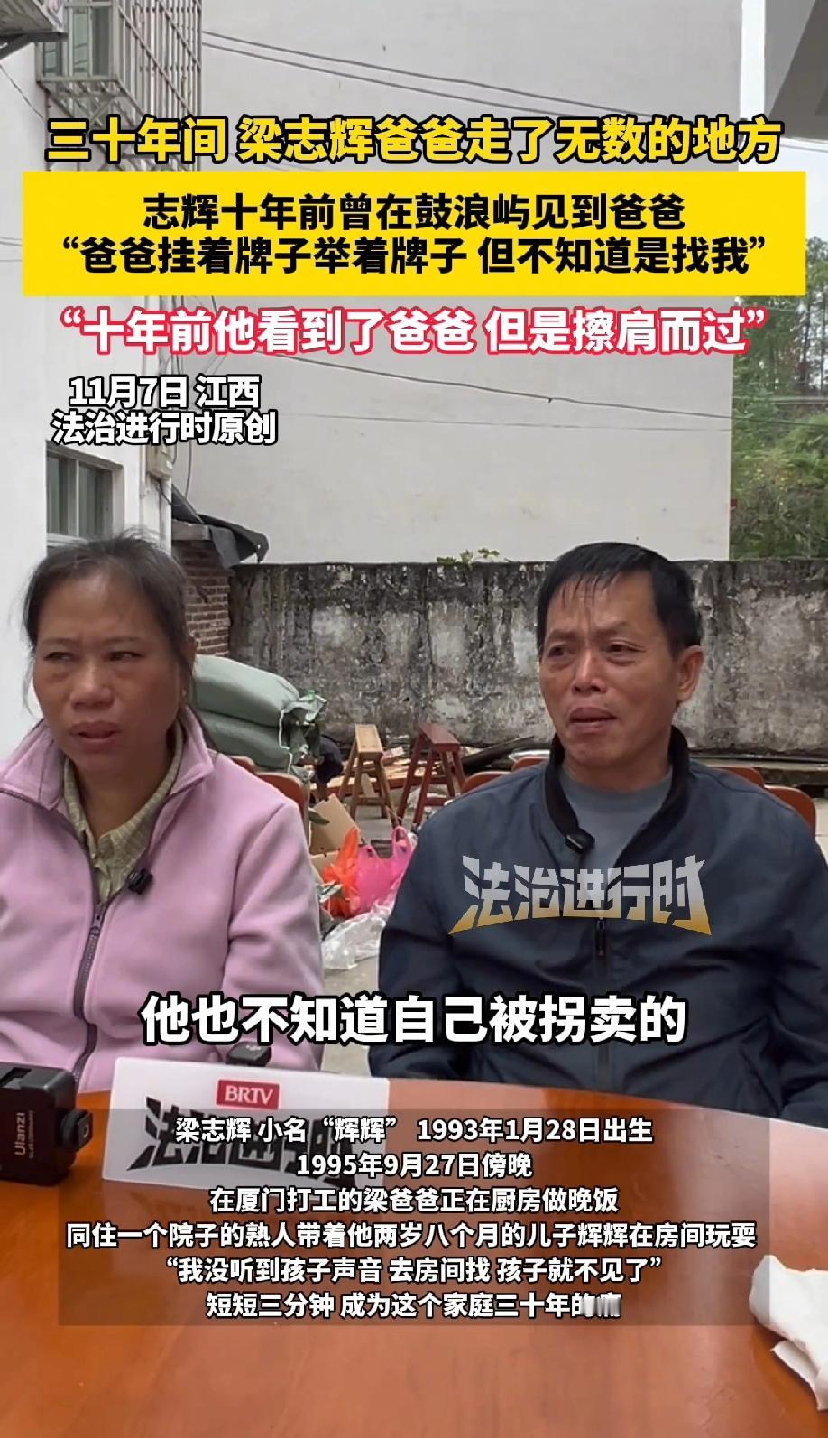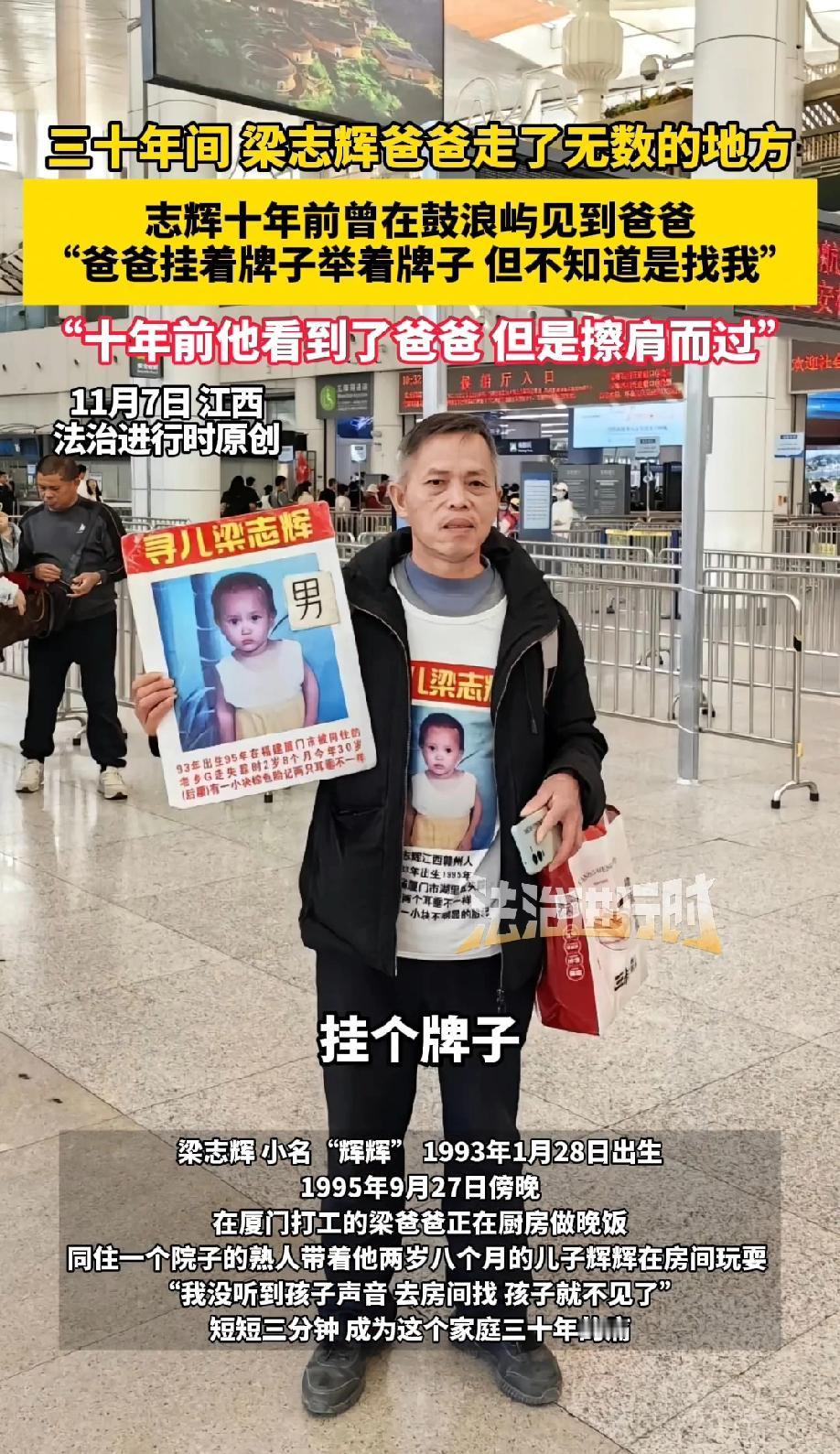 苍天不负有心人!时隔30年,梁三寿夫妇终于找到了被拐卖的儿子梁志辉,30年间,梁三寿走了无数的地方,遗憾的是,梁志辉10年前就在鼓浪屿见过脖子上挂着牌子,手上举着牌子的爸爸,只是当时他并不知道自己是被拐卖的,就这样与爸爸擦肩而过了。好在如今,一家人终于团圆了! 1995年,厦门傍晚,梁三寿正在厨房给加班的妻子和两岁多的儿子辉辉(梁志辉)做晚饭。 同住一个院子的熟人带着辉辉在房间玩耍,可就短短三分钟的功夫,等他听不到孩子笑声进屋查看时,孩子已经没了踪影。 在离家不远的马路上,他们只找到了辉辉丢失的一只鞋,那一刻,夫妻俩知道,孩子被拐走了。 从此,这个原本温馨的家庭,踏上了长达三十年的寻亲之路。 为了省钱找孩子,他们把积蓄花光还欠了债,早餐分吃五毛钱的食物,妻子为了五毛钱加班费熬夜干活。 梁三寿带着寻亲牌,足迹踏遍大半个中国,鞋子磨烂了十几双,晚上睡桥洞、屋檐下,渴了喝沟渠里的水,饿了就啃干馒头,最苦的时候瘦到只有70多斤,为此,他说:“有一个馒头能填饱肚子就很不错了”。 寻亲路上,他们遭遇过抢劫、欺骗,甚至因为打听被拐孩子的消息被村民围攻,可只要想到儿子,就没敢停下脚步。 更让人揪心的是,十年前梁志辉曾在鼓浪屿见过挂着寻亲牌的父亲,可当时他并不知道自己是被拐的,就这样和亲人擦肩而过。 这三十年里,梁三寿不仅找自己的孩子,遇到其他被拐儿童的线索也会伸手帮忙,用他的话说“都是做父母的,见不得孩子受苦”。 爷爷临终前还紧紧拉着他的手,嘱托一定要找回孙子。直到2025年10月,警方通过AI筛选和DNA比对,终于传来了好消息:梁志辉找到了。 消息一出,网友们纷纷破防。 有人说:“三十年啊,人生有几个三十年,父母把半条命都搭进去了”; 也有人心疼:“一个馒头充饥、瘦到70多斤,这苦不是一般人能扛的”; 还有人感慨:“还好没放弃,鼓浪屿的擦肩而过没有成为永远的遗憾”。 不少网友还提到“养父母家条件不错,孩子也成家了,尊重孩子的选择就好”。 在我看来,这场团圆既是奇迹,更是坚持的胜利。梁三寿夫妇用三十年光阴证明,亲情从来不会被距离和时间打败。 他们风餐露宿、忍饥挨饿,哪怕遭遇再多挫折都没放弃,这份执着背后是父母对孩子最深沉的爱。 更难得的是,他们在自己寻亲的同时还不忘帮助他人,这份善良让艰难的寻亲路多了一份温暖。 而警方的技术助力也让我们看到,科技正在为团圆赋能,那些曾经的遗憾正在被慢慢弥补。 如今,梁三寿特意粉刷了老屋,染黑了白发,只为给儿子一个舒服的家。 认亲现场,他为妻子擦去泪水说:“总算给你一个交代”,简单的一句话,藏着三十年的煎熬与期盼。 这场跨越三十年的团圆,不仅圆了一个家庭的梦,更让我们看到亲情的力量。 愿每一条寻亲路都能有终点,愿每一份等待都能有回应,更愿天下无拐,再也没有家庭要经历这样骨肉分离的痛苦。家人闲坐、灯火可亲,是这世间最珍贵的幸福。