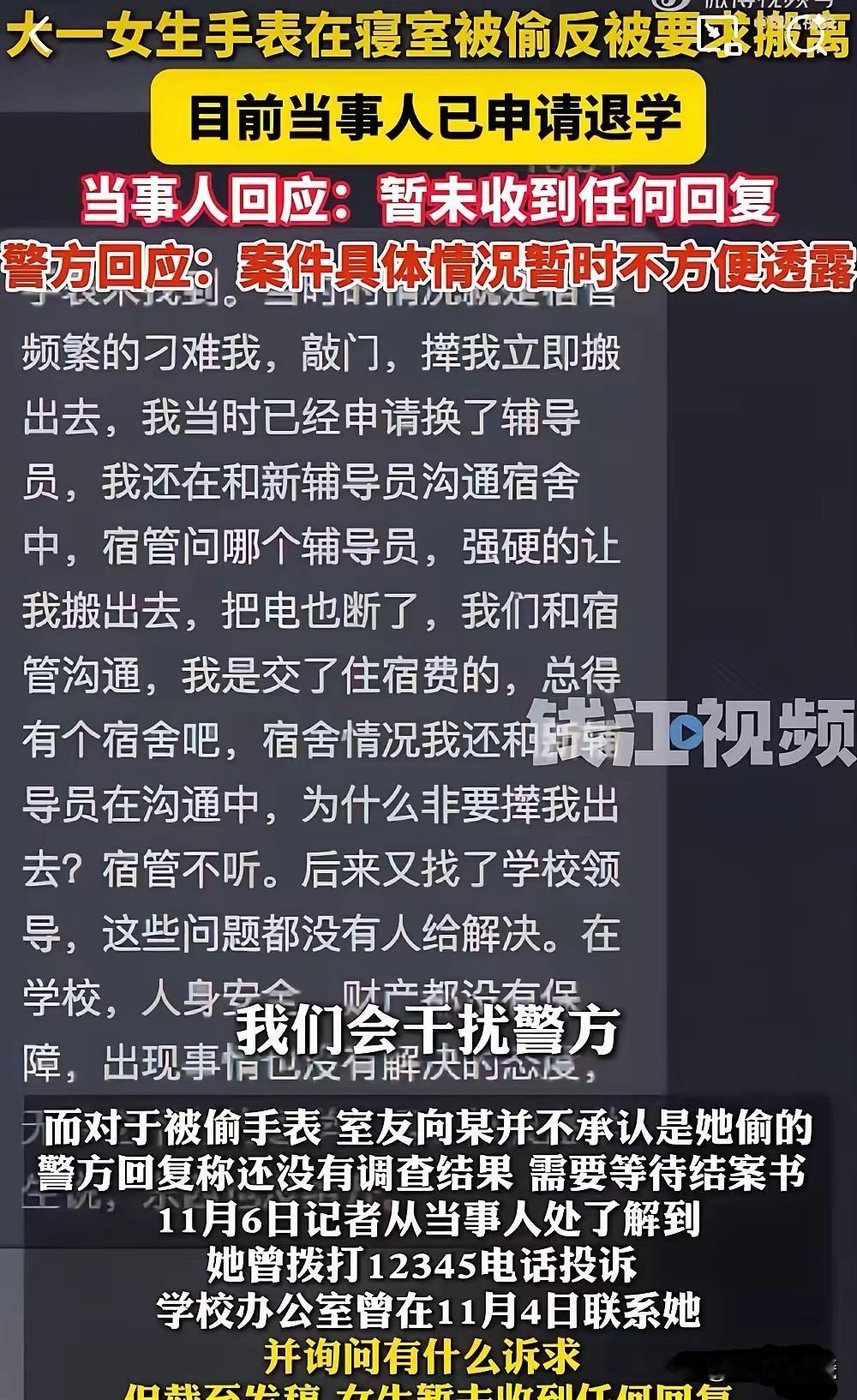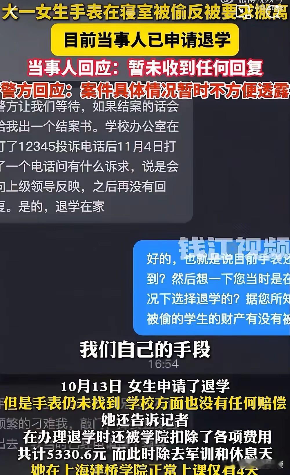 惹众怒! 😡上海建桥学院近日上演令人心寒一幕:大一女生苹果手表在宿舍被盗,通过定位锁定室友向某。令人震惊的是,掌握证据的受害者反成“麻烦制造者”——辅导员不仅阻挠报警,还强制要求女生搬离宿舍。 更离谱的是,仅上课4天的女生最终被迫退学,学校还扣除了5330元费用。有盗窃前科的室友安然无恙,受害者却不得不离开校园,这样的处理方式令人瞠目。 “手表丢了不说,学也上不成了,还要倒贴五千多,这找谁说理去?”不少网友直言校方处理有失公允。目前警方仍在调查,校方称将“依法依规处理”,但当事人至今未获得实质性解决方案。 校园安全不能只是口号! 期待校方能给出公正交代,别让任何一个学生寒心求学路。💪 (消息来源:钱江视频、新浪财经等媒体报道)