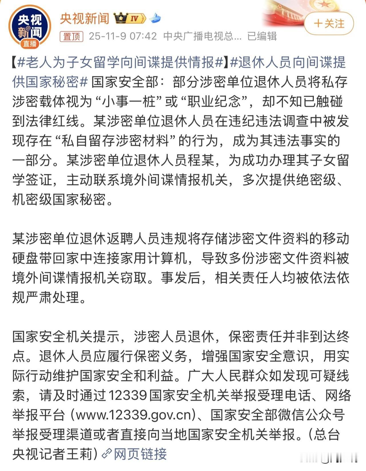 气愤!退休人员为帮子女办留学签证,主动勾结境外间谍,多次泄露绝密、机密级国家秘密!网友:必须重罚! 国家安全部披露,某涉密单位退休人员程某,为顺利办理子女留学签证,竟主动联系境外间谍情报机关,多次提供绝密级、机密级国家秘密。 另有涉密单位退休返聘人员,违规将存储涉密文件的移动硬盘带回家连接家用电脑,导致多份涉密文件被境外间谍窃取。 目前,相关责任人均已被依法依规严肃处理,而部分涉密退休人员仍将私存涉密载体视作“小事”“纪念”,全然不知已触犯法律。 此事引发网友热议,有网友说:“为了子女留学就出卖国家利益,底线呢?必须重罚!” 也有网友称:“退休不是免责符,涉密人员无论在职与否,都得守好国家秘密!” 还有网友表示:“家用电脑风险高,涉密载体绝不能私自带回家!” 看完这事,周少想说确实让人气愤,竟然为了自己的私利,竟然主动多次泄露绝密、机密级国家秘密,活该被依法处理。 当然,这起案件警示我们,国家安全无小事,涉密人员的保密意识一刻不能松懈。退休不是保密责任的终点,私存涉密载体、违规处理涉密材料,看似“不起眼”,实则可能成为境外间谍的可乘之机。 国家利益高于一切,无论出于何种理由,都不能触碰泄露国家秘密的法律红线,守住保密底线,就是守护我们共同的家园。 对于这位老人为子女留学向间谍提供情报,大家怎么看呢?#寻美三湘# #长沙新朋友#