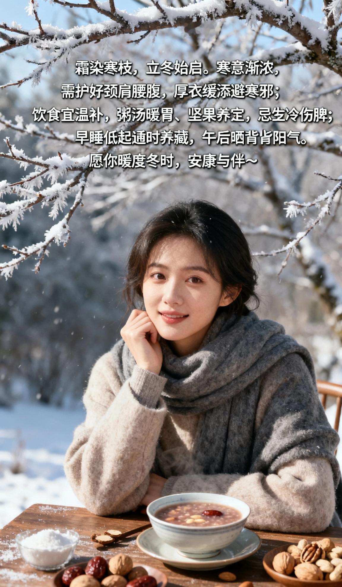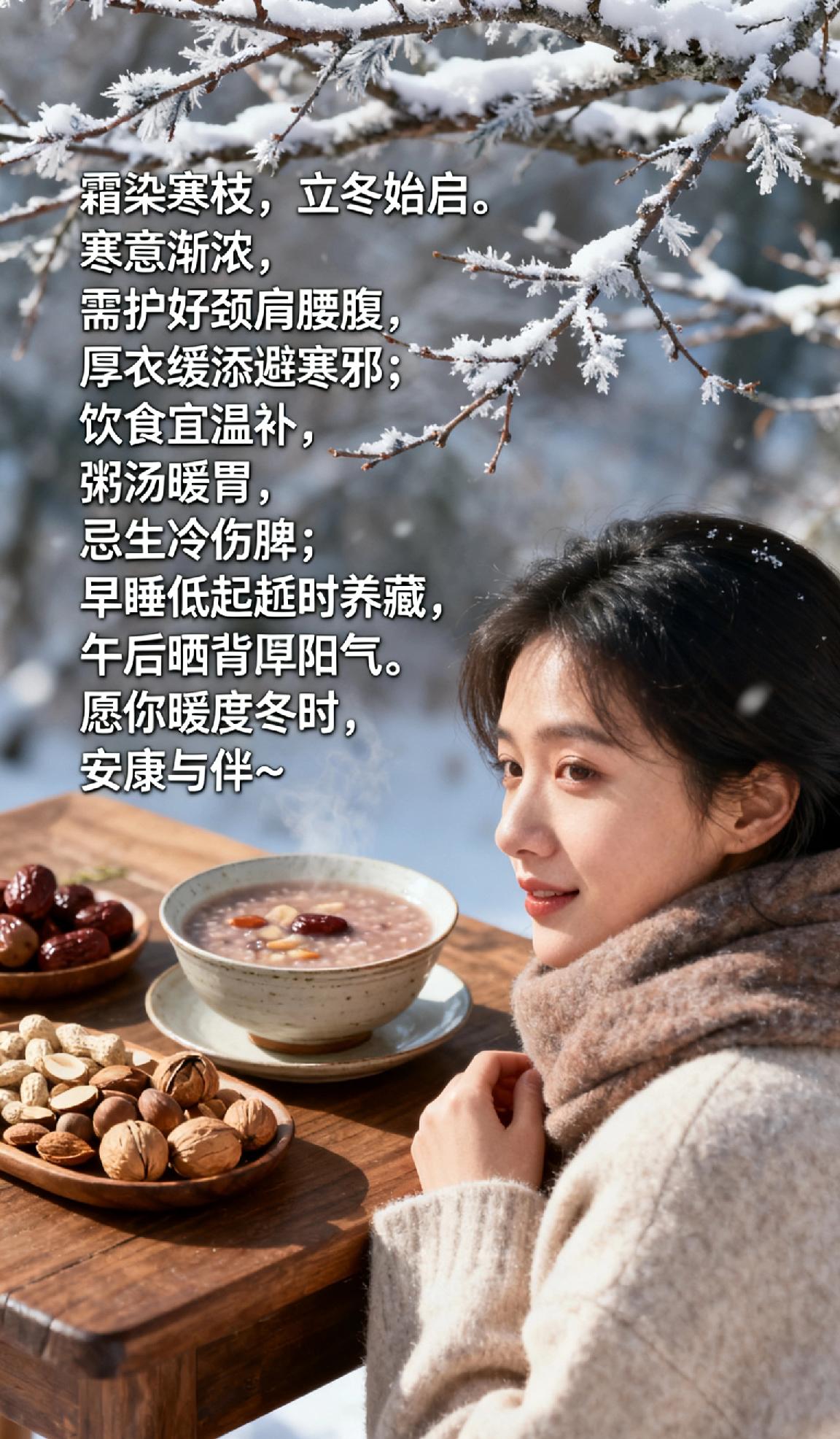 霜染寒枝,立冬始启。寒意渐浓,需护好颈肩腰腹,厚衣缓添避寒邪;饮食宜温补,粥汤暖胃、坚果养身,忌生冷伤脾;早睡晚起顺时养藏,午后晒背补阳气。愿你暖度冬时,安康常伴~立冬感语录 立冬健康常识