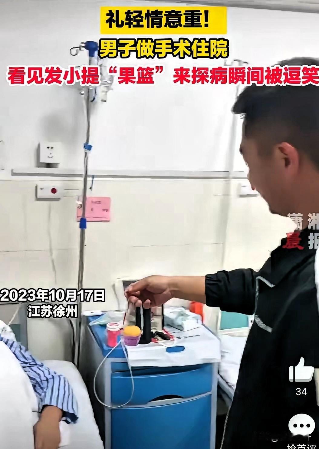男子手术住院,光屁股长大的发小提着果篮前来探望,男子看到果篮,差点没背过气去。 大哥刚做完手术没几天,正躺在床上静养,伤口的痛感让他没心思说笑。就在这时,和他光屁股长大的发小拎着果篮推门而入,本来大哥还挺期待,想着能吃点水果解解馋。结果看清果篮的瞬间,他直接愣住了。 那果篮小得像个装饰品,也就比鸡蛋大一圈,打开一看,里面压根没有琳琅满目的水果,就孤零零躺着一个砂糖橘。这反差直接戳中了大哥的笑点,他当场笑到浑身打颤,吓得赶紧双手死死按住伤口,嘴里还不停念叨着“别崩线别崩线”。 一旁的老婆笑得眼泪都出来了,赶紧掏出手机记录下这搞笑一幕,还打趣发小是不是太抠门。发小却笑着辩解,说大哥术后没胃口,大果篮买了也是浪费,一个砂糖橘刚好开胃,最重要的是能逗他开心,比啥补药都管用。 病房里的病友们看了也跟着哈哈大笑,纷纷夸这发小有心。其实大家都懂,这哪是抠门啊!现在好多探病的果篮看着光鲜,里面水果要么不熟要么不好吃,全是面子工程。而发小的这一个砂糖橘,藏着的是不用客套的真心。 成年人的世界里,客套的关系太多,能毫无顾忌跟你开这种玩笑的人太少。
