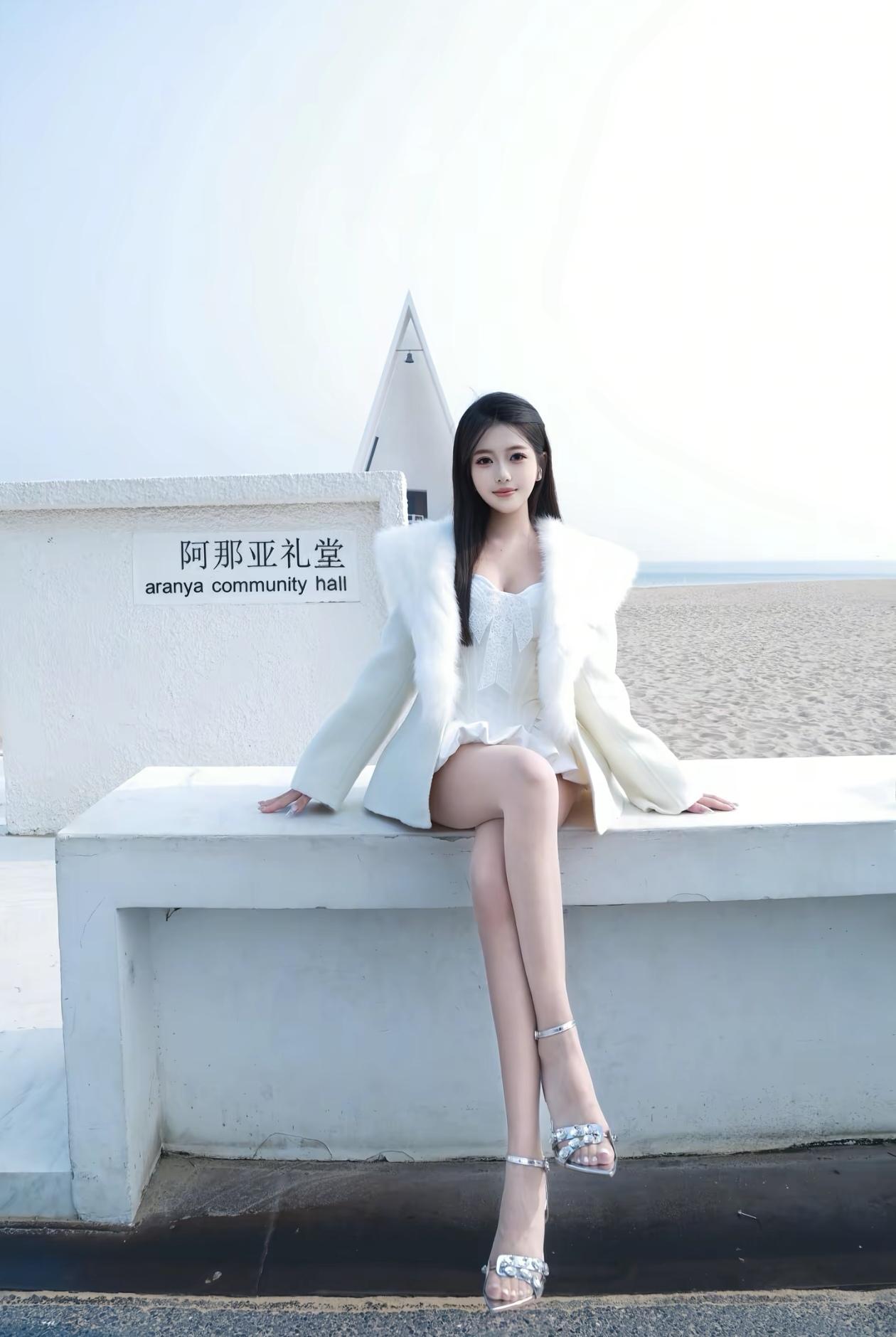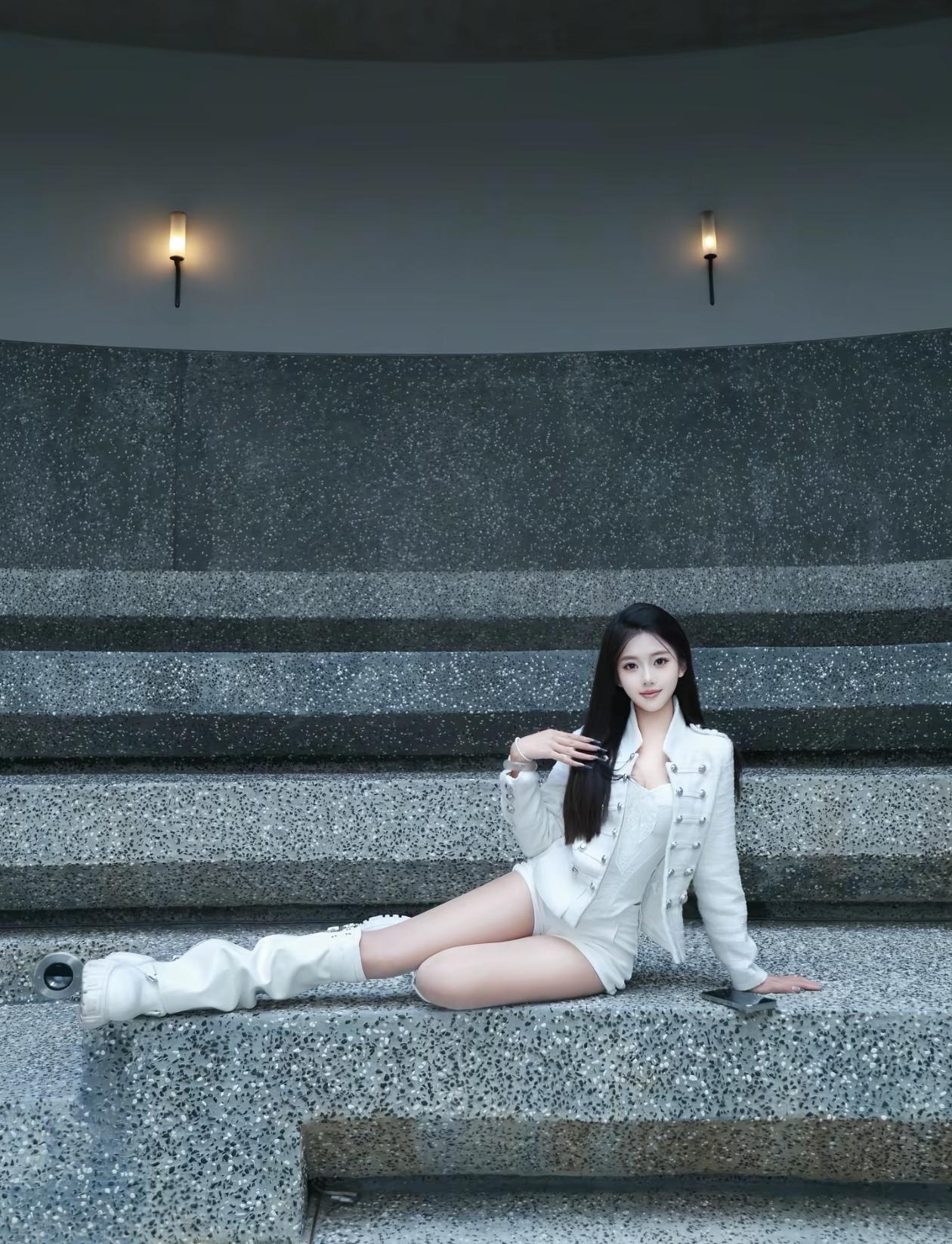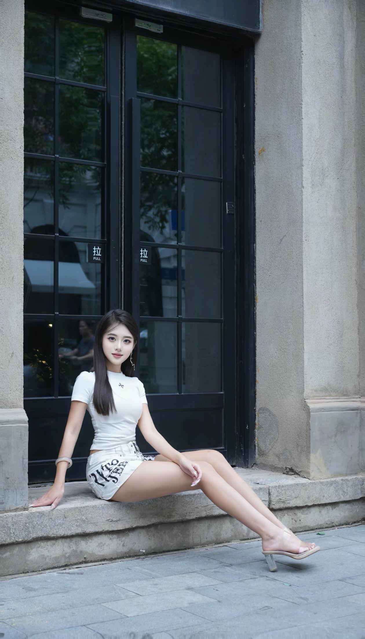 美女坐在门口,穿着时尚。