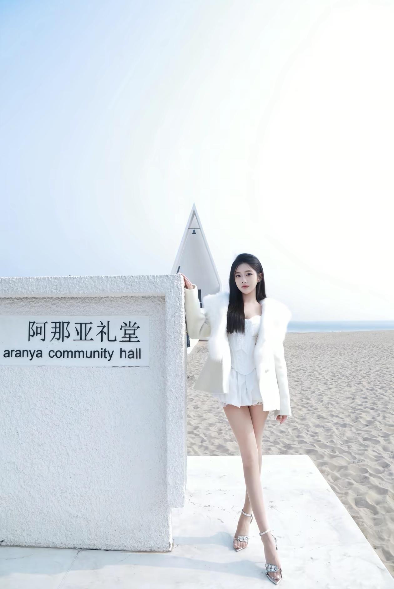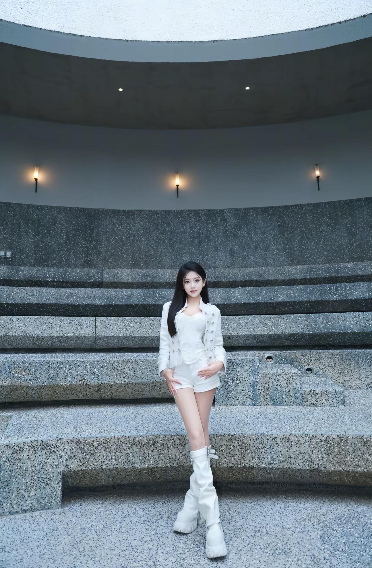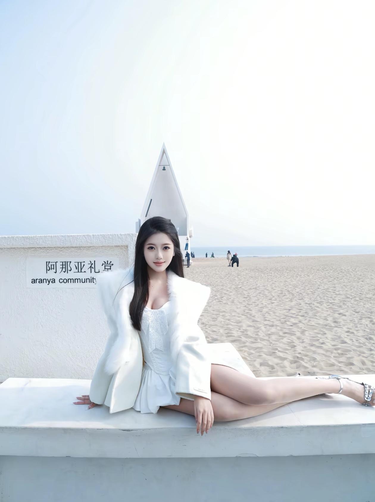 美女坐在门口,穿着时尚。