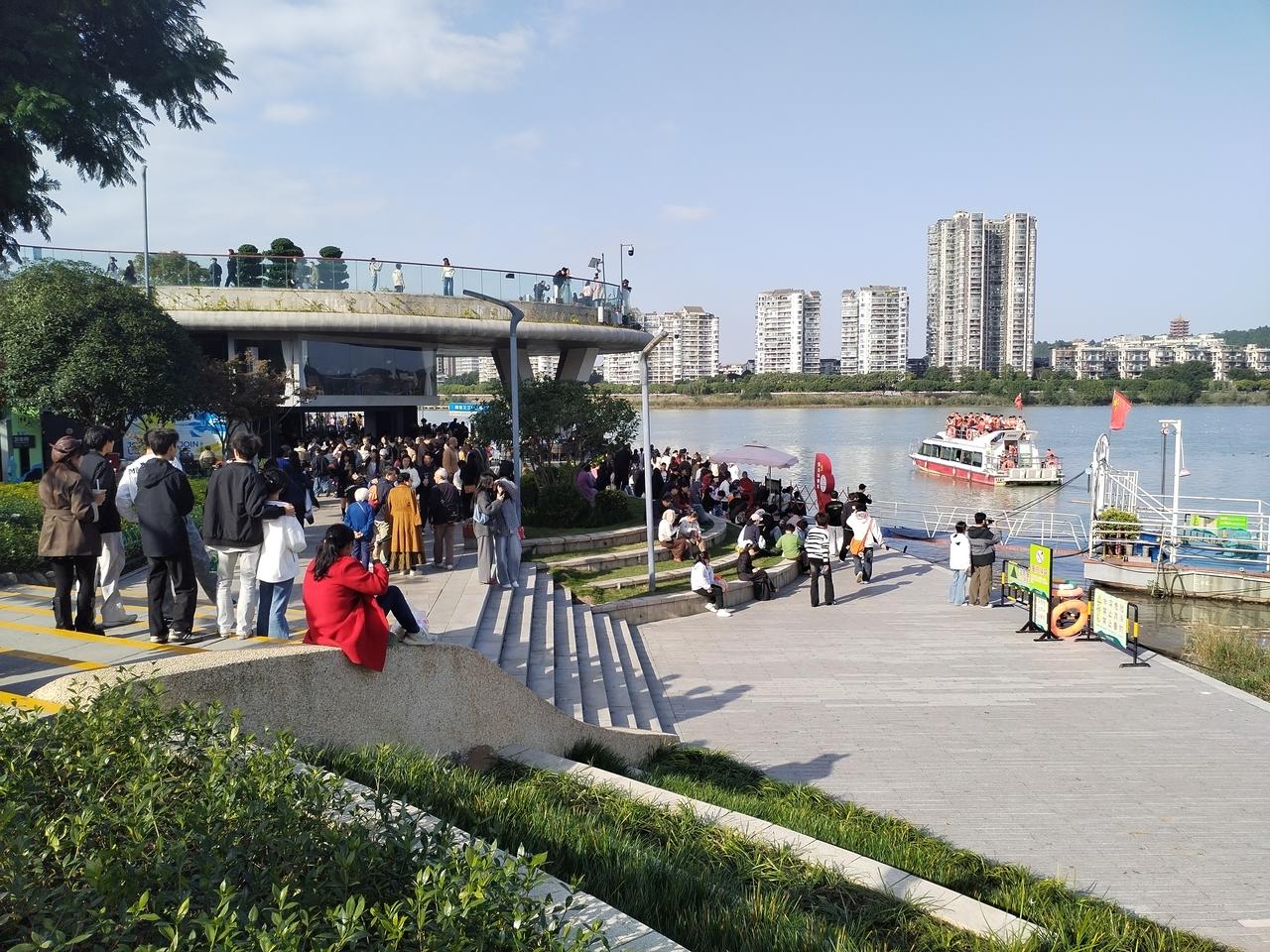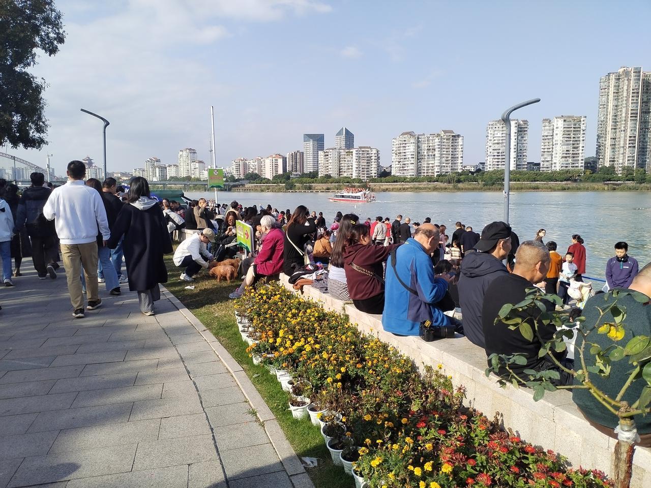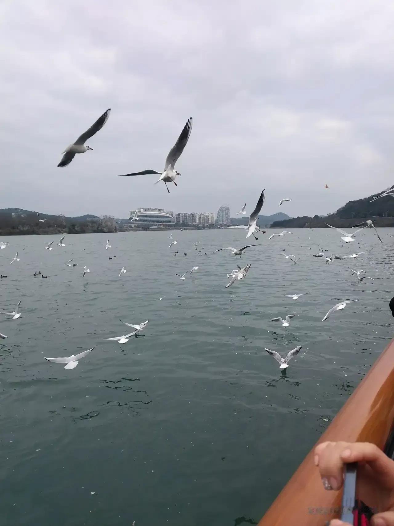 周六,绵阳是个大太阳天,冬日暖阳。今天的绵阳市三江码头公园人山人海,久违了的热闹。 三江码头亲水岸边,人们用手中食物抛向空中,吸引红嘴鸥空中飞翔捉食,有人把食物放在手上,吸引红嘴鸥,并抢拍下瞬间的珍贵照片。 今天的茶馆,小吃摊的生意也非常火,位置难找。人们在温暖的的阳光下品茶享用美食,欣赏着美丽的江滨美景,好安逸。 今天,乘坐游船的人们排起了长长的队伍。乘坐游船江上游玩,即欣赏着涪江两岸风景又能与红嘴鸥嬉戏互动,享受另外一种感受。 周未,艳阳高照,暖意融融。人们用欢声笑语,洗涤风尘,尽情的享受生活。