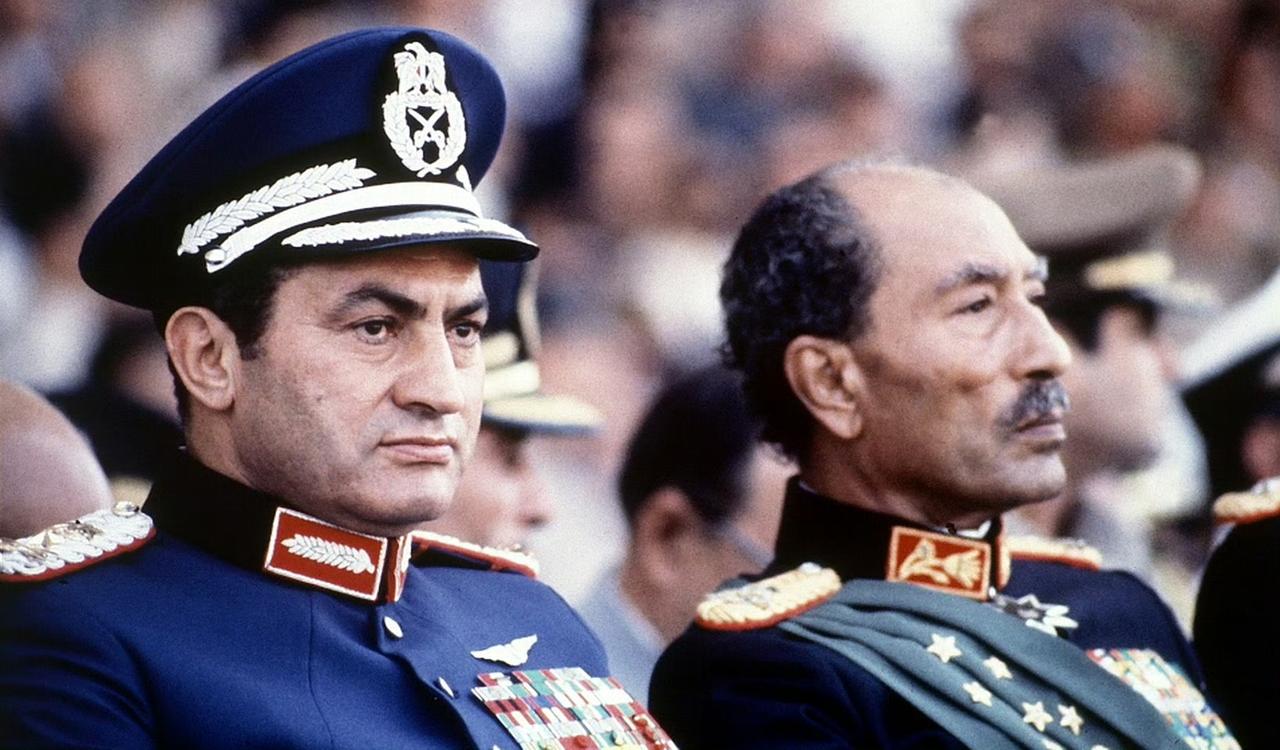 1981年10月6日,埃及首都开罗举行的十月战争8周年阅兵典礼上总统萨达特和穆巴拉克的一张合影,几分钟后萨达特被受检的四名士兵乱抢打死,这次袭击造成10人死亡,28人受伤。