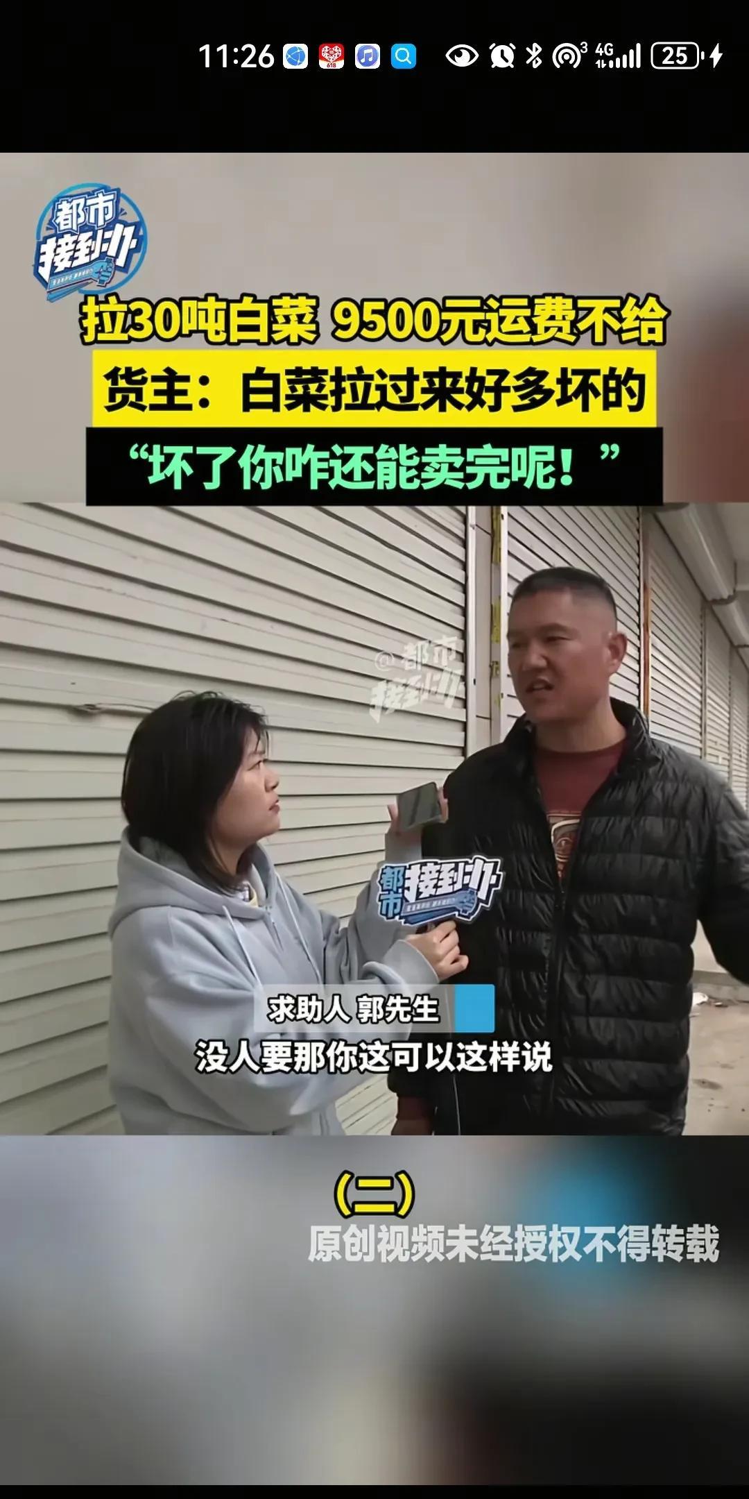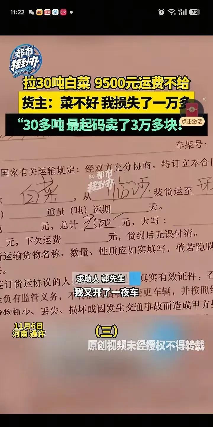 河南通许,男子运了一车30多吨的大白菜,到达货主那里,运费9500元,货主说要卖两天才可以结运费,结果货主卖了4天,一分钱也不给,货主说,大白菜运过来坏了好多,损失10000多元,男子不服气,就问他,白菜坏了很多,怎么能全部卖完了。 郭先生在内蒙古巴彦淖尔临河,接了一单,需要运一车大白菜到河南开封通许,当时运费就已经说好了,大白菜运到目的地,货主卖两天货,就结运费9500元。 当时郭先生是能接受的,毕竟30多吨白菜,如果到了目的地,卸下来再卖,白菜外表多少会有所损害,并且白菜卸下来费时也费力。 一切谈妥,白菜也装上货车了,郭先生就赶紧出发。毕竟这是一车大白菜,时间就是金钱,如果在路上一耽搁,时间一长,白菜的外表可能就会有些坏,他便日夜兼程。 大白菜是新鲜农作品,郭先生运这一车大白菜还是蛮开心的,因为可以走绿通,可以省下一大笔钱,他就想着赶紧把大白菜运到货主那里,拿到钱才踏实。 这一赶路,可把郭先生给累坏了,有一个晚上他是通宵跑车的,只休息了两个小时,到货的那一天晚上,他也是连夜赶车,在晚上11点多,把大白菜运到了货主这里。 货主看到那一车大白菜,来的正是时候,他需要一大早就将白菜批发给别人,一切如同装货前所说那样,货主跟郭先生说,他卖两天货就结运费。 郭先生也没有将此事放在心上,毕竟在出发前,就已经约定好的事情,他正好可以休息两天,他已经通宵了一晚上,来到货主这里,又已经是深夜了,他也扛不住了,他找了个地方,倒头就睡。 一休息就休息了两天,他也是时候来找货主要运费了。 可他来到他的货车前,他看到货车上还有大白菜,估计要运费有困难了。 果然郭先生开口问货主要运费,货主真的以大白菜还没有卖完为由,然后就跟郭先生说,等大白菜卖完之后再给运费。 郭先生跑了那么久的货车,可不吃这一套,谁知道这个货主什么时候卖完白菜,等他卖完,又有别的借口了,他坚决要货主给运费,结果货主还真不给运费了。 郭先生早就想到这一出,于是就报了警,民警过来之后,这个货主又承诺了,再卖一天,然后就结运费。 一看货主是这种态度,郭先生虽然内心不舒服,但也只好再等一天。 可是第4天,货主把大白菜卖完了,依旧没有结运费给郭先生,郭先生这一次是忍不住了,坚决要货主给运费。 货主看着郭先生不放他走,就跟郭先生说,让他侄子来结运费,他打了个电话给他侄子,让郭先生等几分钟。 这几分钟郭先生当然能等得起,就相信了货主的话,结果就在那几分钟,这个货主趁着郭先生不注意,竟然逃跑了。 货主把大白菜卖完了,人跑了,郭先生这下要不回运费了,无奈之下他才找了调解员。 在调解员的帮忙下,他们联系上了货主,面对为何不给运费的质问,货主居然说,白菜运过来的时候有很多是坏的,他损失10000多元。 郭先生一听,瞬间就气愤了,如果大白菜是坏的,货主怎么可能把全部的大白菜卖完。 他也反问了货主,货主无话可说,最后货主才愿意协商这运费该怎么给,最后只愿意给一半, 辛辛苦苦跋涉了那么长的路,又熬了夜,最后运费只给一半,油钱都不够,郭先生想起这心酸事,他真的很难受,他要起诉货主。 那么遇到这样的事,郭先生该怎么办呢? 首先,郭先生在运货之前,就已经和货主构成了合同关系,约定好运费是在卖货两天之后结,那么货主就应当履行自己的义务。 《民法典》第509条规定:当事人应当按照约定全面履行自己的义务;当事人应当遵循诚信原则,根据合同的性质、目的和交易习惯履行通知、协助、保密等义务。 可是货主卖了两天货,找借口,不结运费,他就是不想履行自己的义务。 其次,如果货主不愿结运费,那么货主的行为就是违约行为。 《民法典》第577条规定:当事人一方不履行合同义务或者履行合同义务不符合约定的,应当承担继续履行、采取补救措施或者赔偿损失等违约责任。 现在货主要继续履行违约责任,否则他的行为就是违法的,是强拿硬要的行为,所以货主得付钱。 那么你对货主的行为有何看法呢?#头号创作者激励计划#