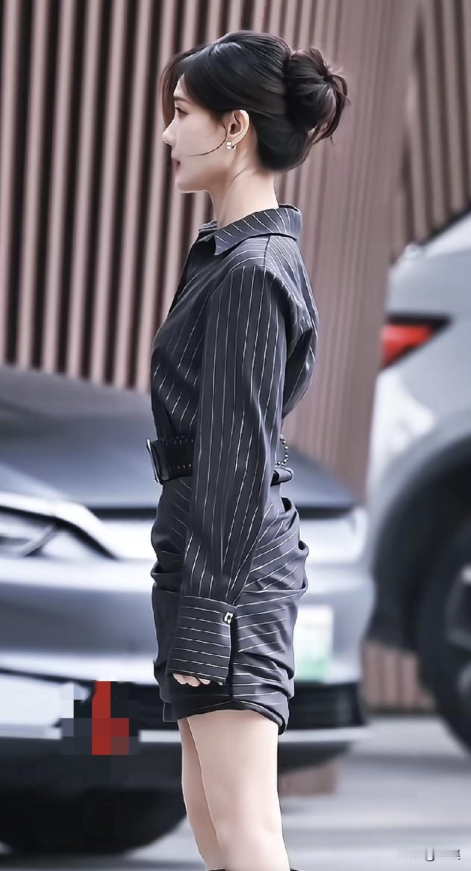 李一桐高丸子头,身穿深色条纹衬衫裙,丸子头清爽利落