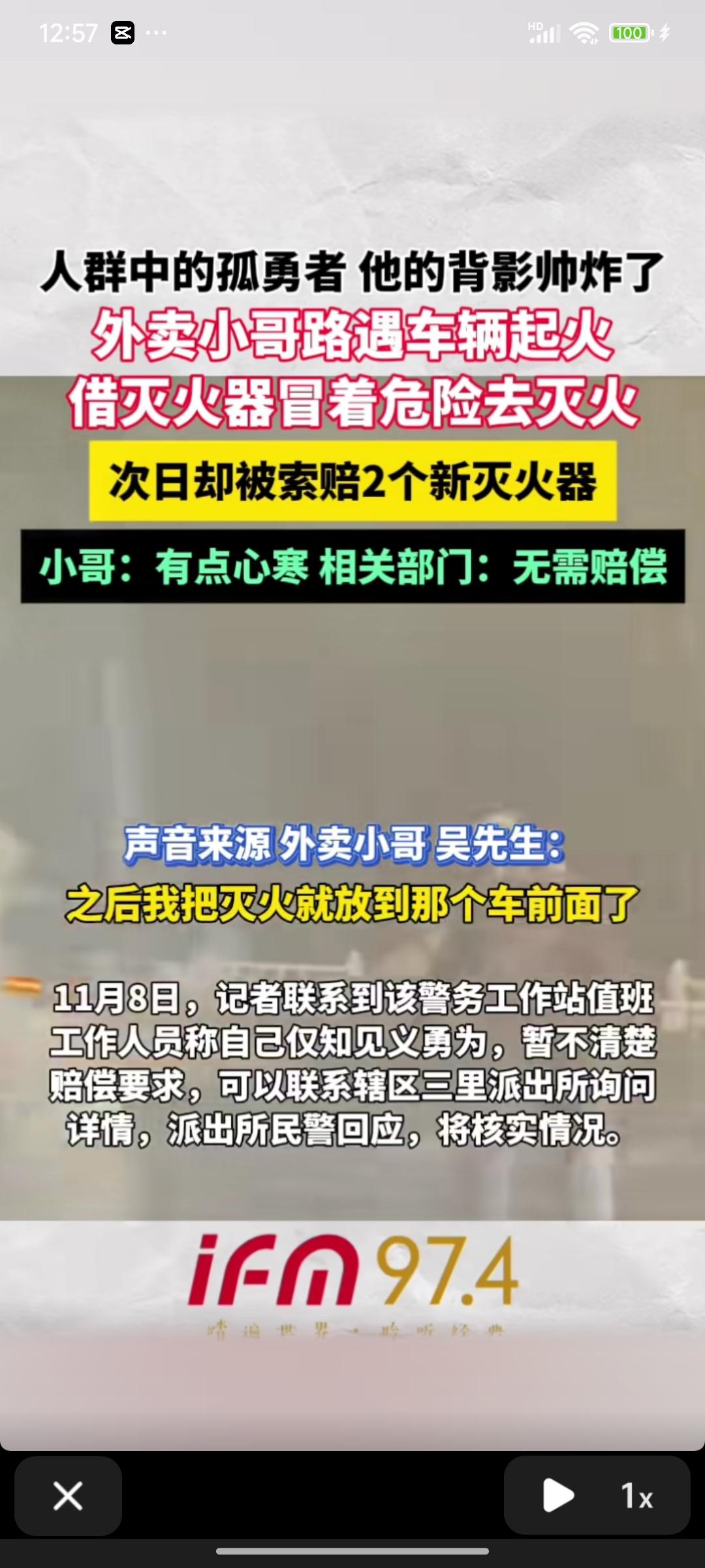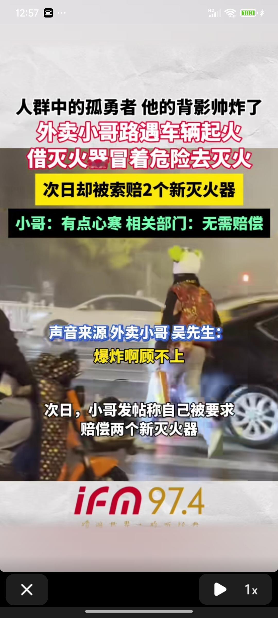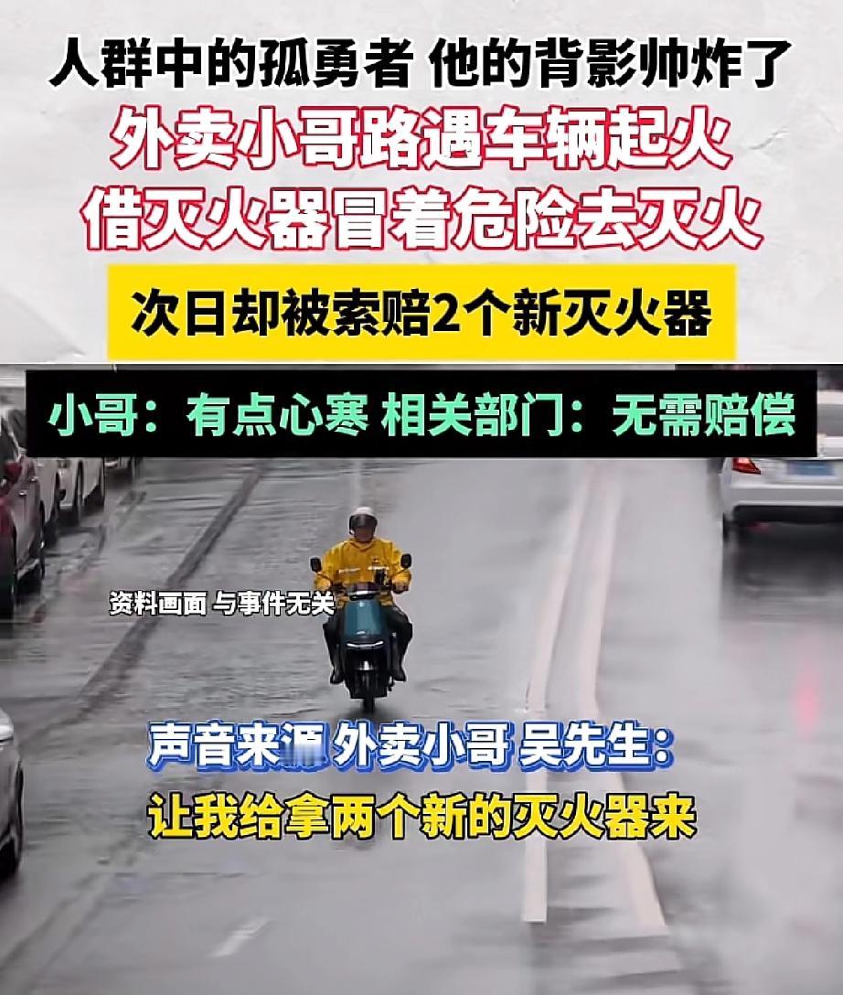 山东泰安,送外卖的小伙看到商场附近停放的一辆汽车自燃,迅速跑到附近警卫室借了两个灭火器,又匆忙跑向起火汽车。他不顾汽车可能爆炸的危险,打开灭火器灭火。 彼时,许多人在远处围观,看着小伙在汽车旁灭火。 火灭了,消防车赶到,小伙将灭火器放在汽车前方,便急着去送外卖了。 次日,小伙接到电话,被要求归还,或是赔偿两个新的灭火器。 小伙诧异道:“灭火器就放在汽车前面,是不是被消防收走了?” 为寻找这两个灭火器,小伙先去了警卫室,又前往消防部门,一天都没送外卖,却仍不见灭火器踪影。 或许灭火器被人当作废品捡走了? 手提式干粉灭火器一般重1kg - 8kg,价格几十元到一百多元不等;若为手提式二氧化碳灭火器,价格则在几十元到三百多元不等。 警卫室回应此事称:只知小伙见义勇为,不知赔偿要求,具体情况需问派出所。 派出所民警回应:将核实情况。 目前已回复小伙:无需赔偿。 小伙不顾个人安危、勇敢灭火的行为令人赞叹,也该受到奖励! 或许是因助人后心情愉悦,又忙于工作,他匆匆离开,忘了归还用完的灭火器。 倘若当时归还了,后续就不会有讨要灭火器的说法了。 要知道,灭火器如果无故丢失,会有人向工作人员问责。 两个灭火器失踪,又被要求赔偿一事,让小伙感到心寒。 网友安慰他:“你拎着灭火器奔跑的样子很帅。” 网友竖起大拇指称赞:“你是人群中的孤勇者。” 火焰无情,人间有爱! 希望小伙不要伤心,你危急时刻挺身而出,用果断的援手为车辆灭火、化解险情,没有让路人和其他车辆受伤,这份见义勇为的勇气与担当,是寒日里最暖的光,值得所有人敬佩! 来源:江西旅游广播