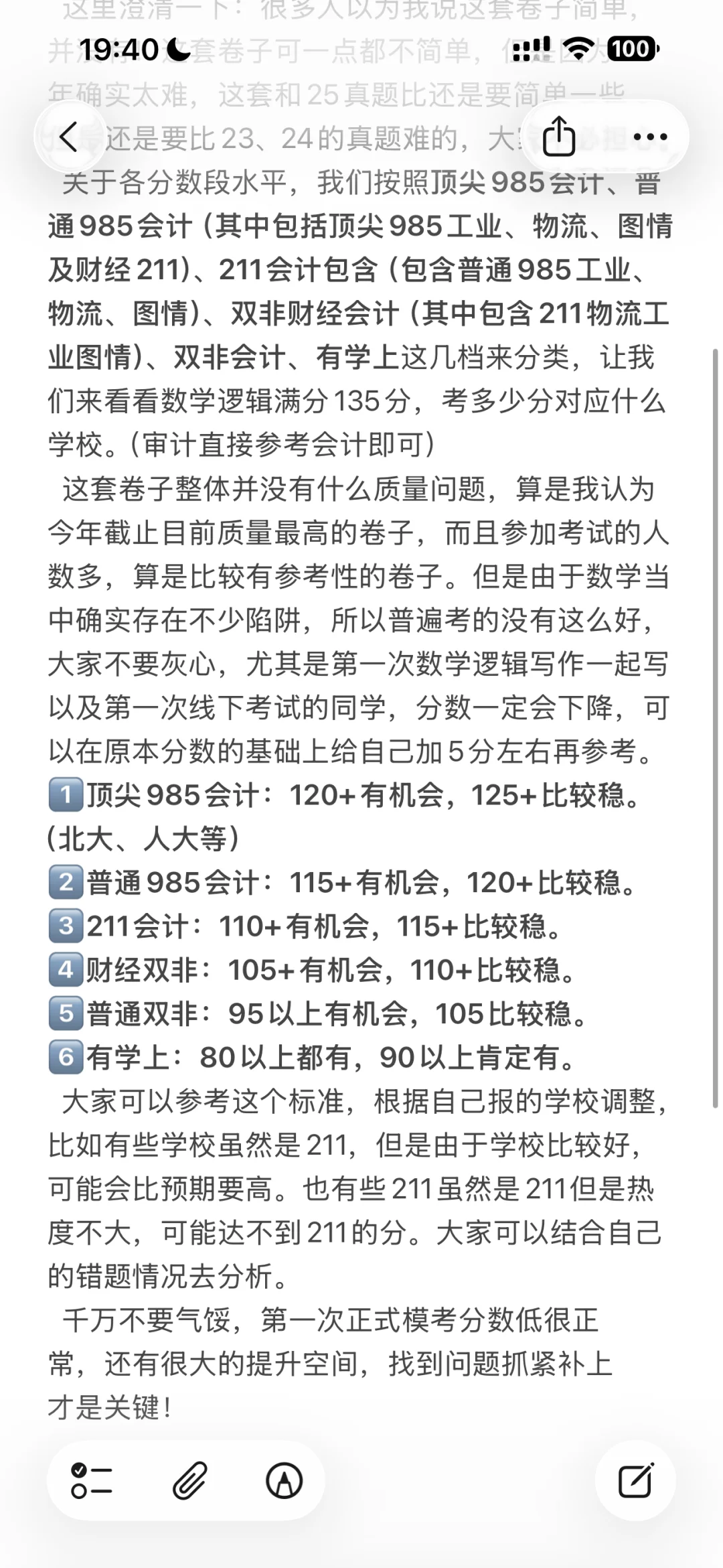 1️⃣顶尖985会计:120+有机会,125+比较稳。(北大、人大等) 2️⃣普通985会计:115+有机会,120+比较稳。 3️⃣211会计:110+有机会,115+比较稳。 4️⃣财经双非:105+有机会,110+比较稳。 5️⃣普通双非:95以上有机会,105比较稳。 6️⃣有学上:80以上都有,90以上肯定有。