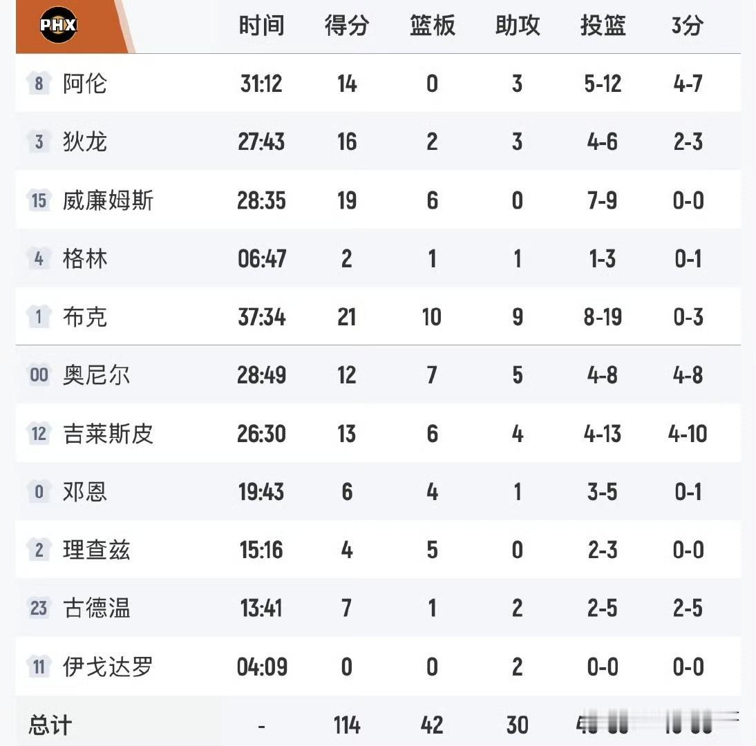 泰伦-卢帅位不保!!!格林伤退,布克准三双,太阳送快船四连败! 快船今天坐镇主场迎战菲尼克斯太阳队,本场比赛哈登出战,狄龙也回来了,伦纳德还需要继续缺席一段时间,快船今天还是没什么悬念,常规性拉垮的节奏,最终103-114不敌太阳,遭遇四连败。 本场比赛双方都有些坏消息,快船方面,哈登手感不佳但是送出了13次助攻,这是他本场比赛唯一能拿得出手的;比尔也发挥一般,最好的还是祖巴茨,真的是可惜祖巴茨这么优秀的中锋了。 太阳方面,杰伦-格林又伤了,布克则贡献21分10篮板9助攻的准三双数据,而且共计有6人得分上双。 卢指导这场比赛表现也太差劲了,该叫暂停也不叫,太阳直接一波拉开分差,而且目前快船的阵容也没有什么希望,卢指导可能要背锅了。 快船 快船队 布克 泰伦卢