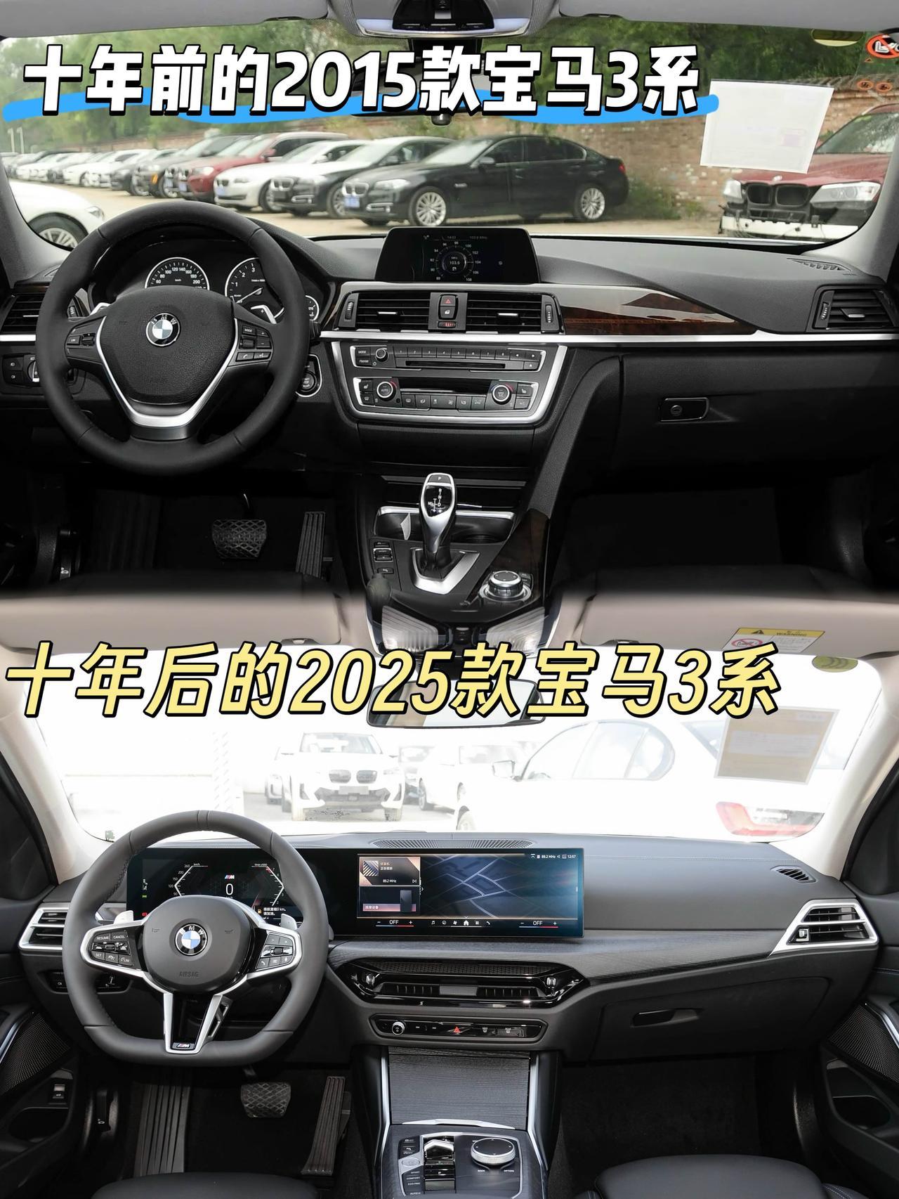 上图是十年前的2015款宝马3系 下图是十年后的2025款宝马3系 其实单论设计感 十年后的2025款是退步的 双联屏整体在内饰中是比较突兀的 5系如此 X5也是如此