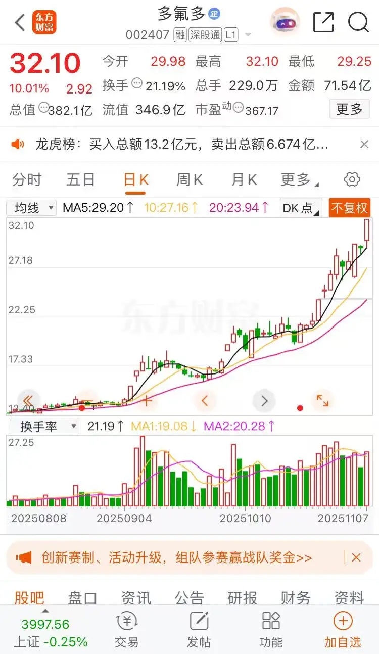 多氟多涨停板收盘报收32.10元每股,成交金额71.54亿。强者恒强,珍惜手里的筹码。