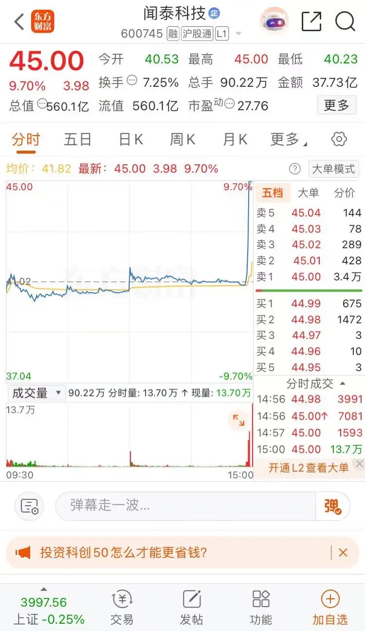 闻泰科技涨幅9.70%,收盘报收45.00元每股,成交金额37.73亿元,冲冲冲,千亿市值,未来万亿市值。