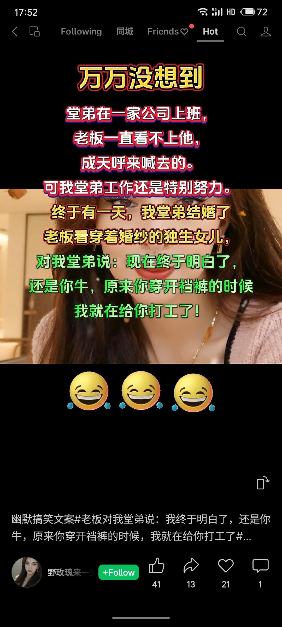 堂弟工作时常被老板轻视,但一直努力工作。直到结婚时,老板发现新娘是自己的独生女儿,才恍然大悟地对堂弟说:“原来你穿开裆裤时,我就在为你打工了!”
