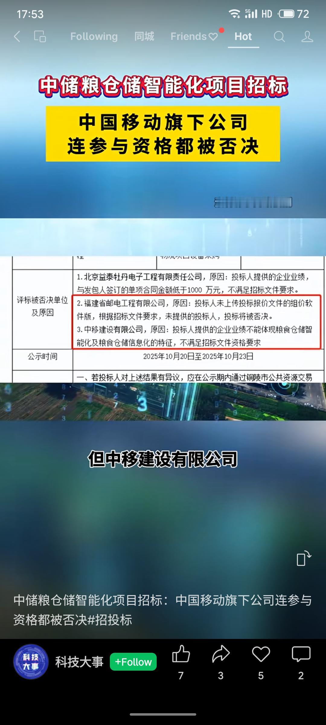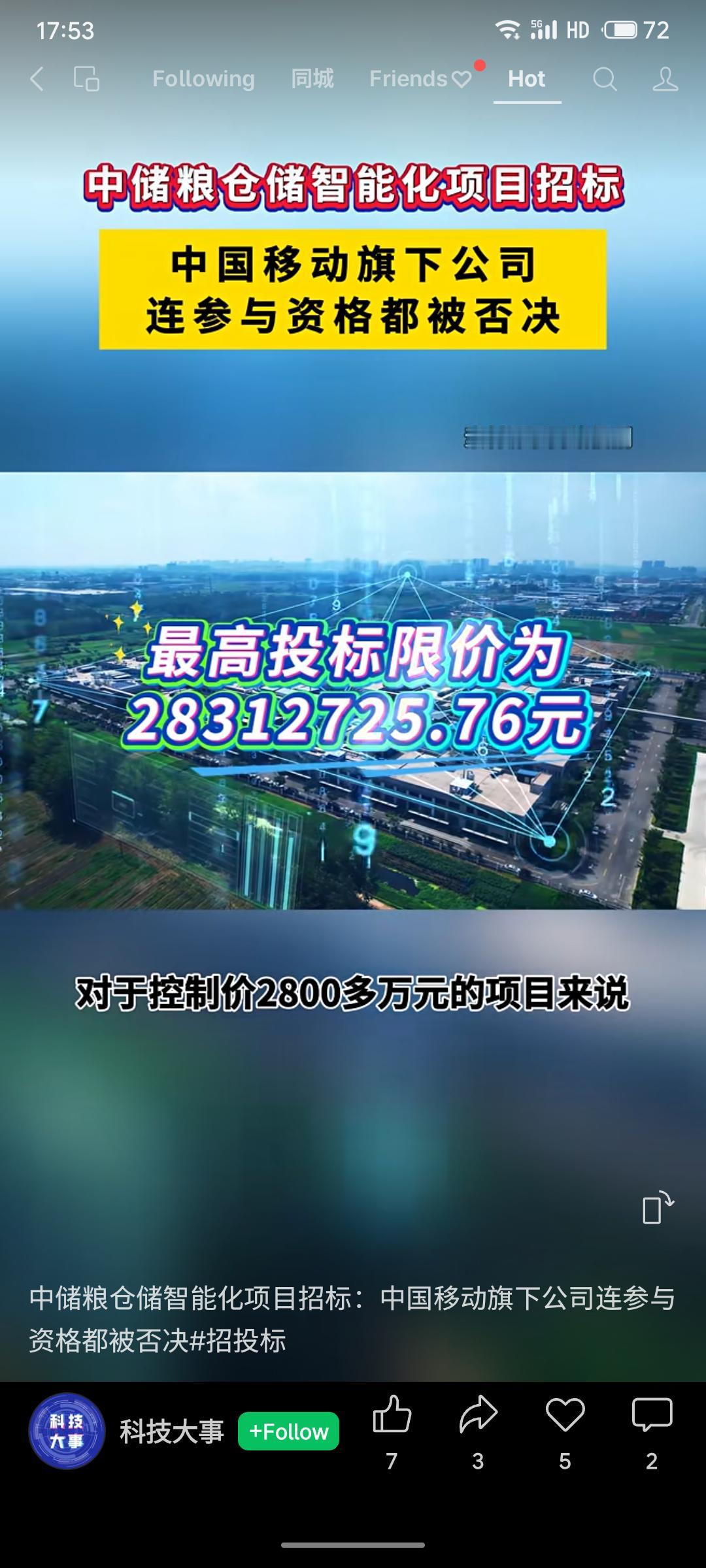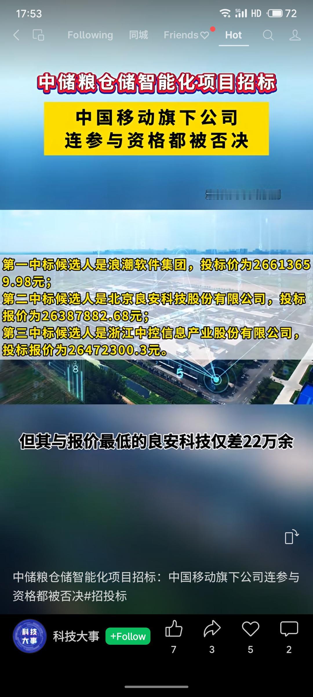 中储粮一项仓储智能化项目招标中,中国移动旗下中移建设有限公司因提供的业绩无法体现粮食仓储智能化特征,未满足资格要求,被否决投标。浪潮软件以约2661万元成为第一中标候选人,与最低报价者仅差约22万元。
