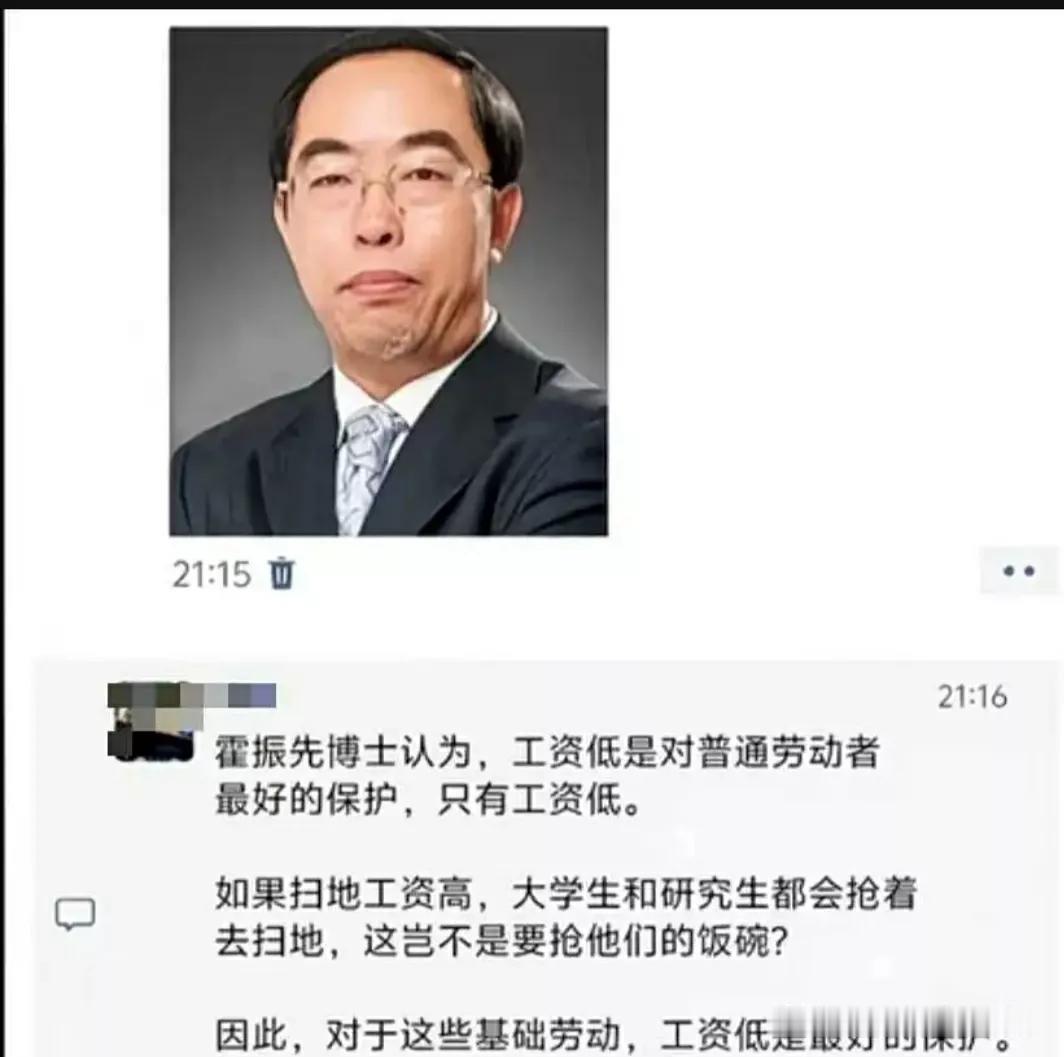 霍博士说:“低工资是对普通劳动者最好的保护” 还举例扫:地工资不能高,不然大学生来抢,底层饭碗就没了——合着低工资是给普通人“护饭碗”呢。 (那请问针对北大清华高材生,送外卖,卖猪肉这种又算什么呢?跟我们底层老百姓抢饭碗。) 按这逻辑,像你们专家高工资,是对你们自己最好的保护?一般大学生,一般人进不来,能忽悠的就忽悠,有真才实学的就来讲资历,然后被漂亮国挖走,没人跟你们抢饭?