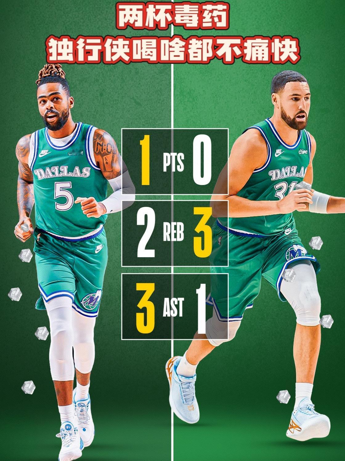 水拉&克莱两杯毒药!独行侠喝啥都不痛快! 如今基德内心想必无比挣扎!此前在克莱状态糟糕时,他直接将其下放至替补席!结果克莱状态非但没能回暖,上场打灰熊直接来了个6投0中0分入账!可见如今克莱的状态有多糟糕! 这边克莱不行,那边被提上首发的拉塞尔也没好到哪去,三场首发打下来场均仅有8分3助攻2篮板,与其此前打替补时判若两人! 水拉与克莱两杯毒药,基德是喝啥都不痛快!如今浓眉与欧文回归遥遥无期,状元弗拉格仍显稚嫩,独行侠3胜7负位列西部倒数第二,休赛期被寄予厚望的他们如今却是一塌糊涂,令人失望至极!