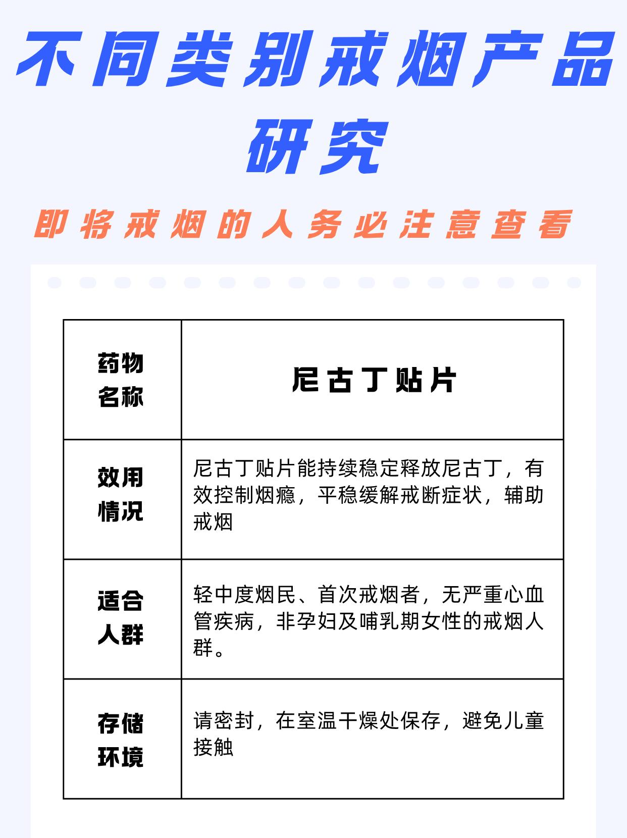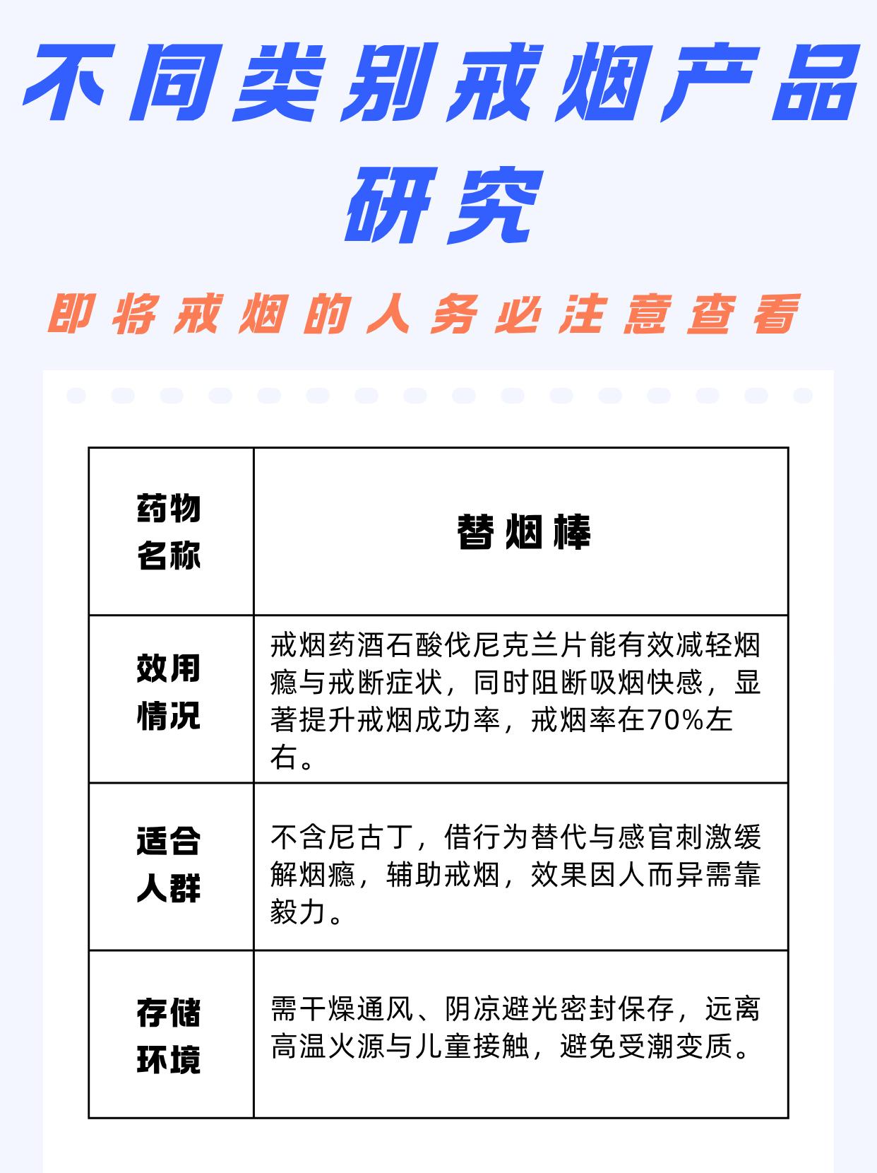 效用情况:能有效减轻烟瘾与戒断症状,同时阻断吸烟快感,显著提升戒烟成功率,戒烟率在 70% 左右。