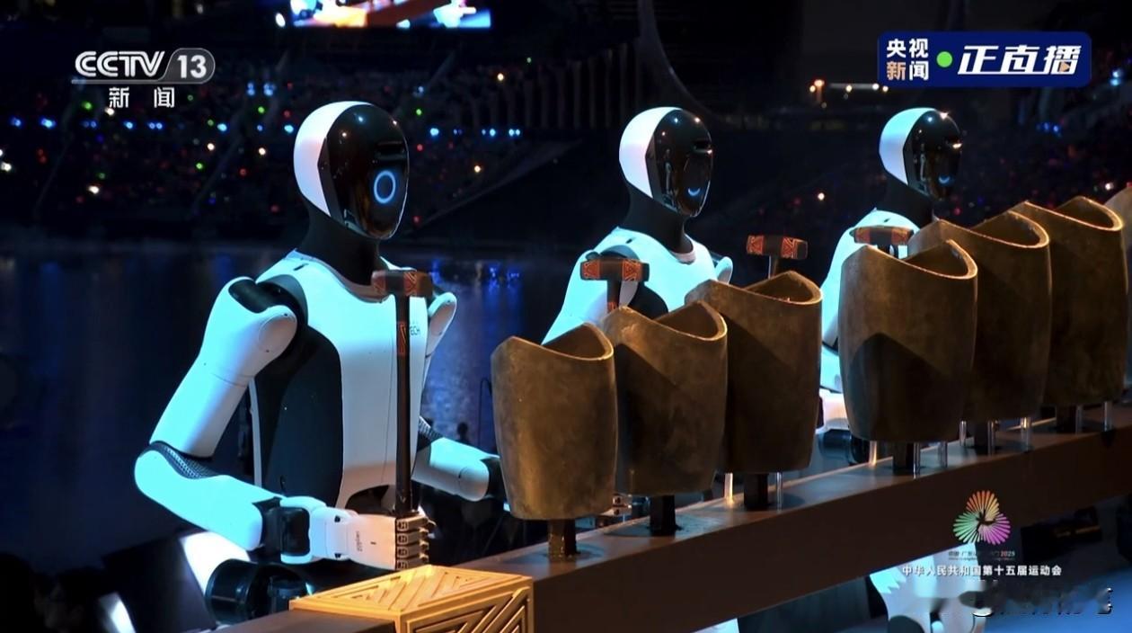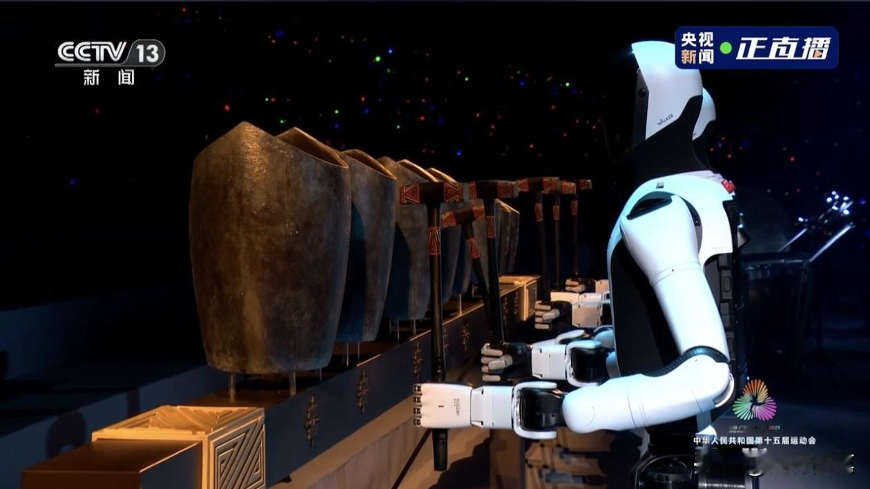 全运会开幕式表演节目一开始就有令人意外的惊喜出现。 一排古代乐器,在现代智能机器人的敲击之下,开启了节目的正式表演。虽然只有短短不到一分钟时间,只有两个视角镜头欣赏,画面一下子就过去,但是现代制造的机器人与相隔两千多年的乐器,这一历史与现代的融合,不仅反映出岭南的历史深远浑厚,也反映出大湾区在AI人工智能的生产制造方面的先进地位。两相交织,共同谱写了粤港澳大湾区的独特魅力。 从春晚机器人扭秧歌,到现在全运会开幕式机器人演奏古代乐器,不得不说,现在我国的大型表演晚会,融入机器人元素已经成为常态。