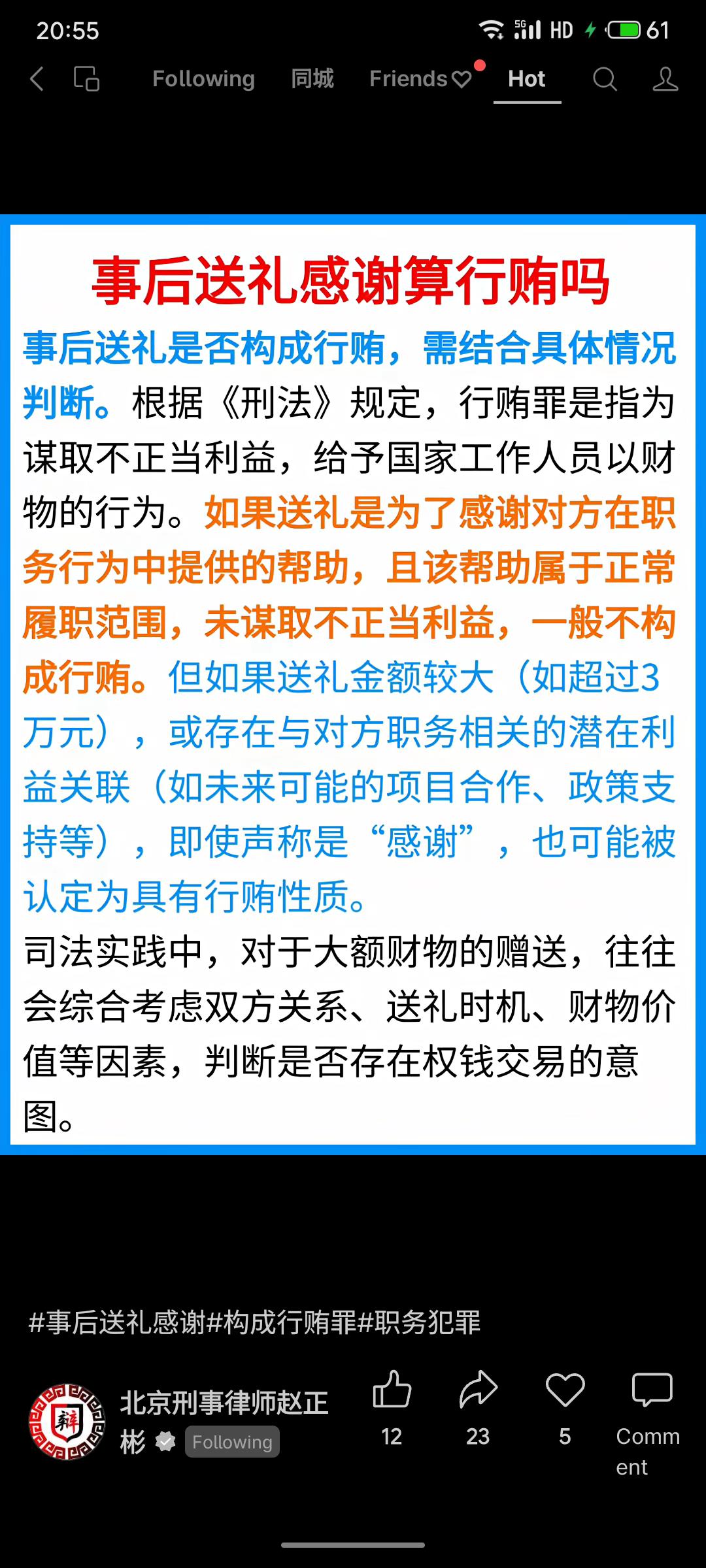 事后送礼感谢是否构成行贿,关键在于是否为此谋取了“不正当利益”。若仅为感谢对方正常履职,通常不构成;但若金额巨大(如超3万元)或存在潜在利益输送,即使名为感谢,也可能被认定为行贿。