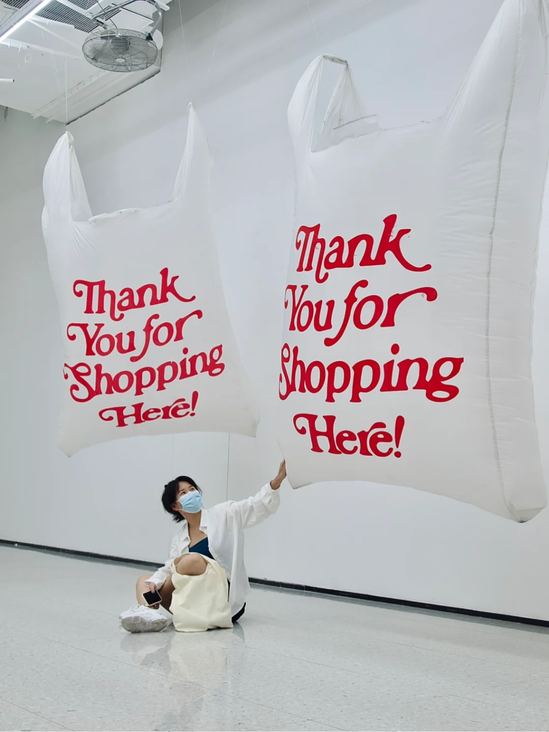 鼓风机将五个大而空的塑料袋🛍吹得巨大而膨胀,袋子袋悬挂在展厅中,虽满却空的购物袋上下浮动充满活力,正如我们当下蓬勃的消费欲望🤑——在刺激下不断膨胀,永不满足却又空寂甚至无意义。