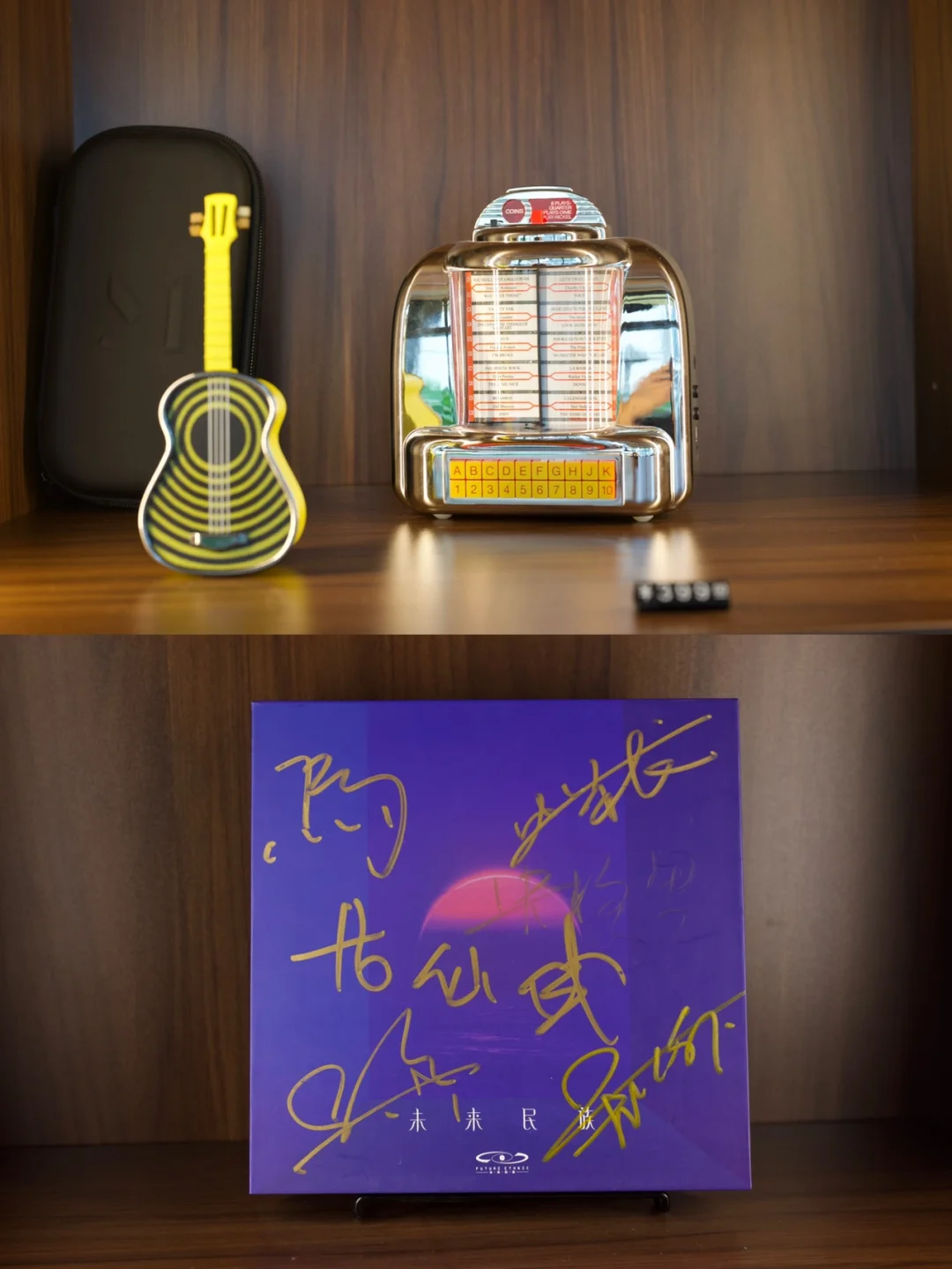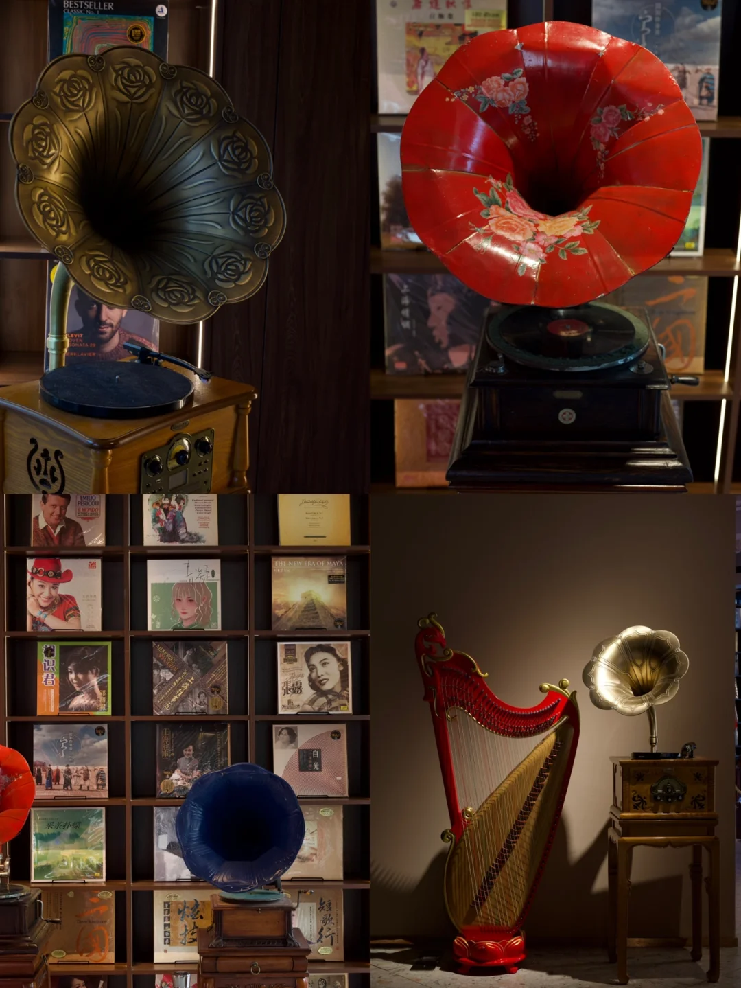唱片店平时也会有各种活动,比如:音乐会🎤(上周就有一场关于周杰伦的)、分享会等等。除了唱片,还有黑胶机、音箱📢、音乐类书籍📚等音乐周边进行售卖,店内陈列架的隔间里摆满了各式音响设备,从简易黑胶唱机,到迷你音箱,基本都有,价位也从几十元到近万元参差不齐,店内还有数台价值不菲的古董唱片机。馆内也可以喝🍷饮品(酒、咖啡、果汁、茶都有),早C晚A都能满足,同时还有🍕披萨、汉堡等轻食西餐提供。喜欢唱歌的朋友,这里还要专业录音棚🎧,可以定制你的个人专属唱片。
