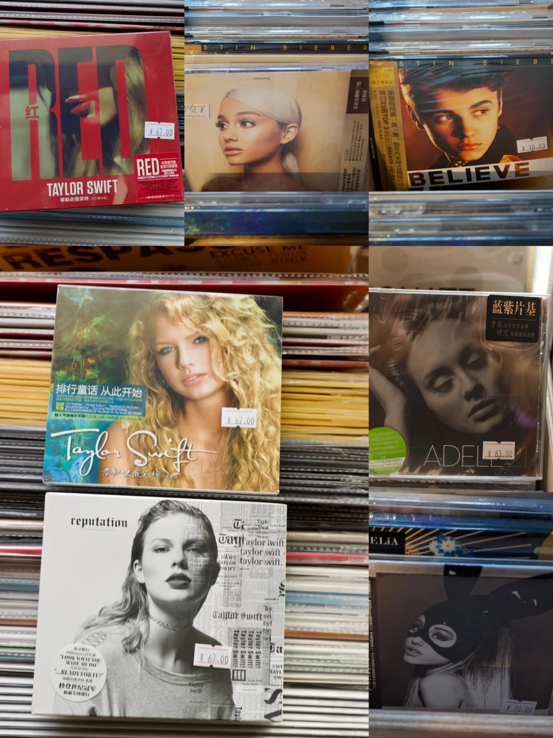 欧美主要是流行为主,Taylor Swift、Ariana Grande、Adele、Justin Bieber等等。黑胶主要是古典居多,还要就是民乐、🎺爵士、民谣、戏曲、古典、摇滚🤘等等。价格都算比较实惠,💿CD均价在60-100左右,💽黑胶价格在200左右。走的时候拿了一张纵贯线的唱片,53拿下。