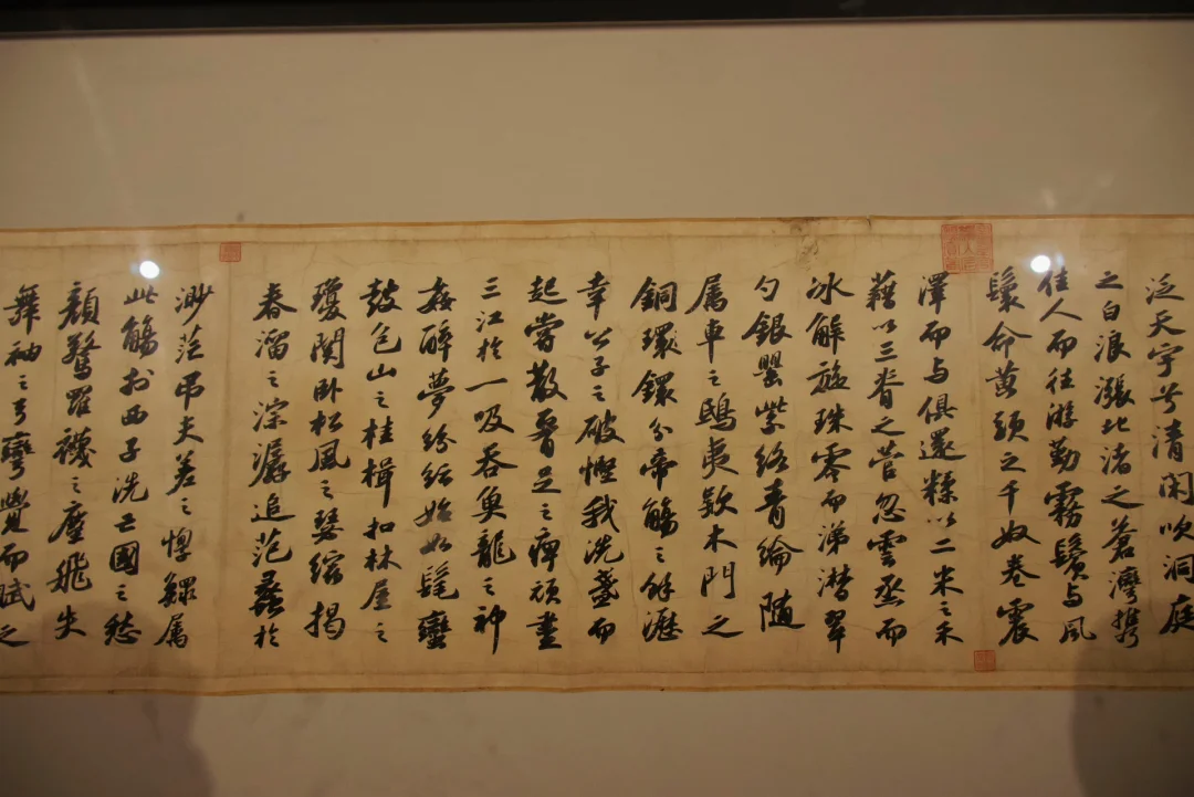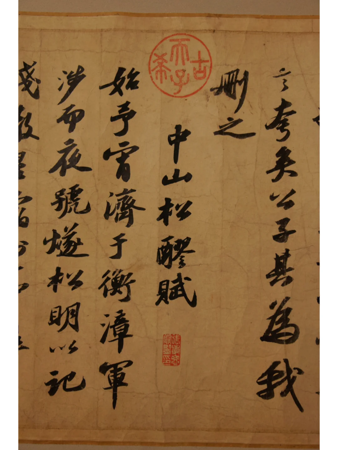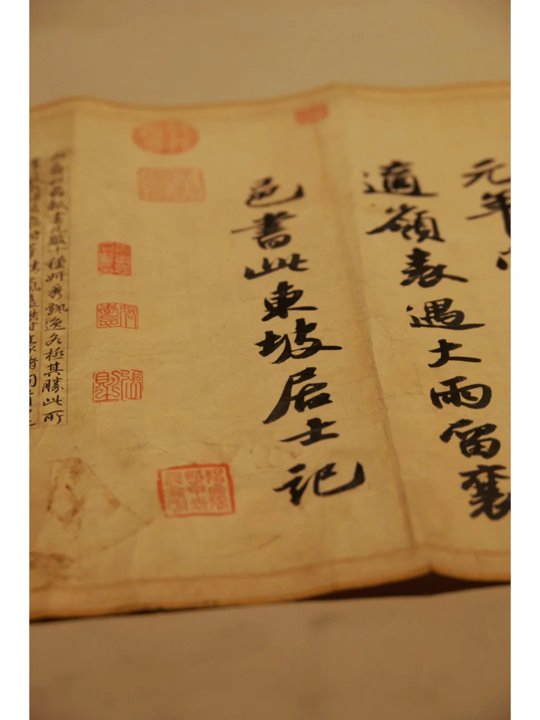 2️⃣《洞庭春色赋・中山松醪赋卷》:苏轼传世墨迹中字数最多的作品,今天的这次特展的真迹的首次展出。“洞庭春色”是用太湖柑橘酿制的🍶酒。松醪,即用松脂、松花、松子等酿成的酒。这两幅书法字迹流畅,运笔都非常匀均,写这两副画的时候东坡先生已经50多年,经过那么多的风雨,现在的心境已经完全不同了。