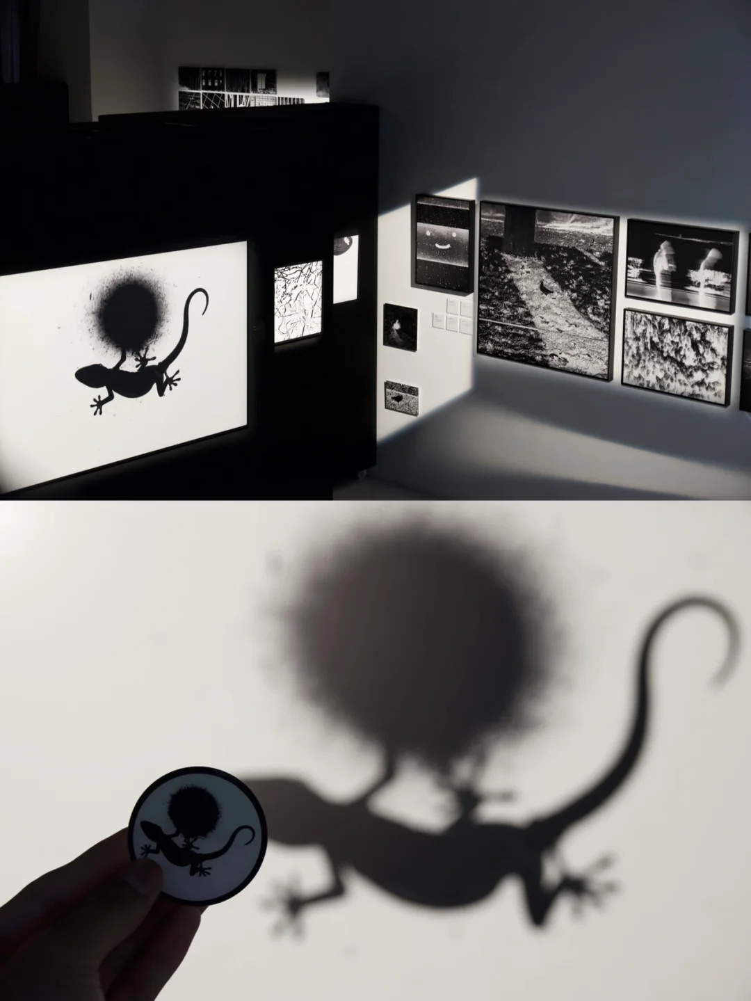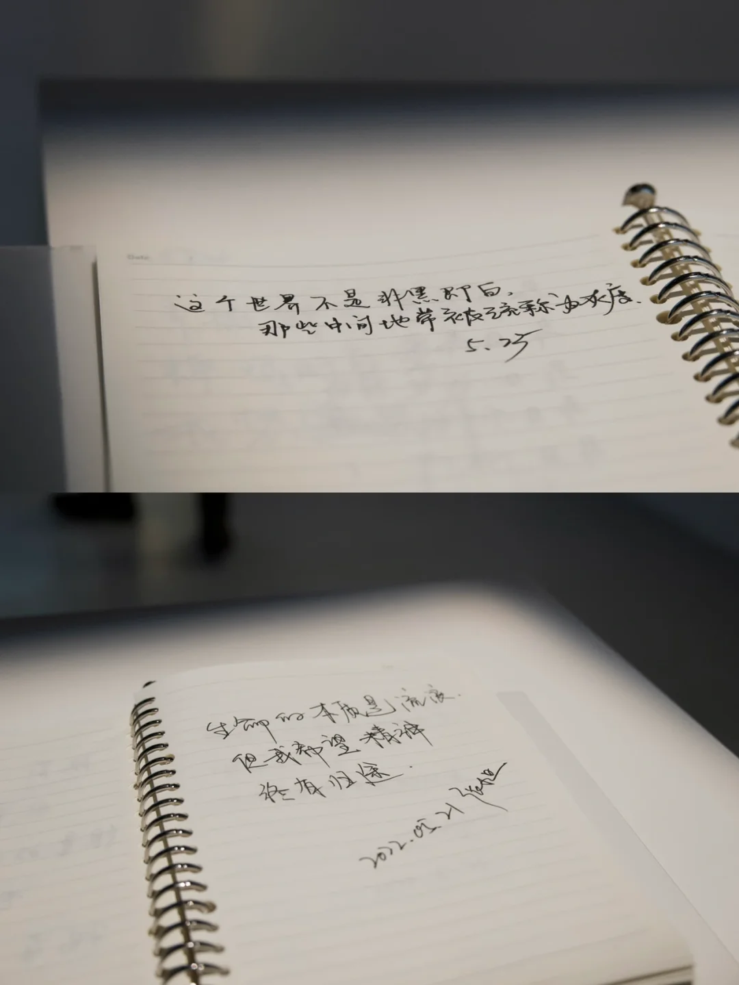 现场的摄影作品中很多都是高崧日常生活,撸猫🐈、喂鱼🐟、散步🚶甚至陪侄子玩耍👶👦的点滴都变成了他的“黑白”世界,现场许多作品旁边有他以日记📔化的主人公叙事的作品标签,其中很喜欢他在“独一无二的贝壳”说的一段话,简单又富含哲意。