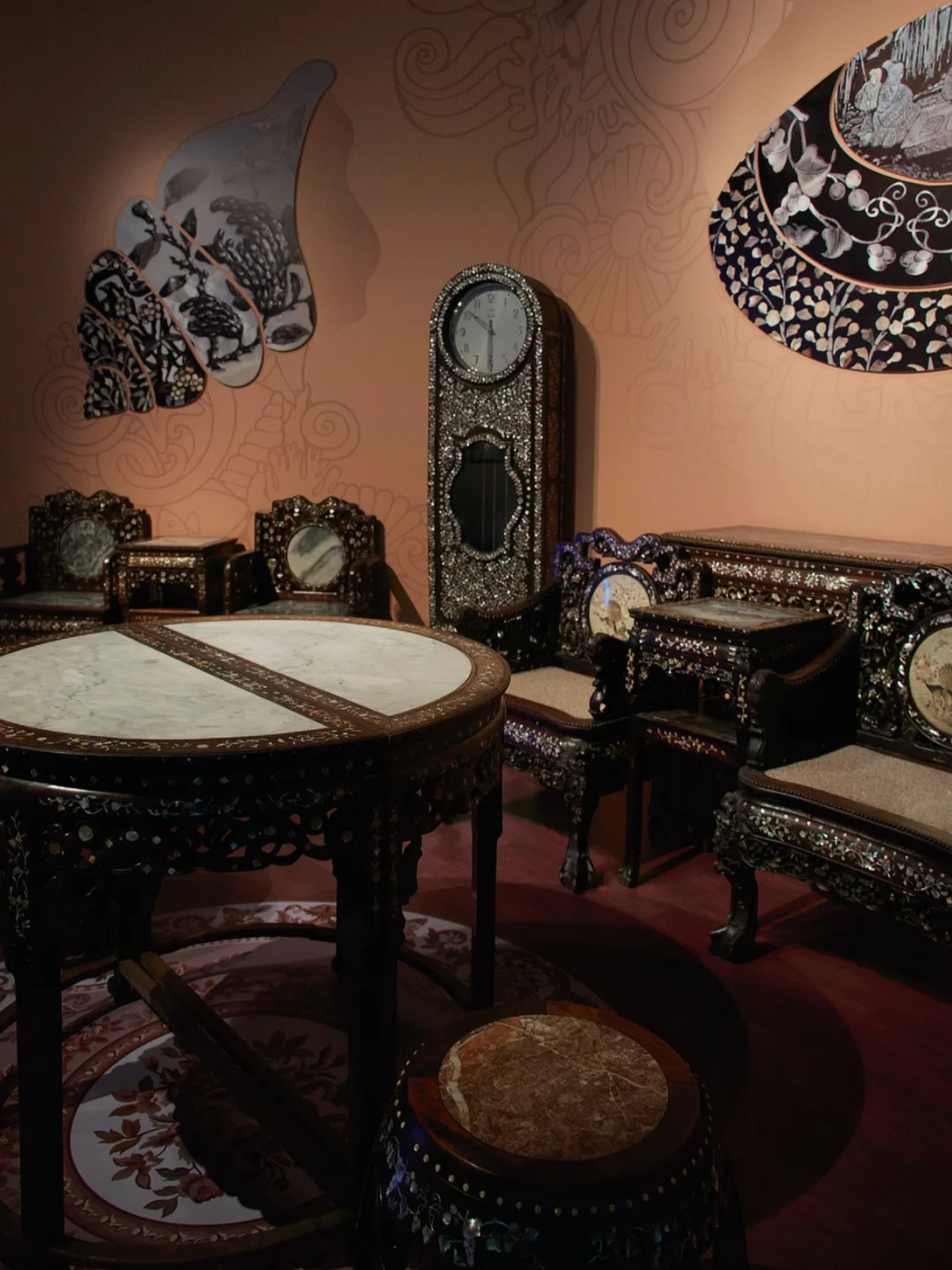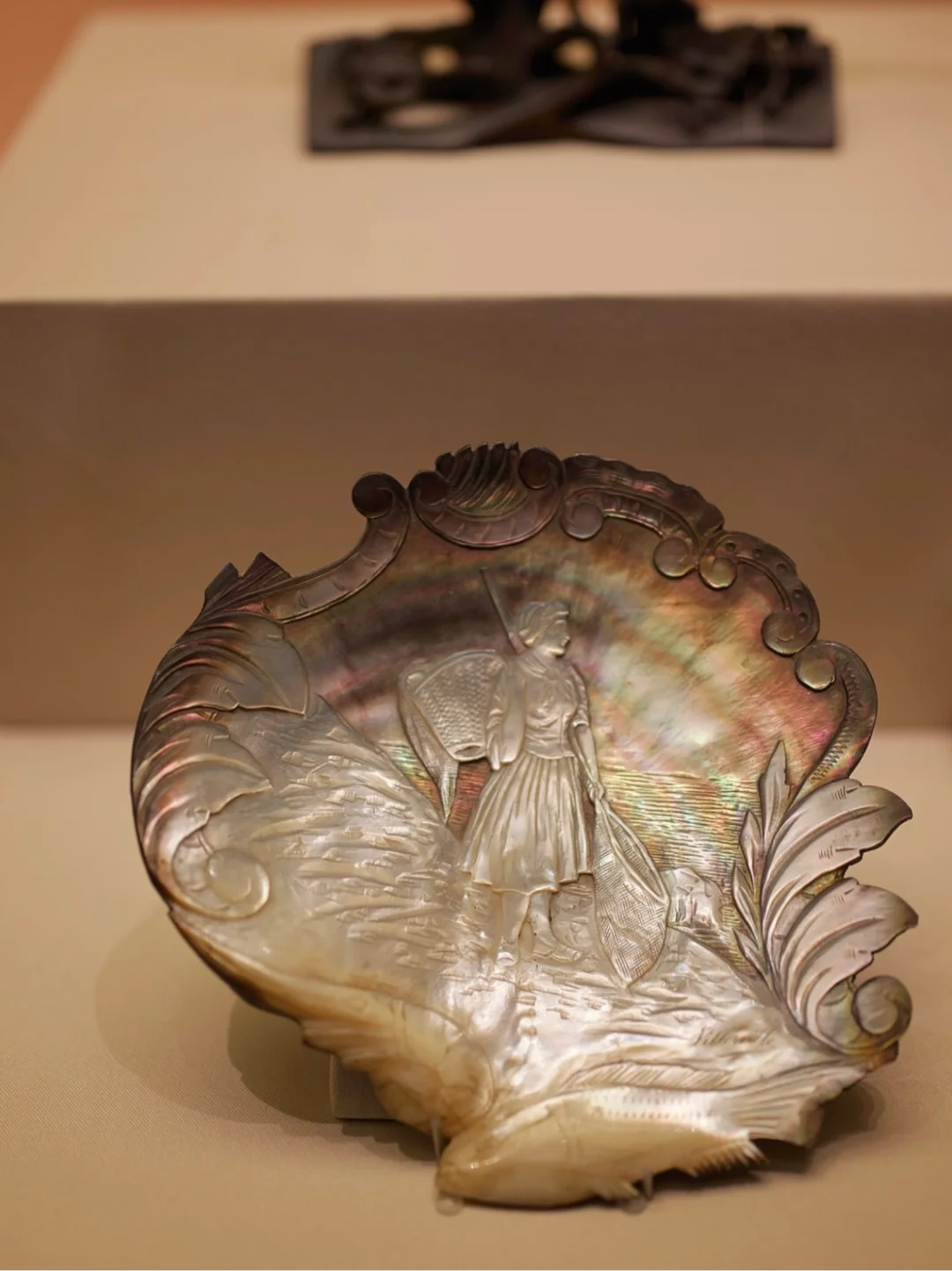 11、随着生产力的提高和审美意识的变化,发展出螺钿、贝雕等工艺,展厅结尾有套民国的螺钿家具🪑套组,非常精美。