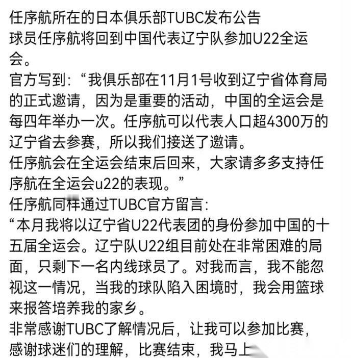 在日本打球,好好的,直接跟俱乐部请假说:我要回家。 为啥? 家里的球队,辽宁U22,全运会眼看要开打了,本来是夺冠的架势,现在惨到连12个人都凑不齐。 一个电话打过去求援,这孩子二话不说,行李一收就往回赶。 就一句:我是辽宁养大的,家乡有难,我必须回来。 真的,有时候看体育,看的根本不是输赢,看的就是这股劲儿。 什么叫“根”?这就是。 在外面混得再好,家喊你一声,你听不听?你回不回? 别人都想削尖脑袋往外跑,他偏要往回冲。 一头扎进这个谁都不看好的“烂摊子”里。 这比你拿多少个冠军,都提气。 这小子,叫任旭航。 我记住了。