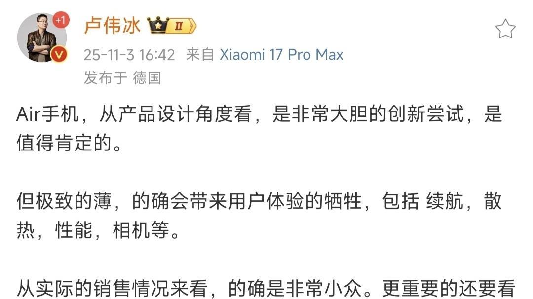 卢伟冰:苹果Air牺牲了续航、散热、性能、相机。 小米高管再次对苹果Air进行评价,他说在产品设计上,这是一次非常大胆的创新,但手机过于轻薄,牺牲了续航,散热,性能和相机。 卢伟冰说的很对,我认为花八千以上苹果Air的用户,看中的肯定不是续航性能相机等等,而是为设计买单,基于性能买单,肯定不值得,基于设计买单,肯定非常值得,所以不能一概而论说苹果Air是智商税,还需要看实际需求,毕竟苹果不傻,很清楚不少人喜欢苹果Air这类产品,消费者更不傻,很清楚自己的需求是什么。 但苹果不得不承认智能手机发展十多年来,超轻薄设计的手机的受众群体确实很少,因为现在大部分都是重度手机使用者,即使不玩游戏,每天也会刷大量的短视频,加上现在的软件缓存数据越来越大,对CPU性能要求越来越高,所以续航能力非常重要,苹果Air注定属于非常小众的产品,根据手机博主公布的数据来看,销量确实很低,激活量远远低于预期。