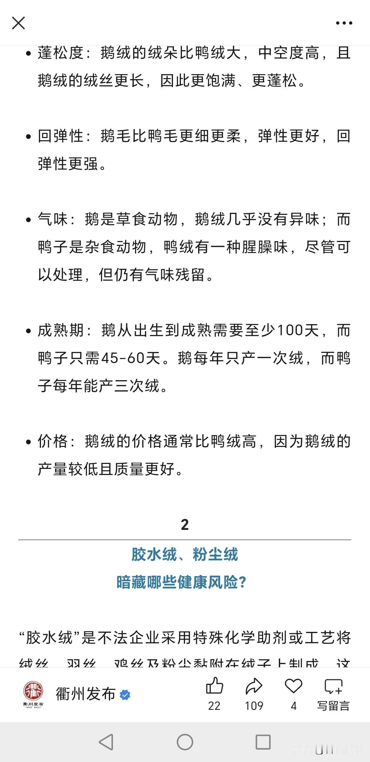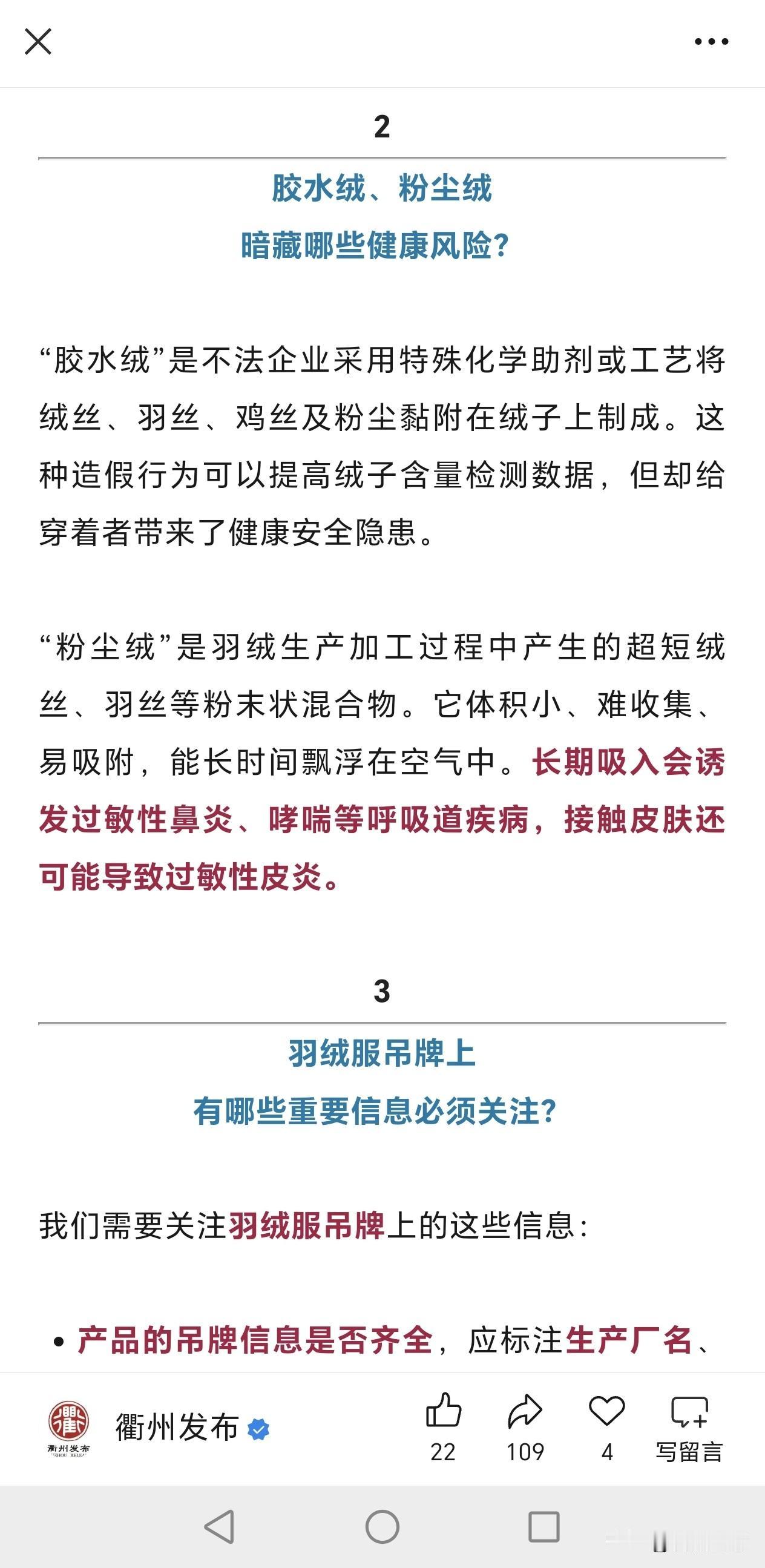 请问衢州市政府新闻办@衢州发布 :任由谋财害命的企业肆虐应追究谁的法律责任? 看2025年11月9日21点41分@衢州发布 发布的《这种羽绒服穿得越久,危害越大》一文写到“ “胶水绒”是不法企业采用特殊化学助剂或工艺将绒丝、羽丝、鸡丝及粉尘黏附在绒子上制成。这种造假行为可以提高绒子含量检测数据,但却给穿着者带来了健康安全隐患。 “粉尘绒”是羽绒生产加工过程中产生的超短绒丝、羽丝等粉末状混合物。它体积小、难收集、易吸附,能长时间飘浮在空气中。长期吸入会诱发过敏性鼻炎、哮喘等呼吸道疾病,接触皮肤还可能导致过敏性皮炎。” 做咱中国🇨🇳老百姓咋这么难,要学会辨别这个,辨别那个的,那么多危害全国人民身体健康的假冒伪劣产品充斥市场,谁之责?名城创意 羽绒服掺假 羽绒服伪劣事件 羽绒服假绒乱象 服装违规 服装危害 浙江企业打假