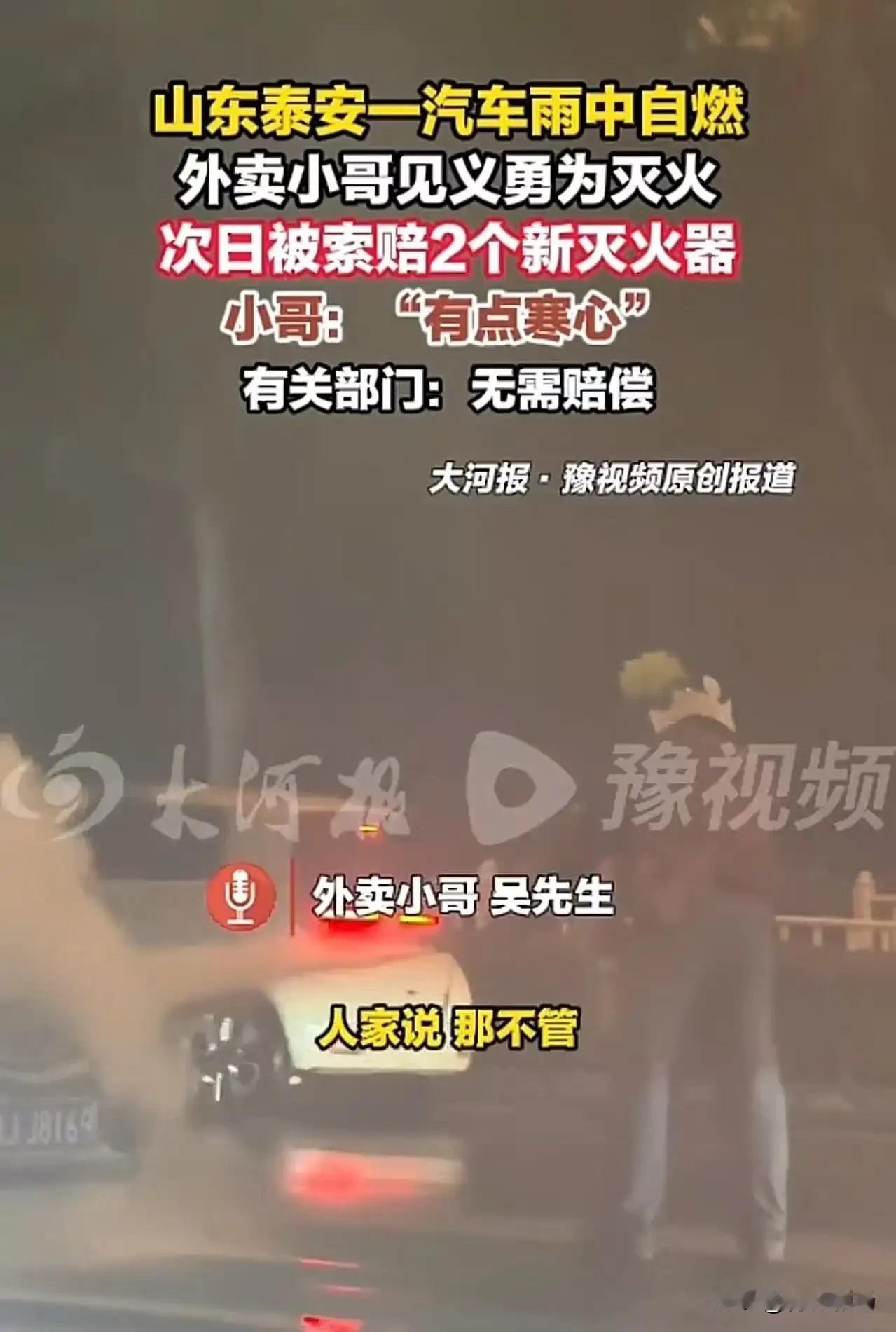 山东泰安icon。一车辆发生自燃,外卖小哥从附近警务室借来灭火器灭火,不料次日,被索赔2个新的灭火器!小哥:有点寒心!网友:“要赔也是起火车主赔,因为起火车是受益方,外卖小哥是施救方!” 这是一场看似普通的火灾,却引发了人性与法律的深刻思考。在泰安,一辆自燃的车辆瞬间点燃了人们心中的火焰,也让我们重新审视了“善意”与“责任”的边界。 事情的起因很简单,一辆车突然起火,火势迅速蔓延,危及周围的居民和行人。就在危急时刻,外卖小哥第一时间冲到警务室,借来灭火器,奋不顾身地扑灭火焰。那一刻,他的行动无疑展现了普通人的勇敢与善良,也彰显了在危难时刻,人性中最温暖的一面。 然而,令人难以置信的是,次日,这位外卖小哥竟然被车主索赔两个新的灭火器!这让他感到“有点寒心”。他的善意没有得到应有的理解,反而被视作“负担”。这背后,折射出的是我们社会中一些令人扼腕的现实:在利益和责任的天平上,善行似乎变得脆弱而无力。 网友们的声音也逐渐聚集起来:“要赔也是车主赔,因为起火的车辆是受益方,外卖小哥只是施救者。”这句话,道出了人们心中的正义感和对善良的支持。善行不应成为被索赔的理由,更不应被视作“理所当然”的负担。善意本身就值得尊重,而责任的界限也应由法律和道德共同界定。 这件事让我们反思:在这个快节奏、利益至上的社会里,善意和责任到底该如何平衡?我们是否还记得,那个在危难时刻挺身而出的外卖小哥,代表的不仅仅是一个人的勇敢,更是一种社会的温度?他用行动告诉我们,善良不是软弱,而是人性最坚韧的力量。 或许,我们需要的不是对善行的索赔,而是对善良的尊重和保护。每一个在危难中伸出援手的人,都值得我们用更宽容、更理解的眼光去看待。只有这样,我们的社会才能变得更加温暖、更加有希望。 这起事件,或许只是一个小插曲,但它引发的思考,却值得我们每一个人深思。善意应得到尊重,责任应由法律界定,而不是让善行变成“负担”。让我们共同呼吁:用理解和宽容,守护那些在平凡中彰显伟大的善良之举。因为,正是这些微小的善意,汇聚成我们这个社会最坚实的温暖底色。