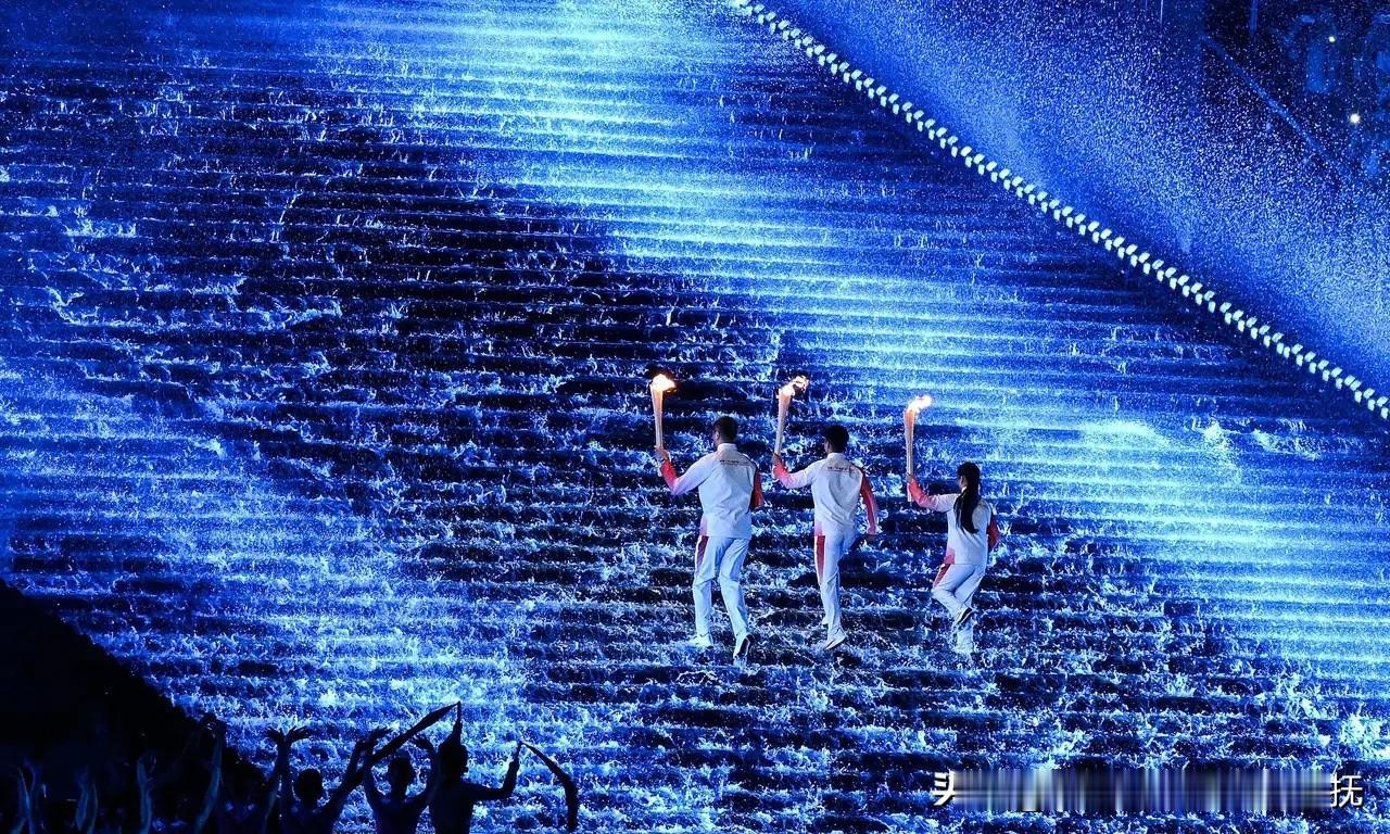 今晚全运会最大的亮点是什么? 当然是开幕式的舞台,整个舞台都是水,火炬传递、演员表演全都在水中进行! 最惊险的莫过于粤港澳三位火炬手在水中爬楼梯,传递圣火。 看得人都提心吊胆,又觉得特别震撼! 这也寓意着广东人“顺风顺水”,大吉大利![赞][赞][赞][赞][赞][赞]