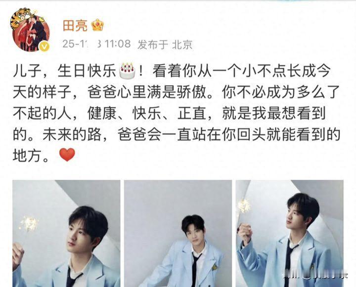 田亮晒14岁儿子庆生照,一脸明星相,个子超过爸。11月8日,田亮在微博晒出儿子小亮仔的14岁生日照。照片里,田宸羽穿着西装,个子已经超过爸爸了。田亮写着“儿子,生日快乐”,说心里满是骄傲,希望儿子健康快乐正直就好。“我怀里的小男孩,背影已有了少年的模样”,这是田亮晒照时的感慨,这时候他就发现,儿子真的长大了![得意][得意]