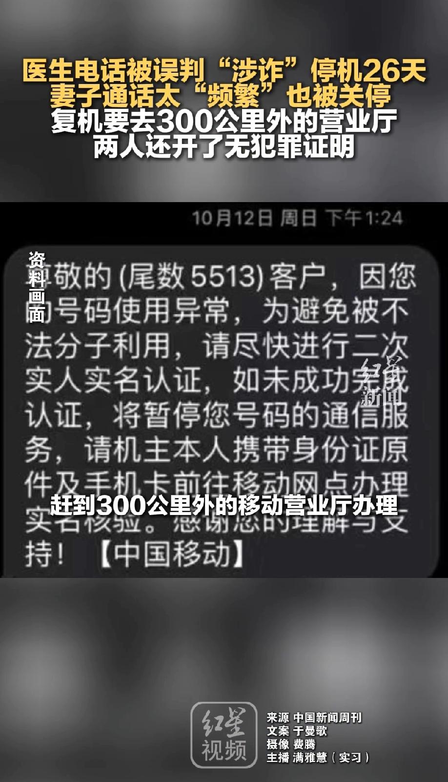 万万没想到!湖南沅陵县,一医生因手机打电话太过频繁,被误判“涉诈”停机整整26天,而手机停机时,他正在做手术,如果要复机,必须带着无犯罪证明,前往300公里外的营业厅。更让人没想到的是,妻子为了帮丈夫复机申诉后,自己的电话也因“涉诈”而关停了。 (来源:红星新闻) 杨女士和丈夫都是沅陵县一家医院的医生,每天要跟大量患者沟通病情、安排诊疗,手机就是他们的“工作生命线”。 可谁也没想到,一场无妄之灾突然降临。 10月12号那天,杨女士的丈夫正在手术台上给病人做手术,关键时候工作手机突然没了信号。 等手术结束一看,才发现手机号被中国移动以“涉诈”为由停机了。 这可急坏了夫妻俩,医生的手机哪能随便停?好多病人要联系复诊,还有急诊消息要接收,没手机简直寸步难行。 他们赶紧跑到当地营业厅咨询,结果被告知手机号归属地是长沙,沅陵的营业厅管不了,得本人带着无犯罪证明去300公里外的长沙指定营业厅才能复通。 为了尽快恢复通讯,他们通过中国移动APP线上申诉,还留了杨女士的手机号当联系方式。 可更离谱的是,没过多久杨女士的手机也被停了,理由是“使用异常”。 后来打10086客服才知道,原来是她平时跟病人通话太频繁,被系统当成涉诈风险了。 夫妻俩没办法,只好先去当地公安和反诈中心咨询,工作人员查完说他俩没任何犯罪记录和异常通信行为,还帮他们线上开了无犯罪证明。 可拿着证明去申诉,问题还是没解决,不同客服说法都不一样,有的说要公安证明,有的说不用,可都坚持必须去长沙线下办理。 就这么一来二去,杨女士丈夫的手机足足停了26天,直到11月6日媒体介入后,才收到线上核验短信恢复了通讯,而杨女士的手机至今还没找到便捷的复通渠道。 事件曝光后,有网友吐槽:“反诈是为了保护大家,可也不能不分青红皂白啊,医生的通话频繁明明是工作需要”; 还有人替夫妻俩抱不平:“往返300公里的路费、请假的损失谁来赔?凭啥让无辜用户为系统误判买单”; 也有网友分享类似经历:“之前我也被误判过,解封手续又繁琐又折腾,客服还一问三不知”。 不过也有少数网友理解运营商:“反诈形势严峻,系统误判难免”,但这种说法很快被反驳,毕竟误判的代价不该让普通用户承担。 在我看来,这件事里运营商的操作实在说不过去。反诈的初衷是守护民生,可医生的工作是守护生命,两者本不该冲突。 首先,系统模型太机械,只看通话频率就判定风险,完全没考虑医生这种特殊职业的需求,缺乏对职业特殊性的考量; 其次,复通流程太不合理,异地用户要跑300公里办理,还要求开无犯罪证明,明显是把反诈成本转嫁给了用户; 更让人无语的是客服口径不一,连基本规则都没统一,可见内部管理有多混乱。 其实根据《反电信网络诈骗法》,运营商对异常号码该重新实名核验,根据风险等级采取不同措施,而不是一停了之。 医生、警察这类特殊职业,本就该有专属的识别机制或“白名单”,避免出现“救命电话被停机”的荒唐事。 反诈不是“一刀切”的懒政,而是要在精准防控和便民服务之间找到平衡。 运营商不能用“宁可错杀一千”的逻辑做事,升级算法、细化规则、优化流程才是正道。 毕竟,财产损失还有挽回的可能,可生命通道一旦被堵,后果不堪设想。