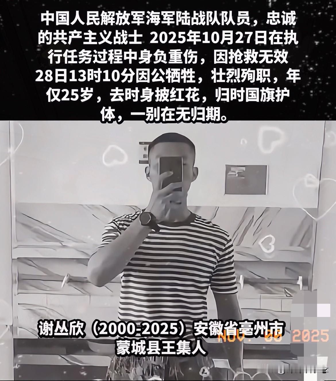 去时胸前戴花意气风发, 归时国旗覆体魂归故里。 这个叫谢丛欣的海军陆战队员,把青春永远定格在了保家卫国的征程上。 穿上军装那一刻,他就不再是父母眼里那个需要呵护的宝贝疙瘩,军令如山,他选择成为守护万家灯火的利刃,我们无法知晓他最后执行任务时经历了什么,军事机密背后,藏着太多不为人知的英勇瞬间。 总有人说岁月静好,可这静好是无数个谢丛欣用生命换来的,他们也是二十出头的年轻人,却扛起了最沉重的责任。英雄回家乡那天,蒙城天空飘着细雨,就像亲人止不住的眼泪。 哪有天生的英雄?不过是平凡人选择了非凡的担当,谢丛欣用热血浇灌了脚下的土地,他是安徽的骄傲,更是这个时代最亮的星。 如果你身边也有这样的军人故事,评论区留下感动瞬间,让正能量传递下去!