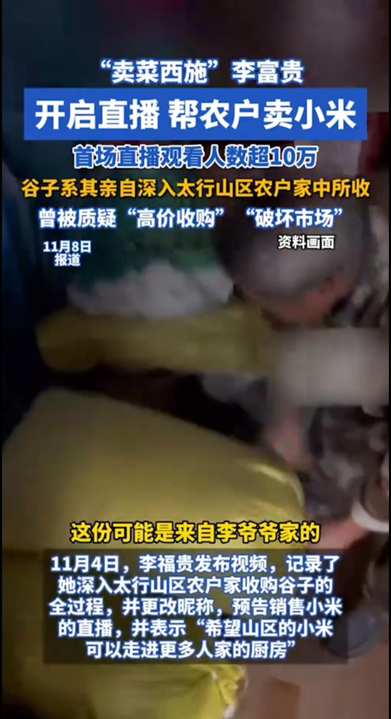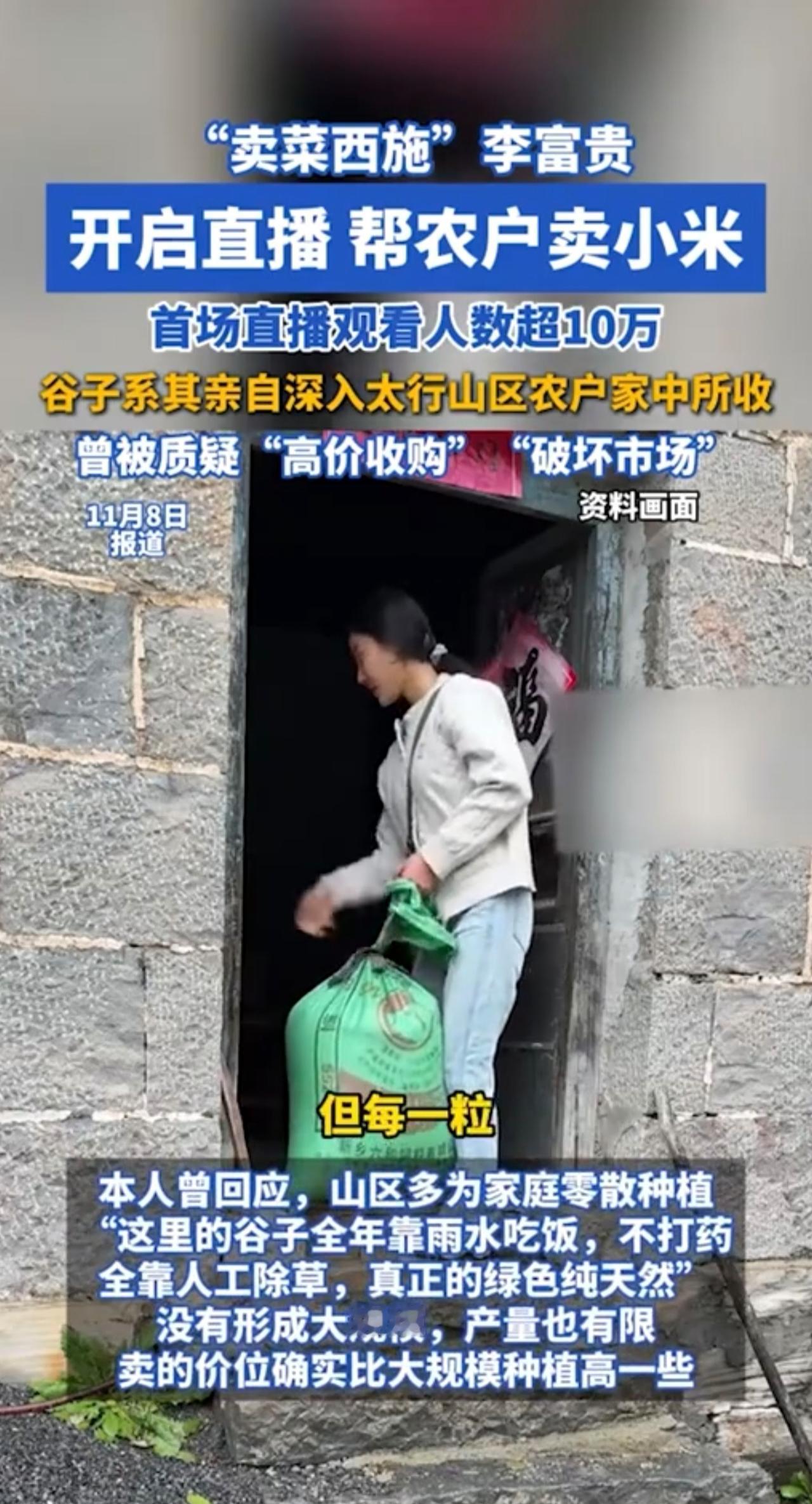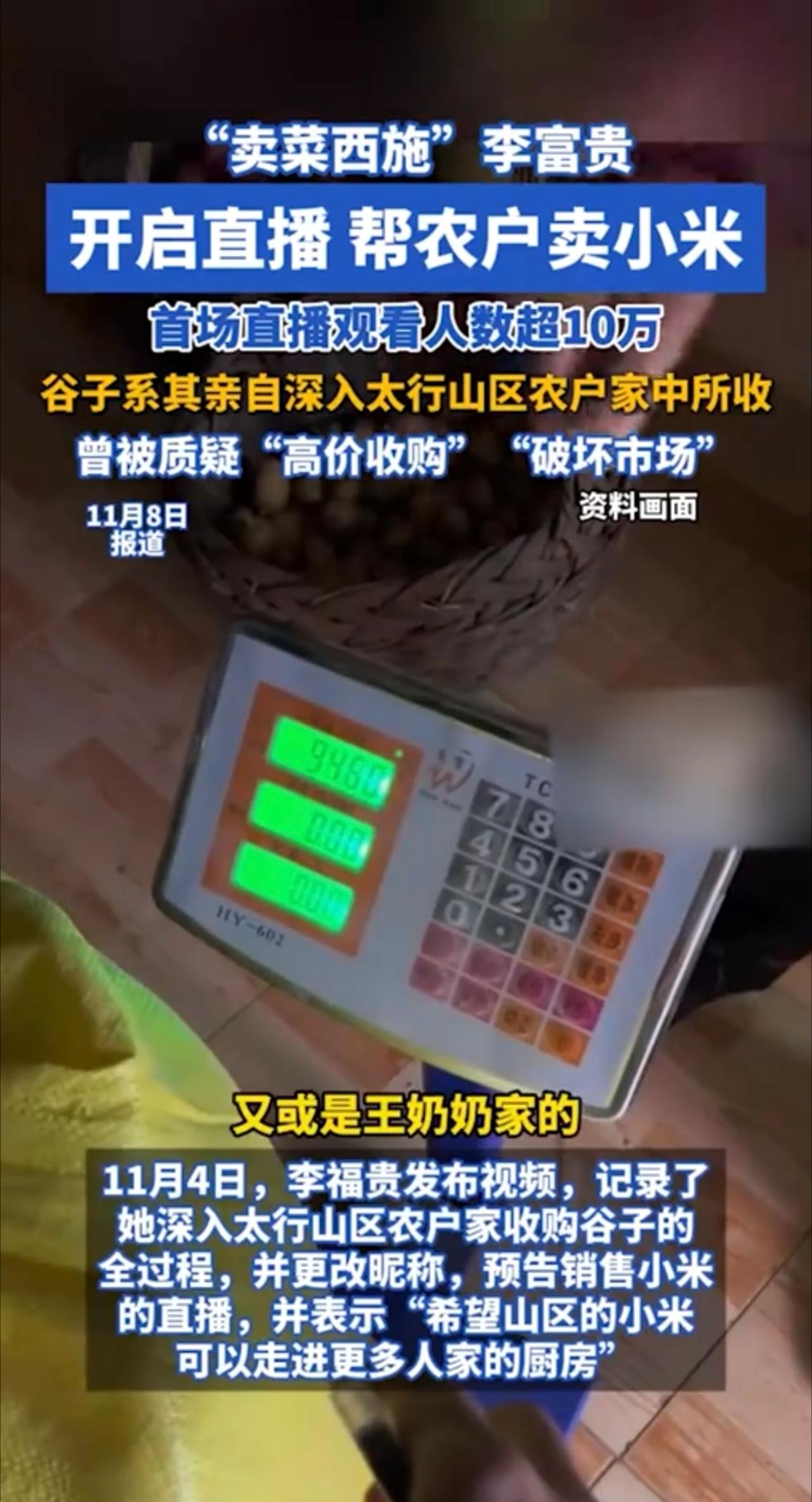 “卖菜西施”李富贵 开启直播帮农户卖小米 首场直播观看人数超10万 谷子系其亲自深入太行山区农户家中所收 曾被质疑“高价收购”“破坏市场”