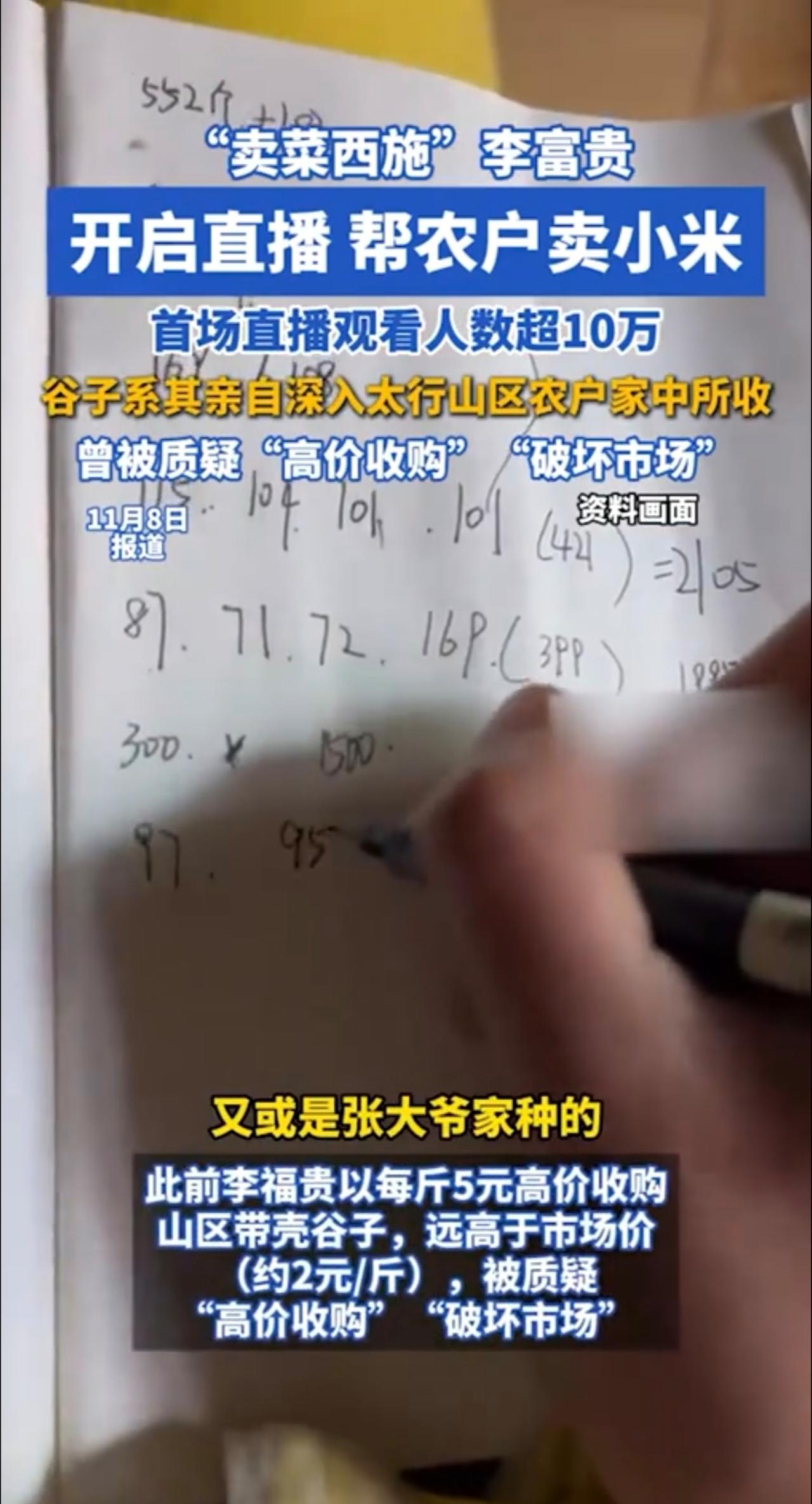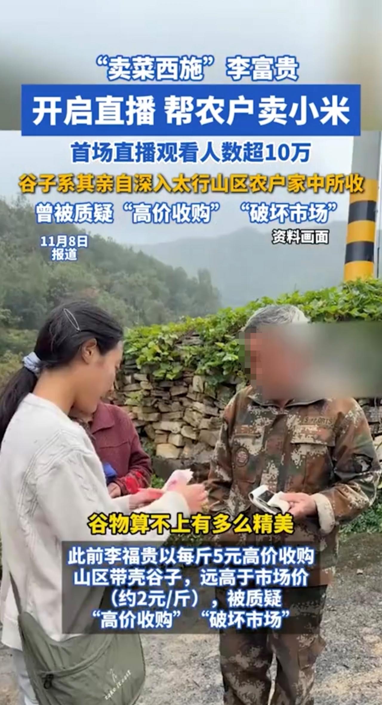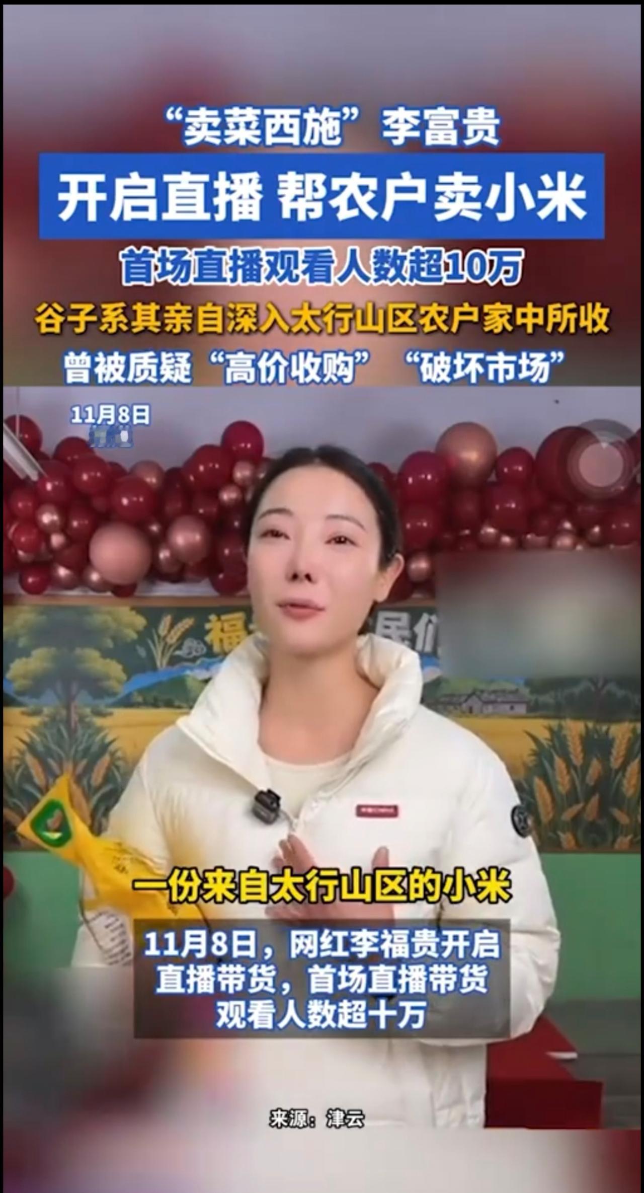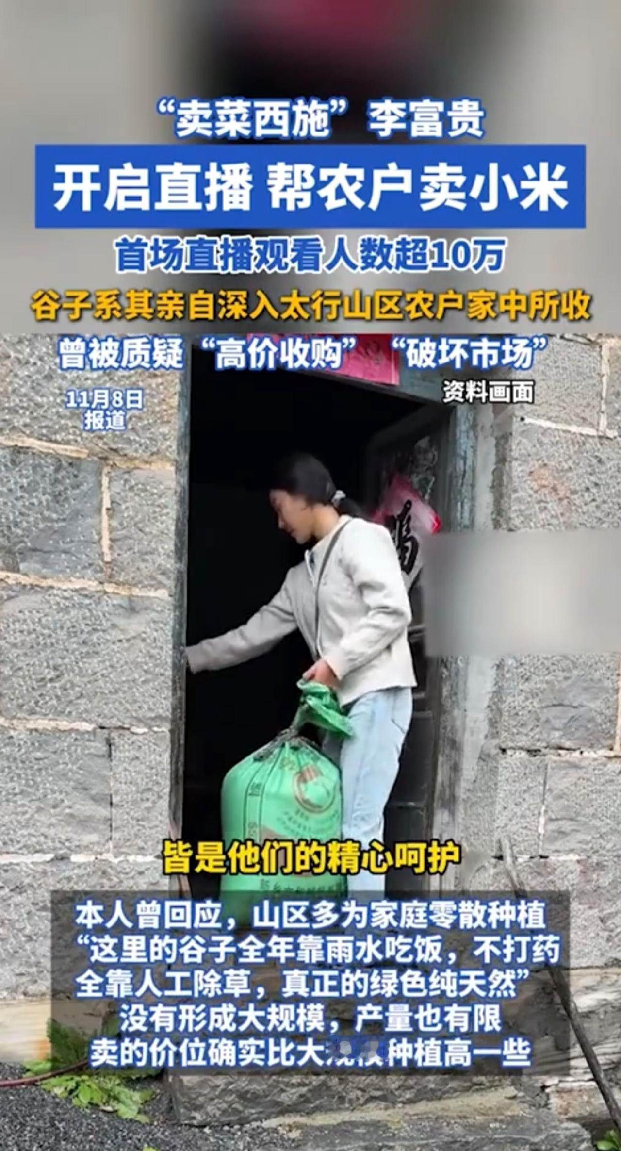 “卖菜西施”李富贵 开启直播帮农户卖小米 首场直播观看人数超10万 谷子系其亲自深入太行山区农户家中所收 曾被质疑“高价收购”“破坏市场”