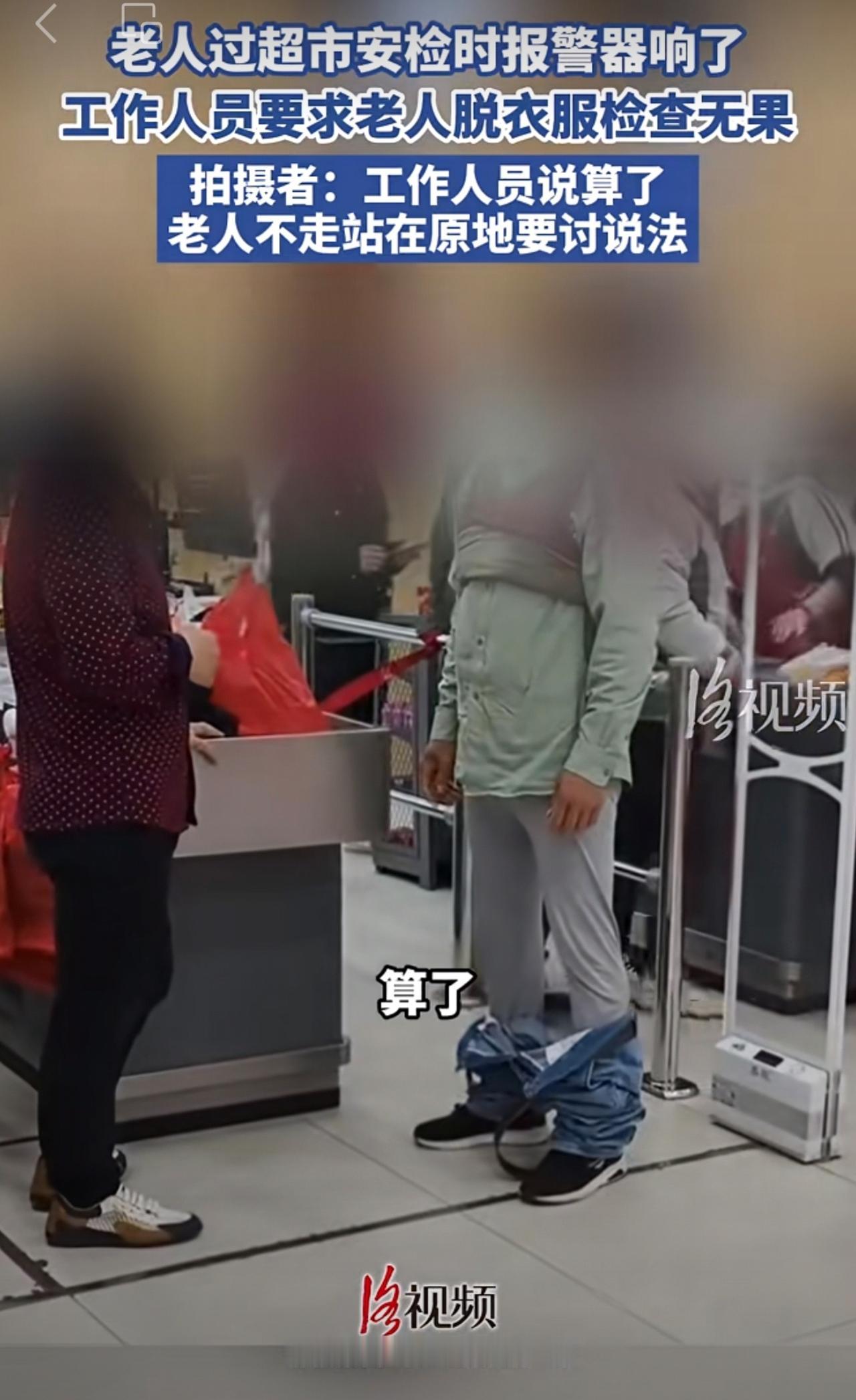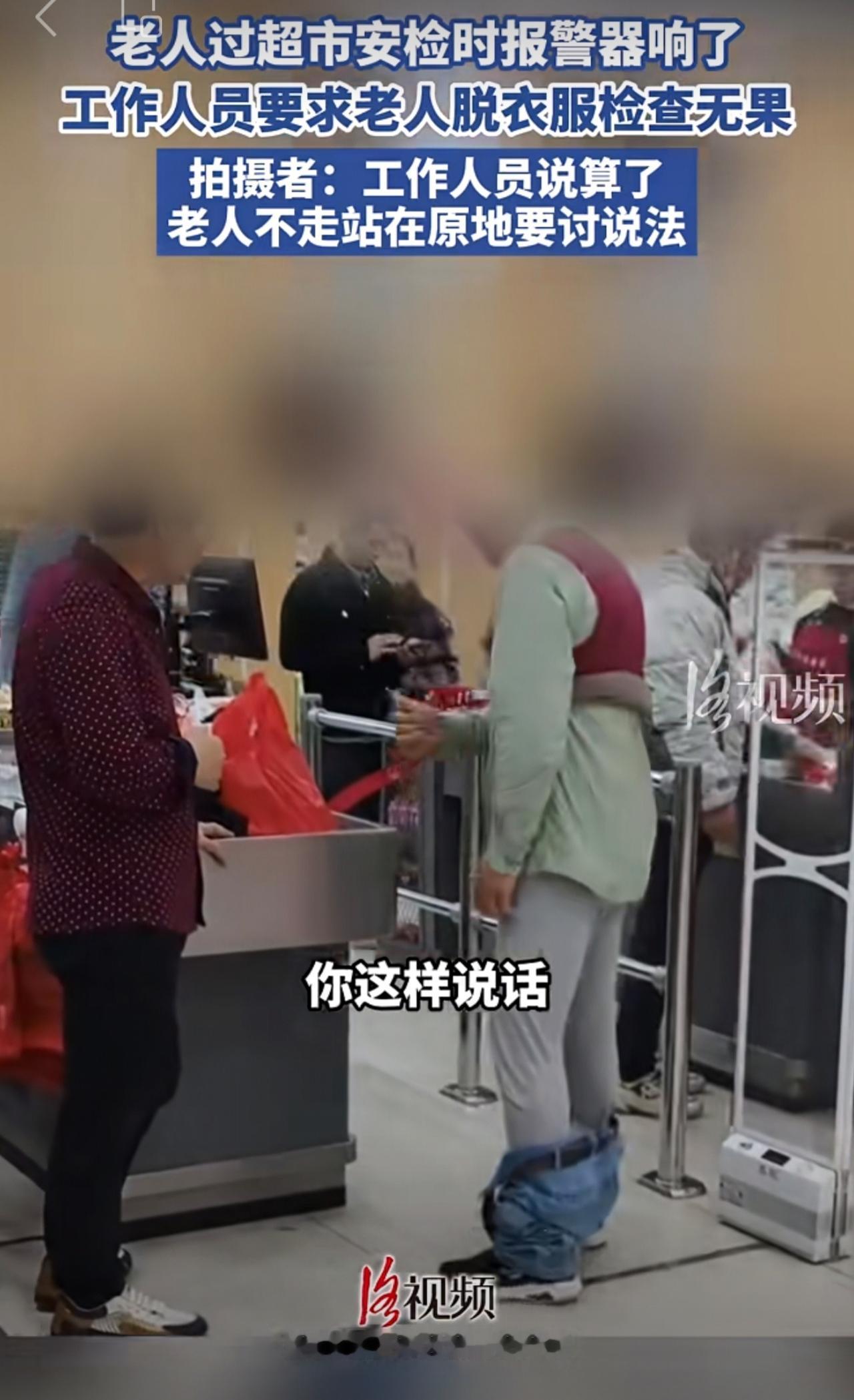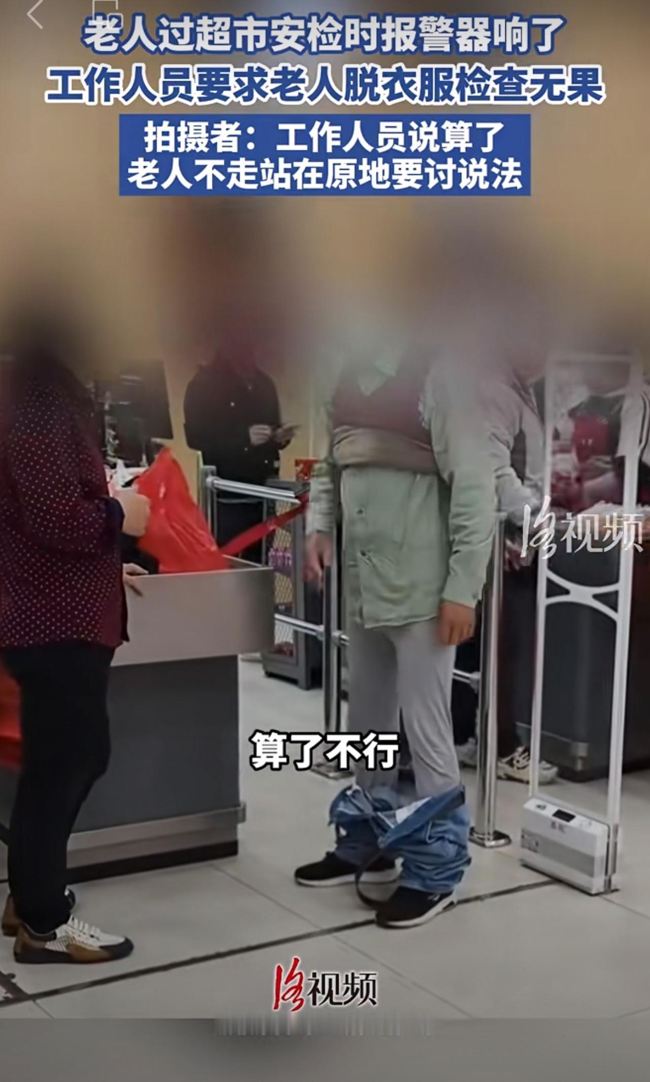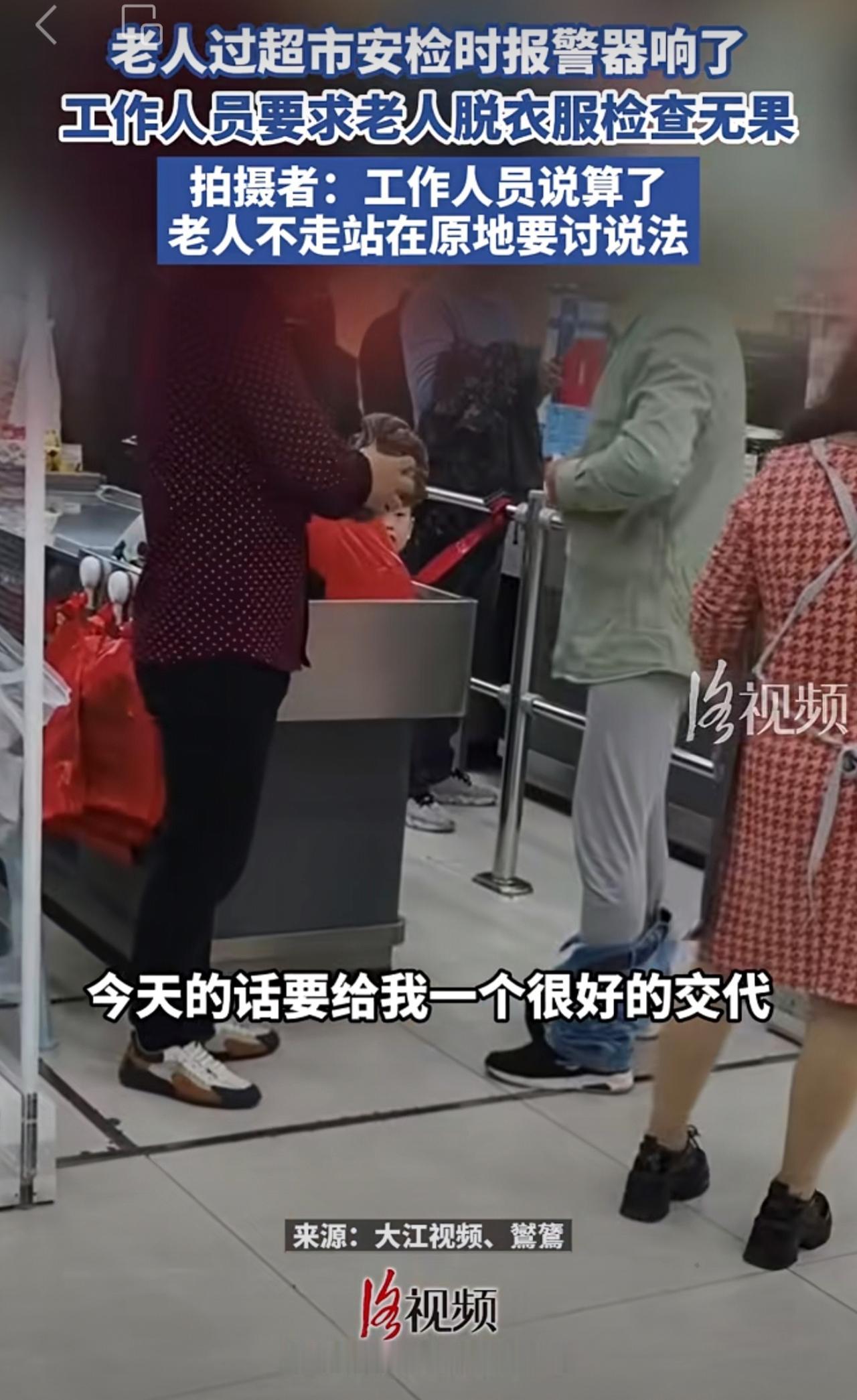 老人过超市安检时报警器响了,工作人员要求老人脱衣服检查无果。