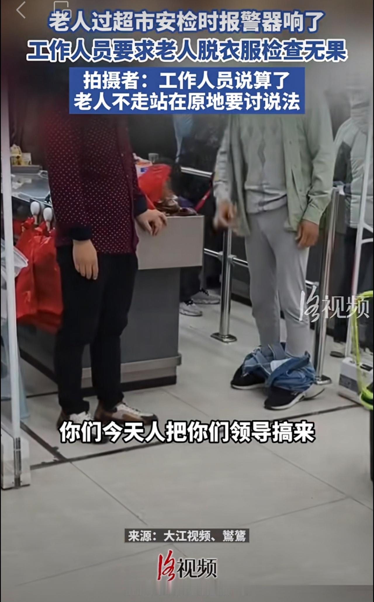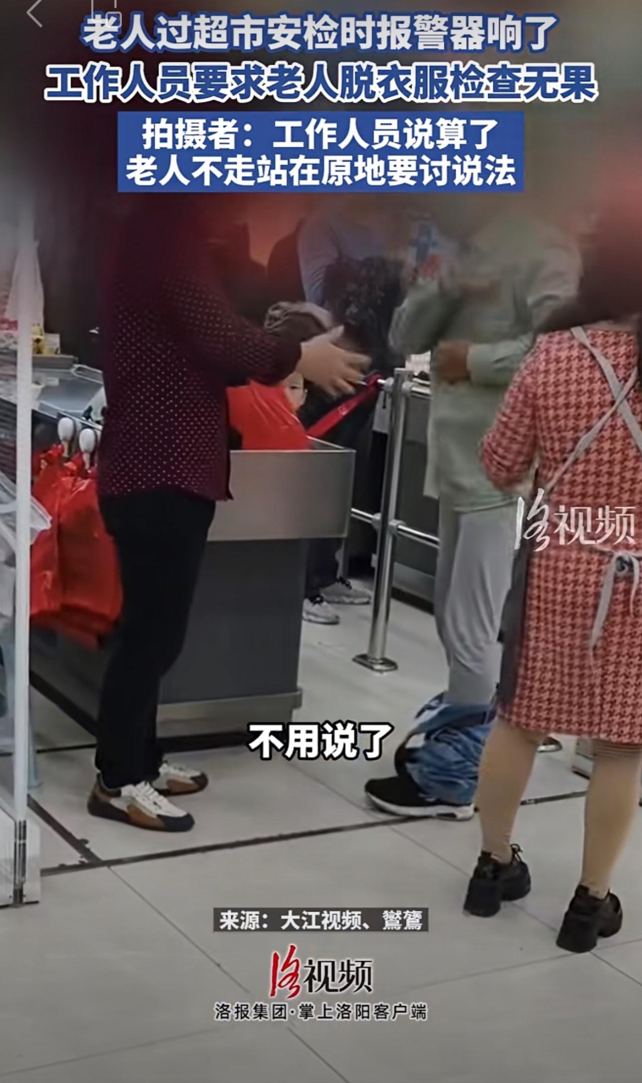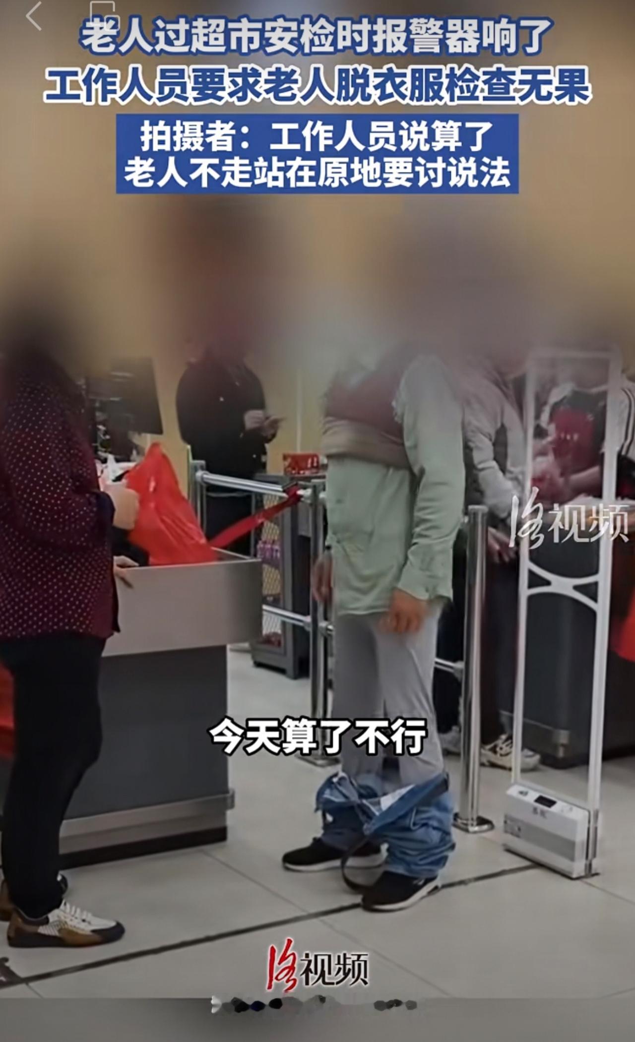 老人过超市安检时报警器响了,工作人员要求老人脱衣服检查无果。