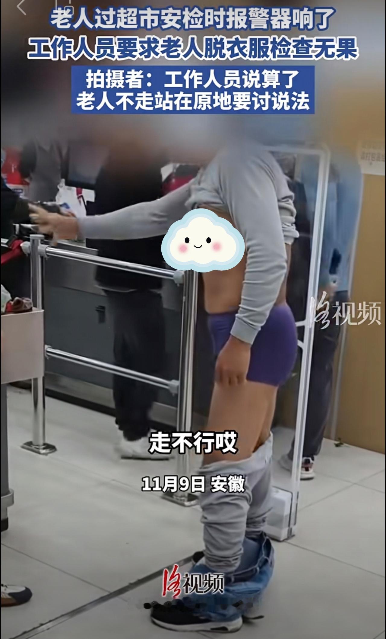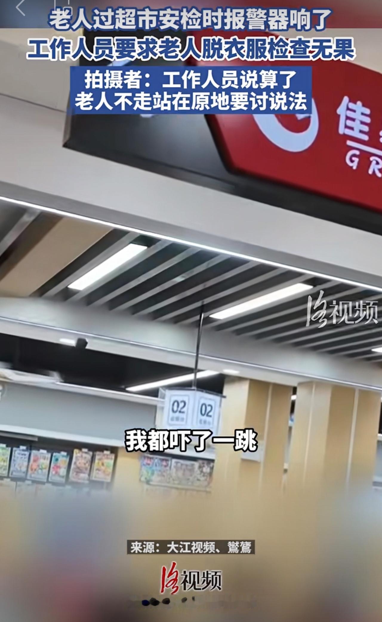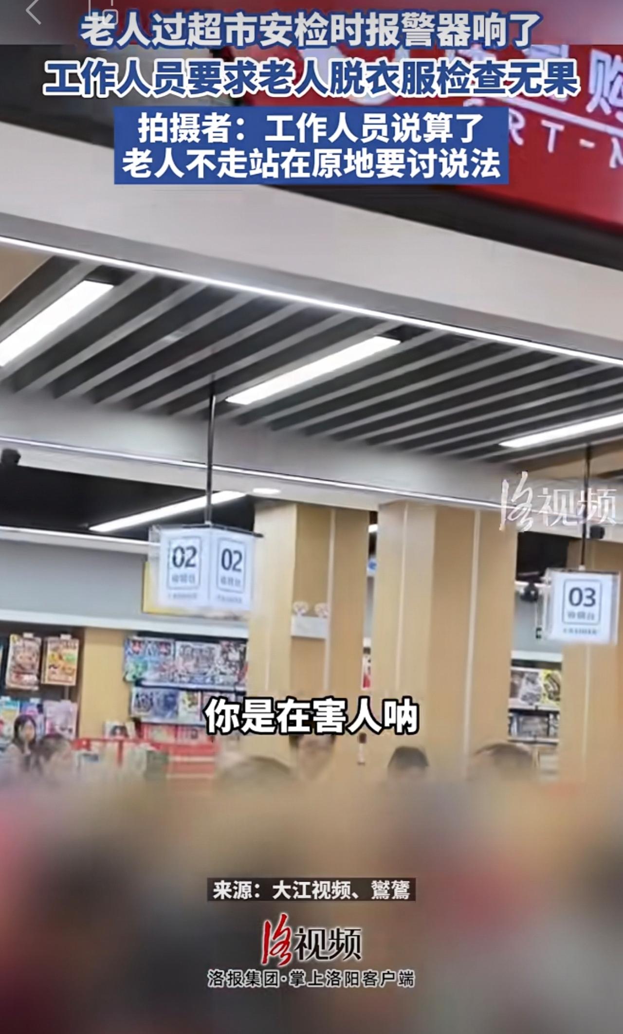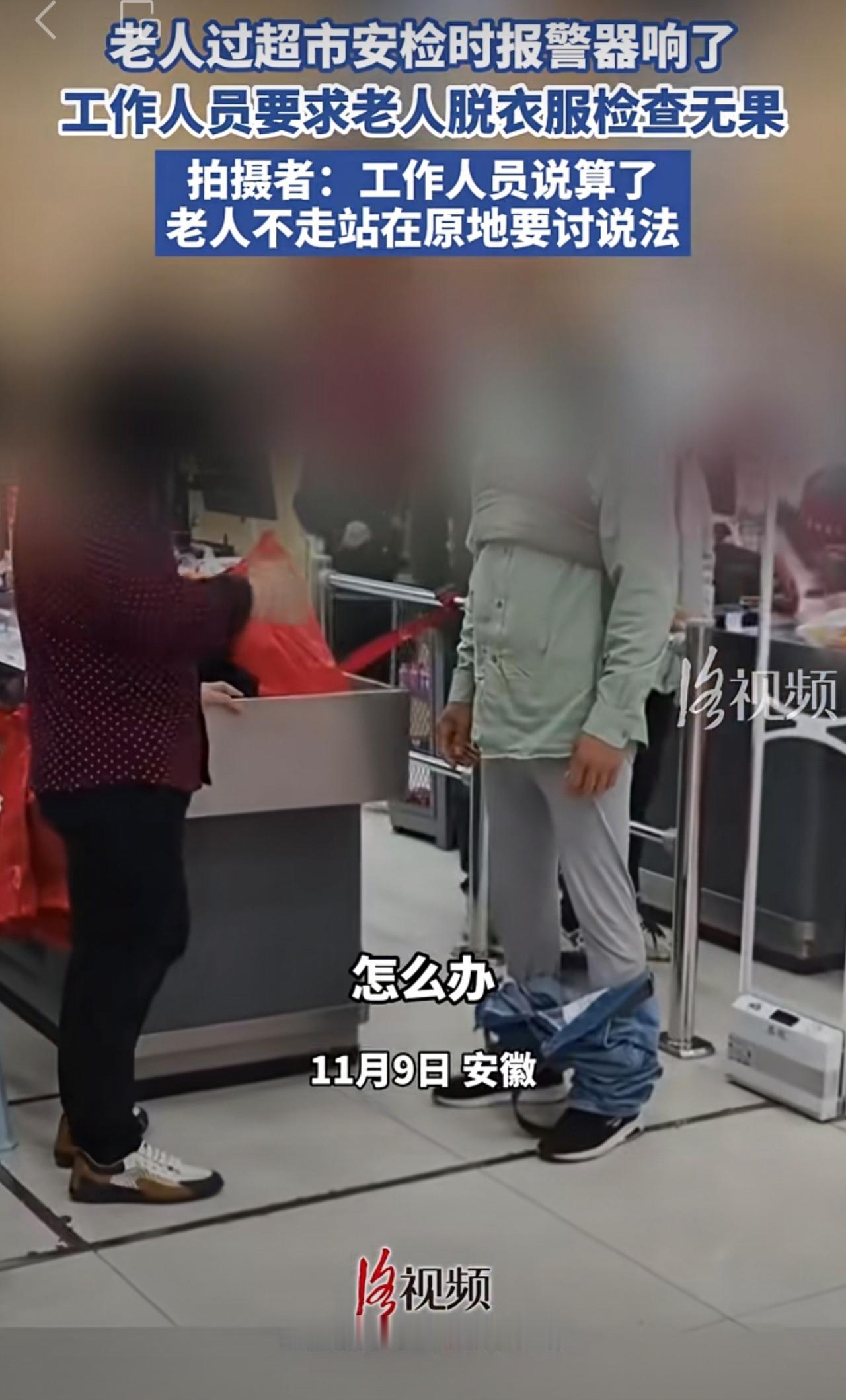 老人过超市安检时报警器响了,工作人员要求老人脱衣服检查无果。