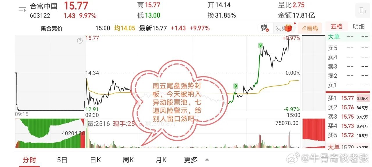 风口概念,龙头妖王,周四周五放巨量分歧,周五尾盘强势封板,超出预期的连板,今天被纳入异动股票池,太难了,大家开盘注意节奏,情绪不对就撤退。