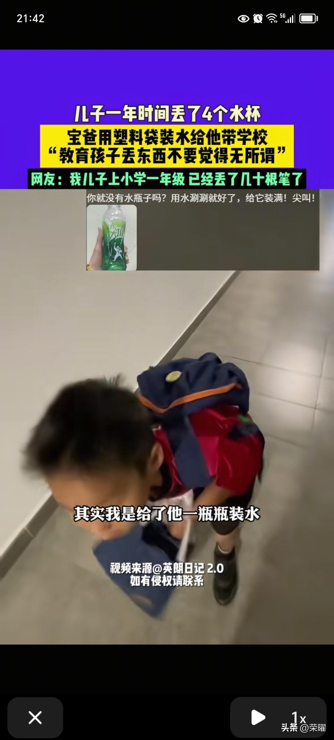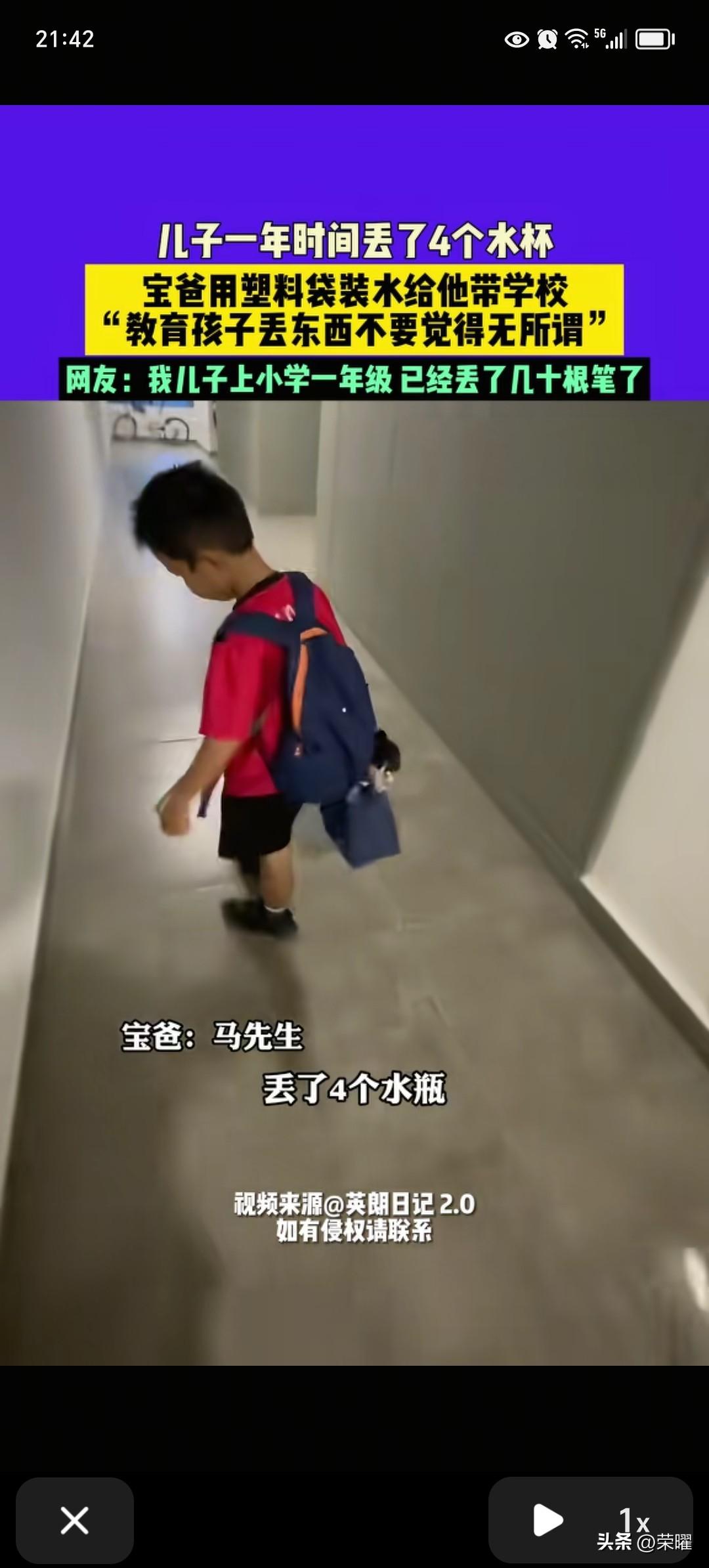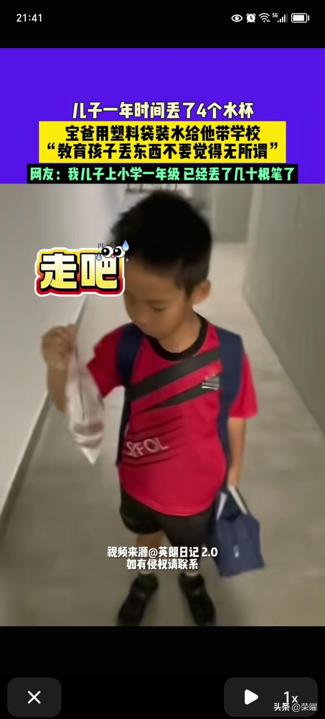 这简直 就是去搞物资捐赠啊! 水杯?丢4个 铅笔橡皮?按打丢 更狠的连鞋都能单飞一只 薛定谔的鞋 永远不知道放学回家是一双还是“孤勇者”。 爸爸用塑料袋装水, 用魔法打败魔法 你丢贵的,我给你用免费的。 丢了不心疼,主打一个接地气 既能降低损失,也能慢慢让娃儿明白 东西丢了,就得用不方便的代替。 让他慢慢学会珍惜。 养娃就像玩游戏,急也没用。 这些低成本的小惩罚,既可以让娃长记性,又没有很伤感情。 友友们,赞同这种做法吗? 小学生丢水杯 小学生捡到包