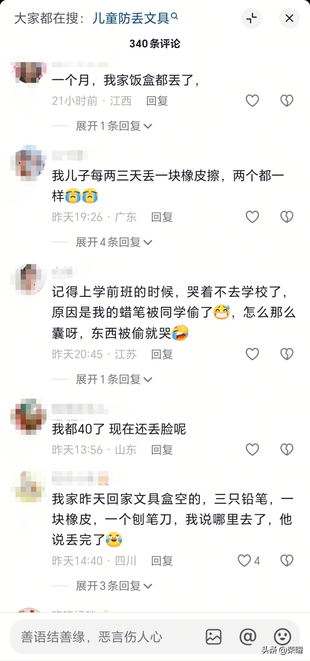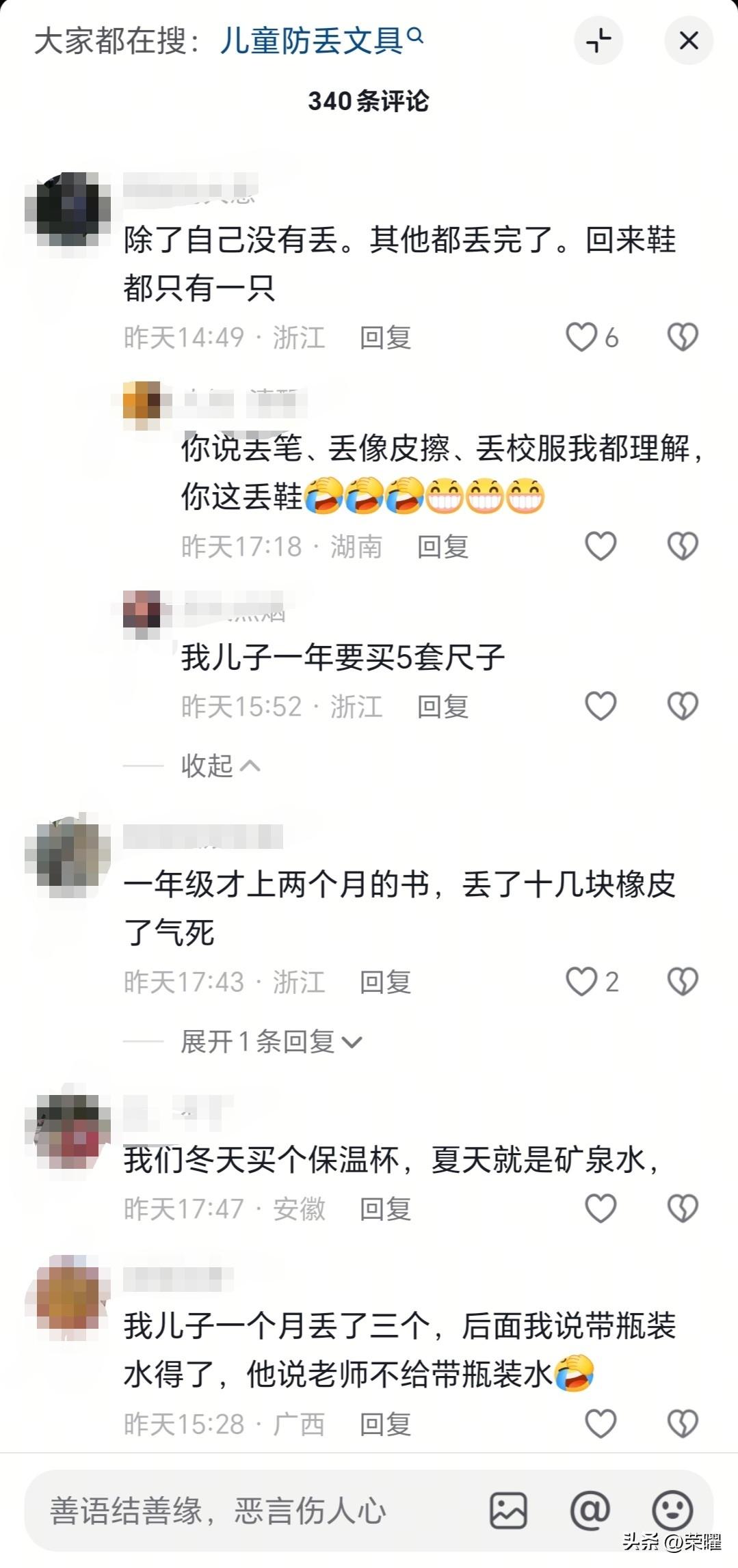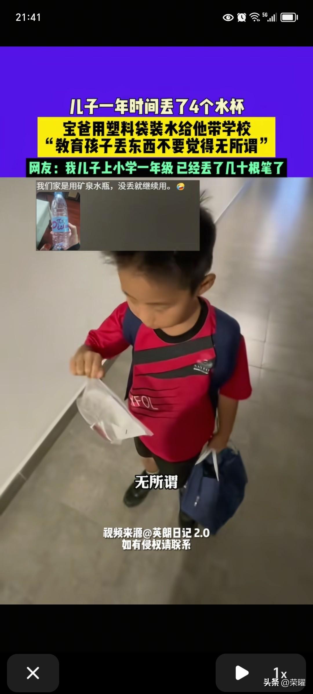 这简直 就是去搞物资捐赠啊! 水杯?丢4个 铅笔橡皮?按打丢 更狠的连鞋都能单飞一只 薛定谔的鞋 永远不知道放学回家是一双还是“孤勇者”。 爸爸用塑料袋装水, 用魔法打败魔法 你丢贵的,我给你用免费的。 丢了不心疼,主打一个接地气 既能降低损失,也能慢慢让娃儿明白 东西丢了,就得用不方便的代替。 让他慢慢学会珍惜。 养娃就像玩游戏,急也没用。 这些低成本的小惩罚,既可以让娃长记性,又没有很伤感情。 友友们,赞同这种做法吗? 小学生丢水杯 小学生捡到包