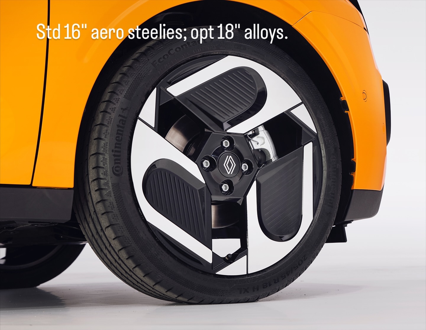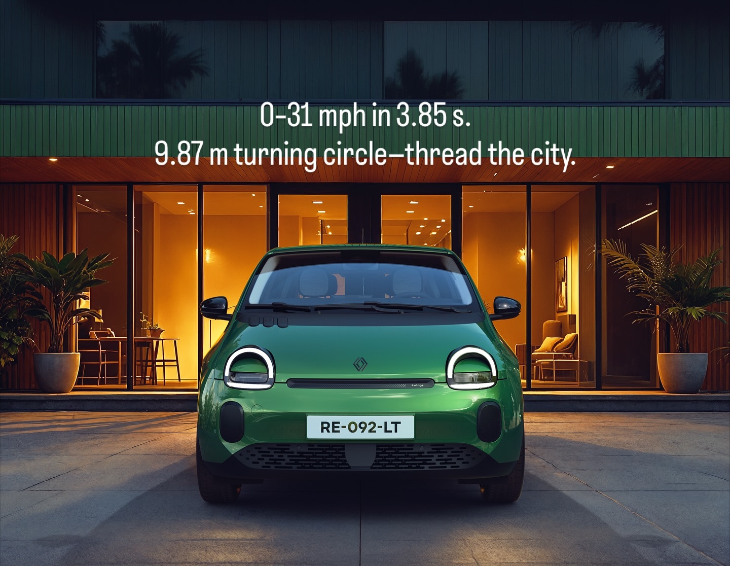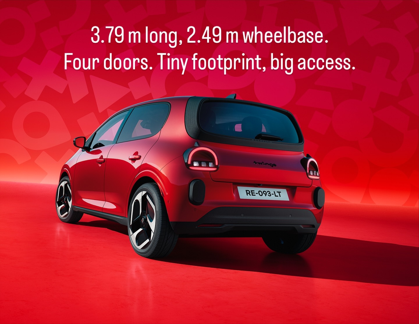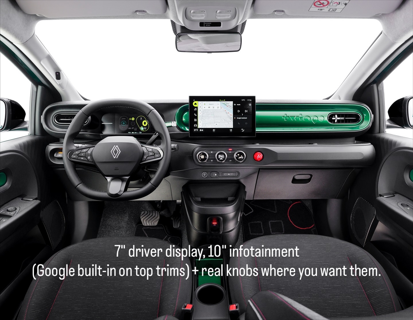 Twingo建在AmpR小平台上(如R5/R4),使用27.5千瓦时的LFP电池和80bhp电机前面。简称是纯城市:3.85秒0-31英里每小时,一个紧的9.87米转弯圈,WLTP范围163英里。充电标准为6.6千瓦交流调(墙箱内~4小时15度10-100%),可选择11千瓦交流调加50千瓦直流切割10-80%至30分钟。